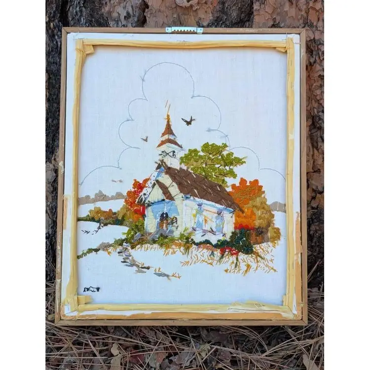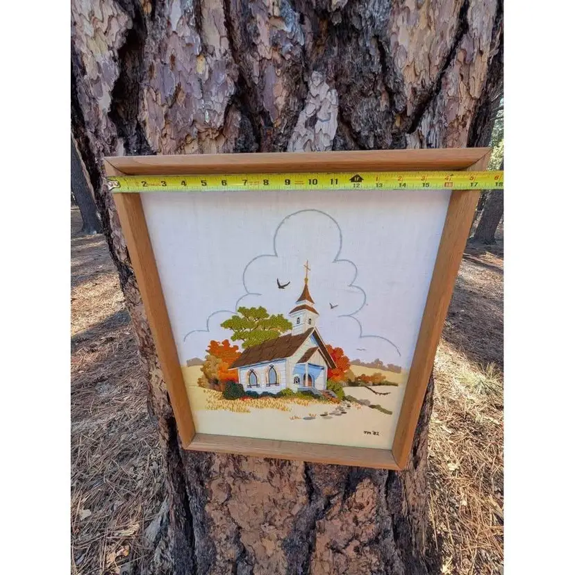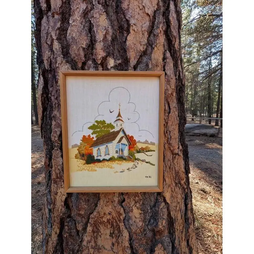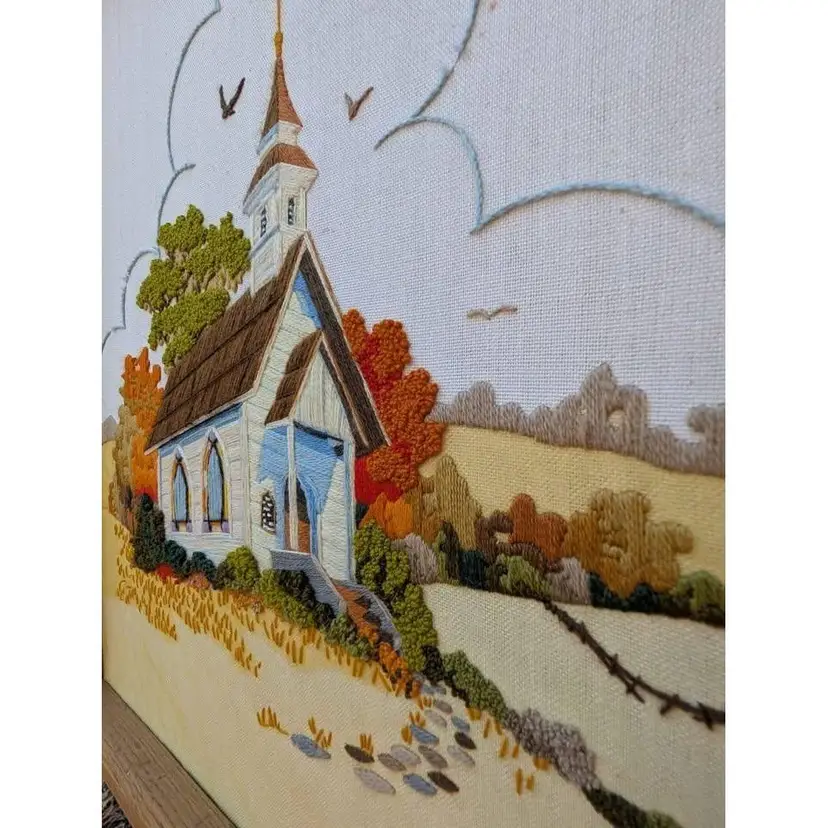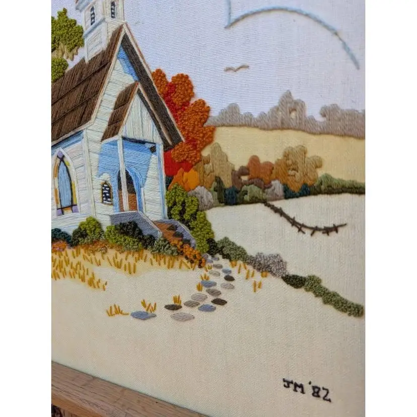 Vintage framed needlepoint sunset stitchery country church. This completed framed needlepoint is gorgeous - the colors, textures and details are awesome! This is initialed "JM" and dated 1982. This is approximately 17x21 and would make an amazing addition to any gallery wall. Overall excellent condition, the only notable imperfection is in the bottom left hand corner some of the tulle is peeling back as shown in photos.