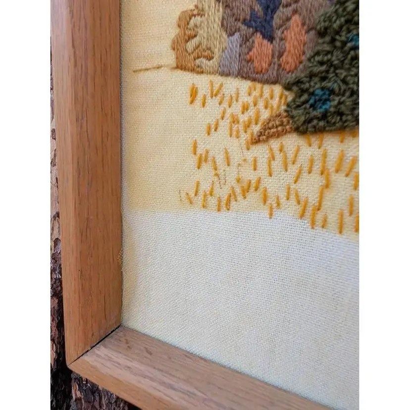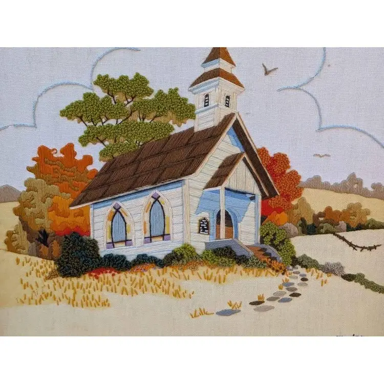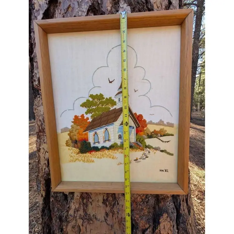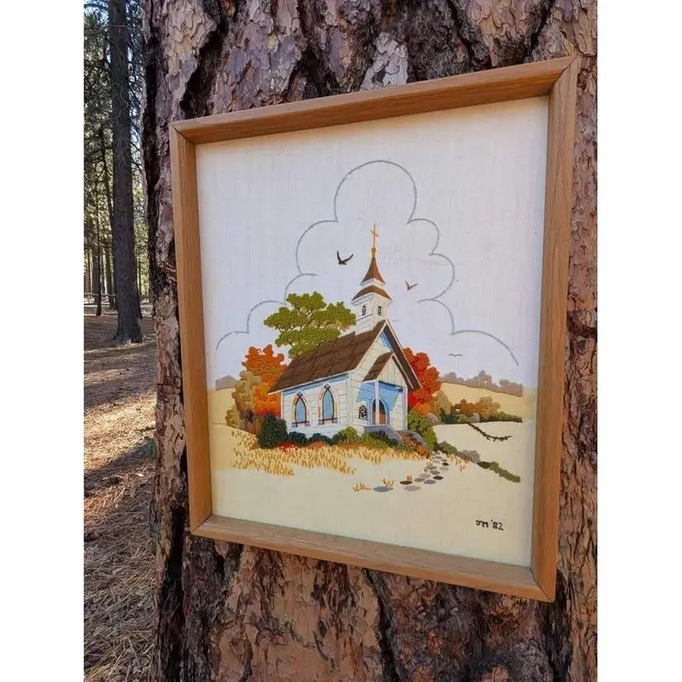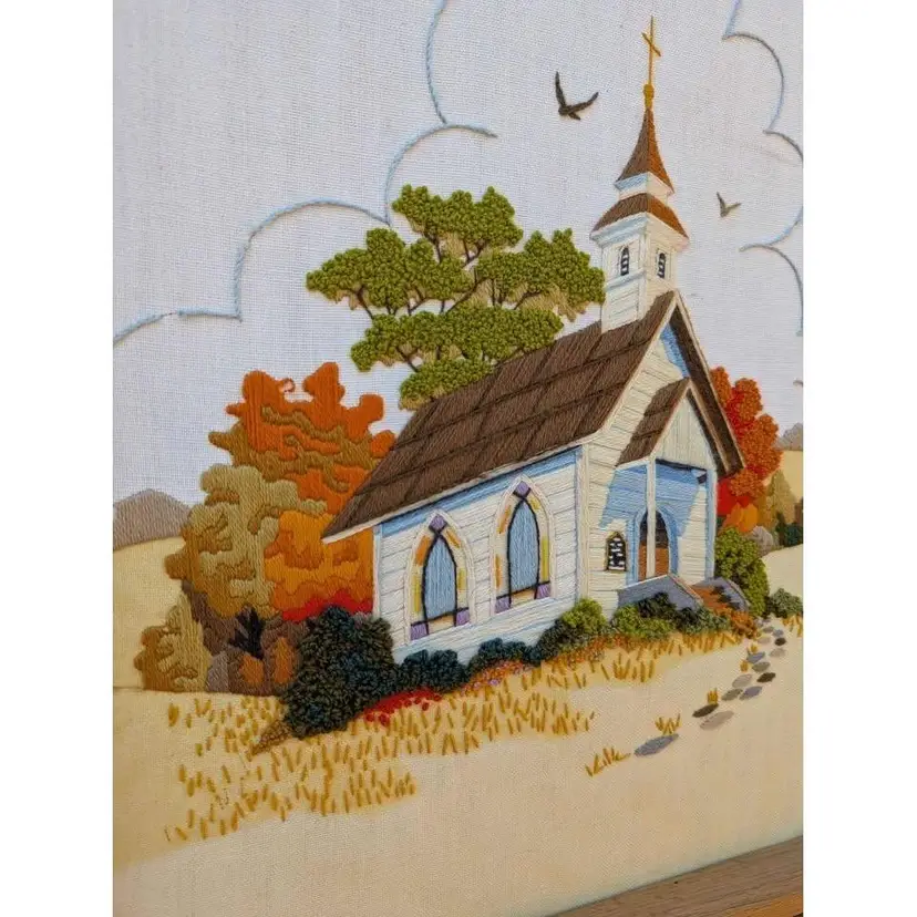 Vintage framed needlepoint sunset stitchery country church. This completed framed needlepoint is gorgeous - the colors, textures and details are awesome! This is initialed "JM" and dated 1982. This is approximately 17x21 and would make an amazing addition to any gallery wall. Overall excellent condition, the only notable imperfection is in the bottom left hand corner some of the tulle is peeling back as shown in photos.