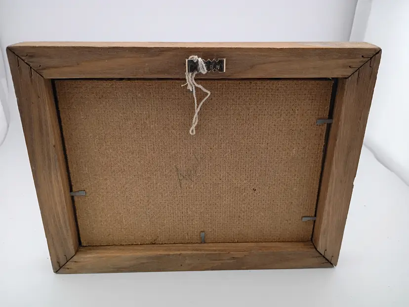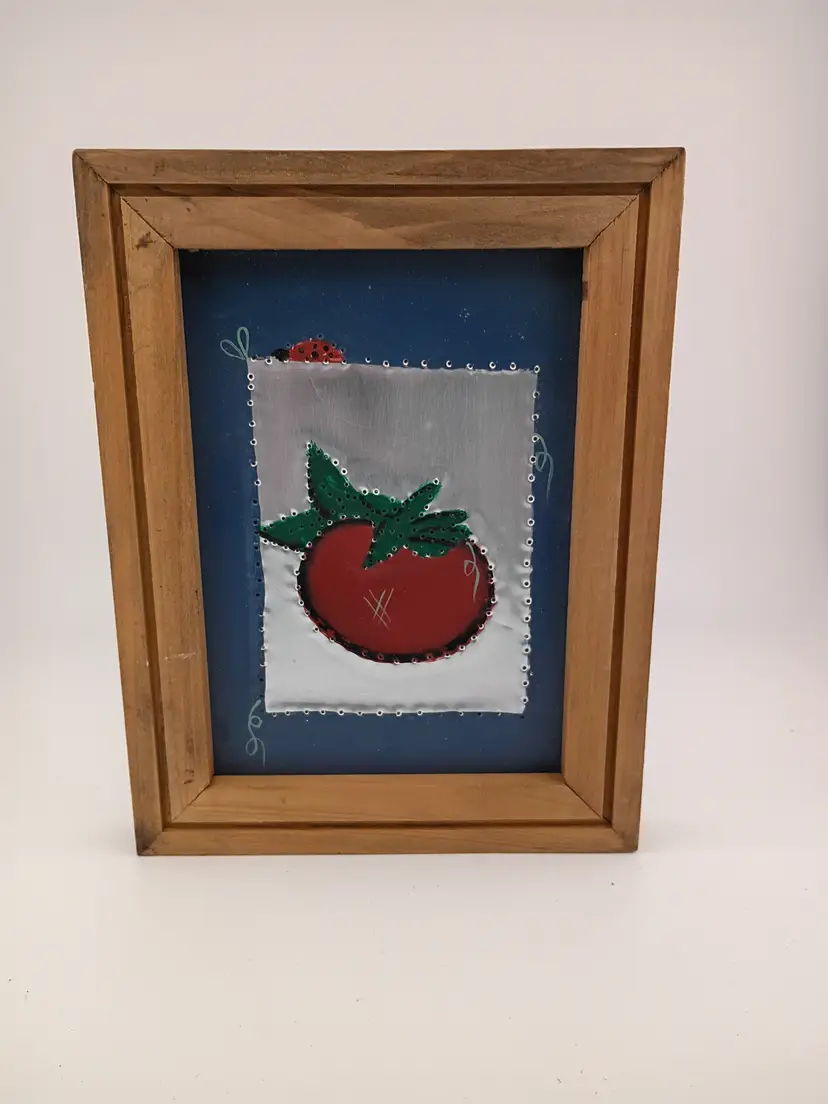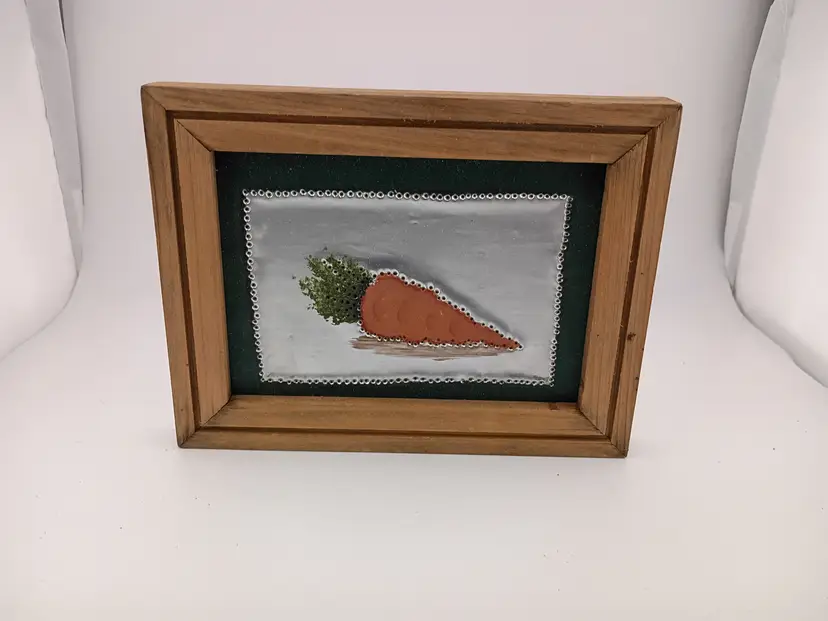 It's an adorable set of three framed painted tin art pieces--an apple, a carrot, and a tomato--signed by the artist They are in excellent vintage condition.