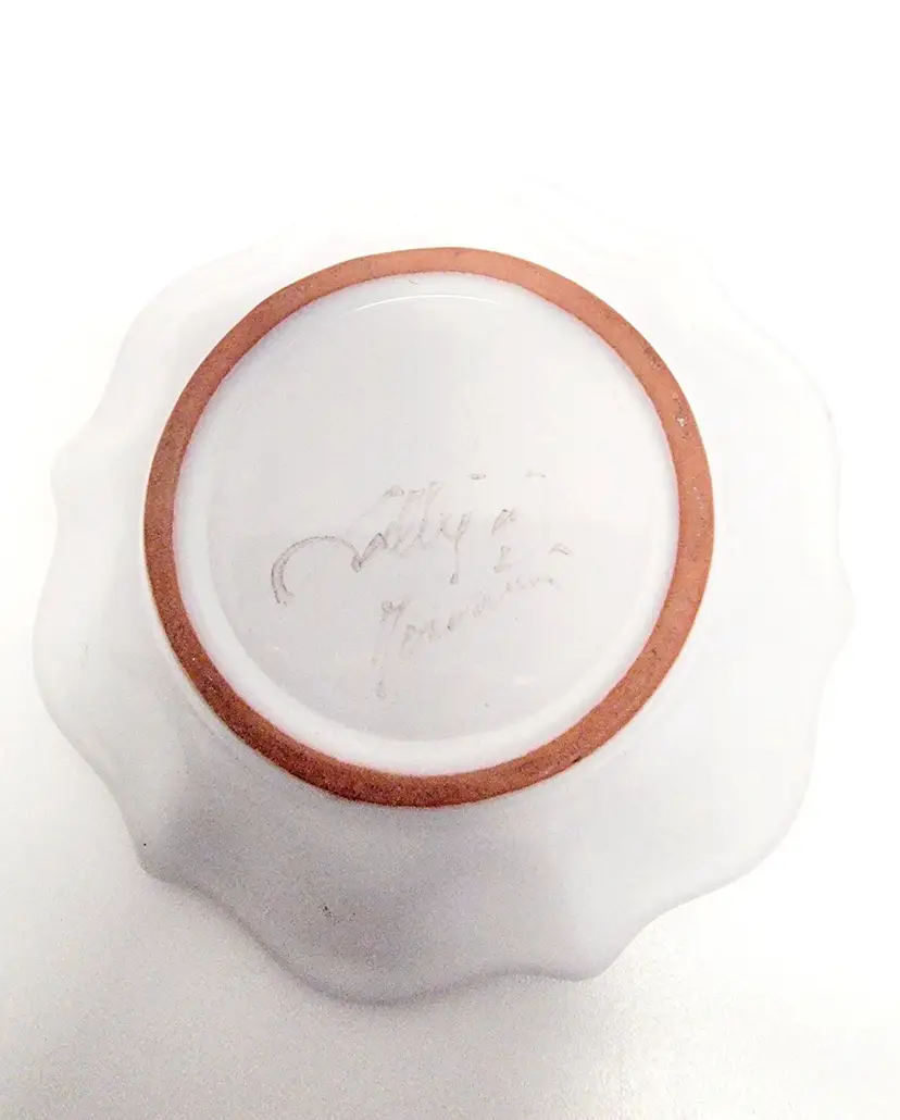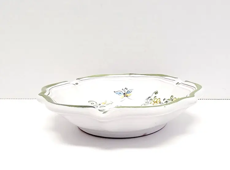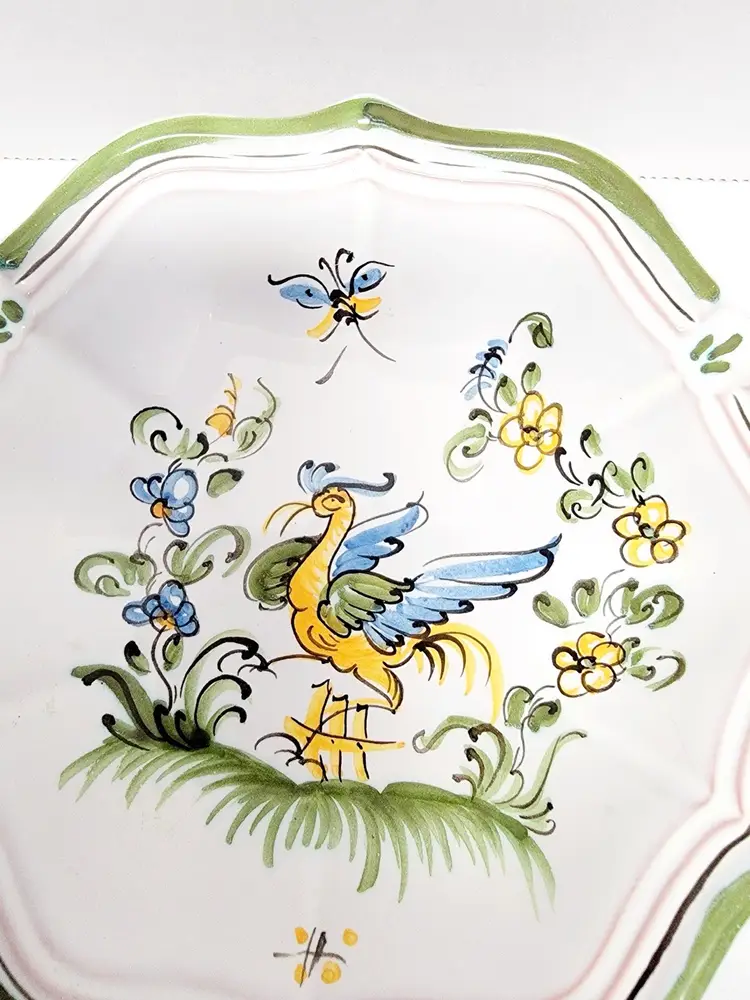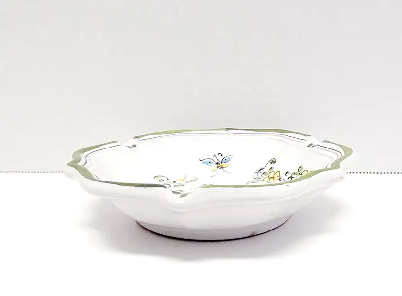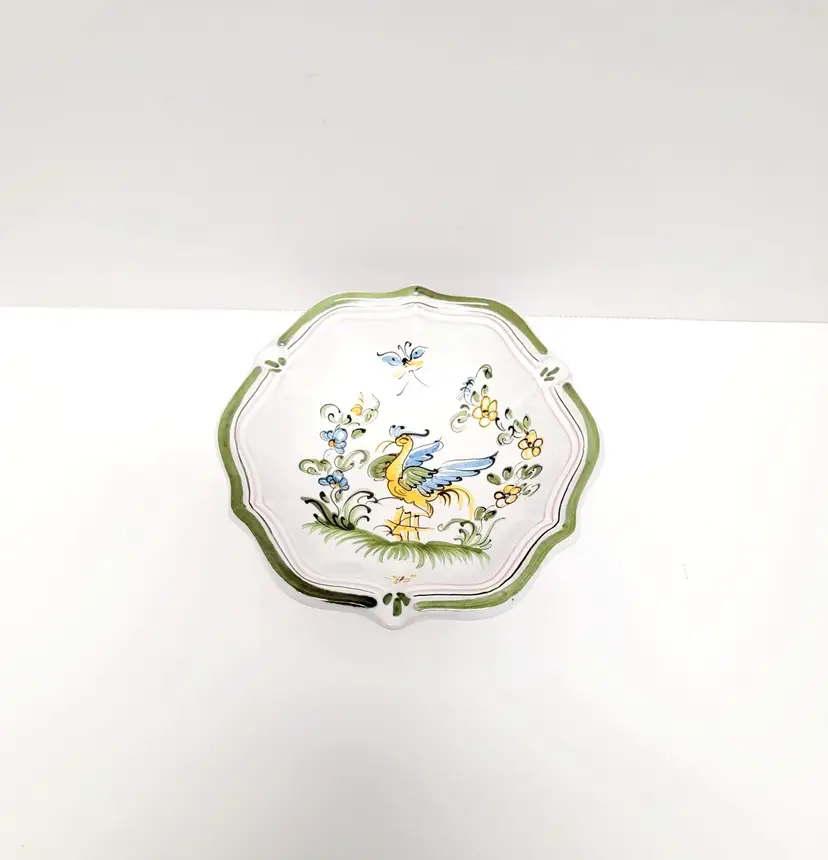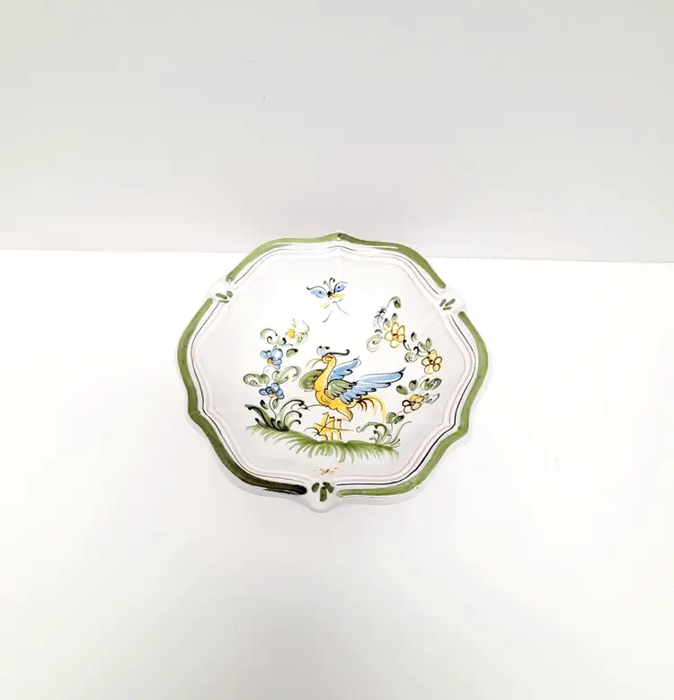 Vintage French moustiers earthenware hand painted ashtray/trinket dish. Hand painted bird, butterfly and flowers. Yellow, green and blue with green trim. Artist signed. Vintage condition, as seen in photos.
