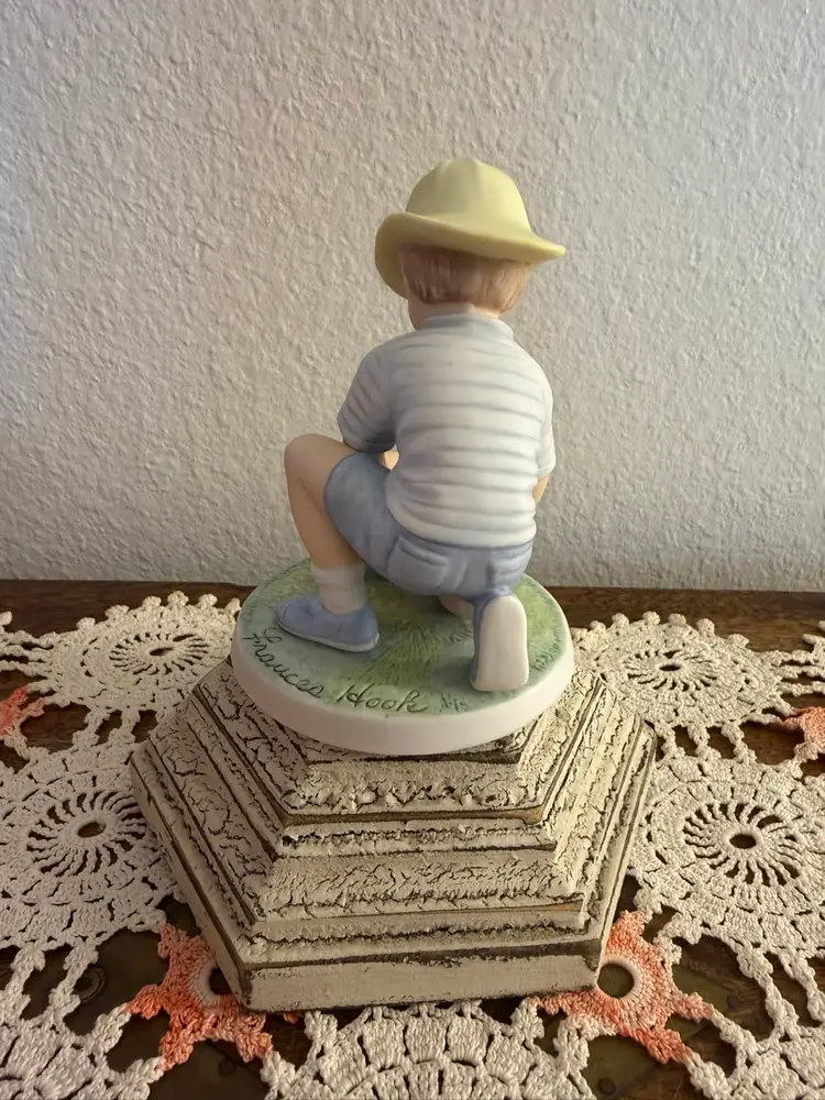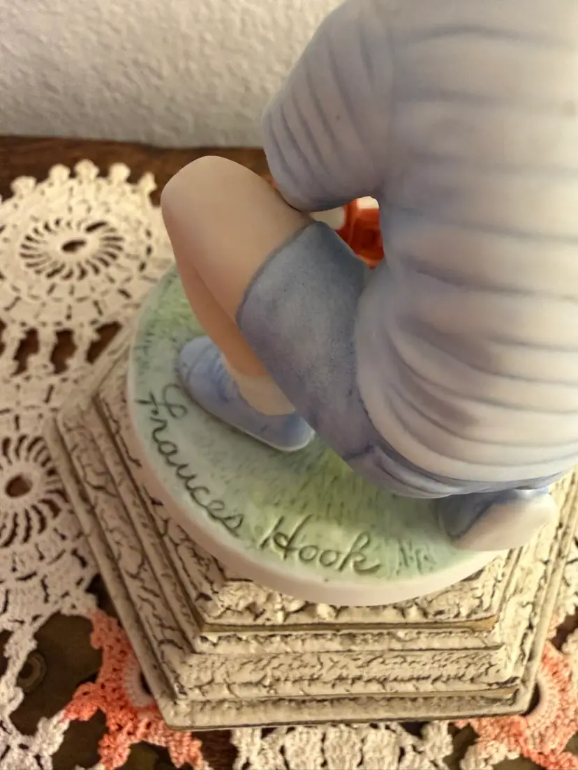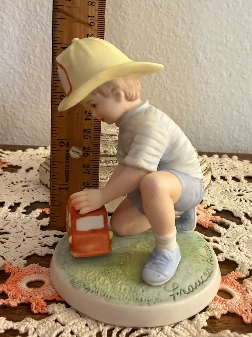 The Vintage Frances Hook Engine #1 Hand Painted Porcelain Figurine is a limited edition collectible depicting a child's life and featuring a firefighter theme. Hand painted with a matte finish, this multicolored figurine is part of the Ceramica Excelsis collection by Roman, Inc. Made in Mexico in the 1980s.