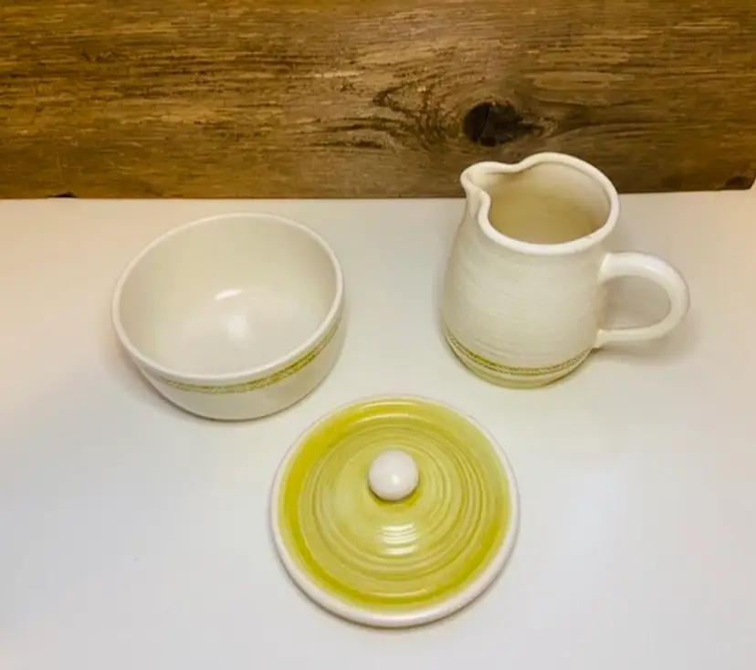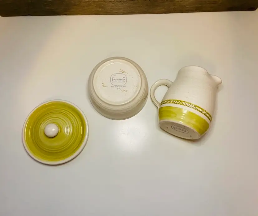 Pre-owned Hacienda Gold Pattern Creamer and Sugar Set. Made by Franciscan Earthenware, 1960s. In good used condition. No chips or cracks.