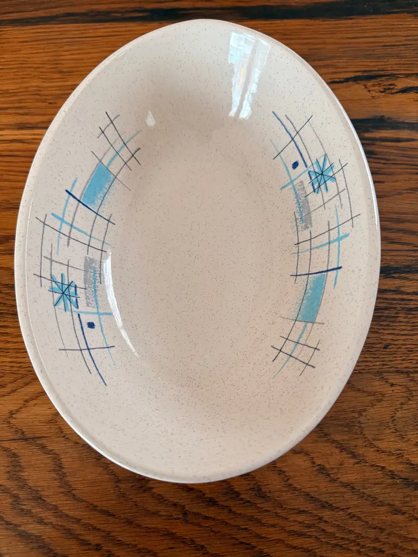Add a classic mid-century modern touch to your table with this vintage Franciscan Starburst oval serving bowl, one of the most recognizable atomic-era patterns produced in the 1950s. Featuring the iconic blue, aqua, and gray starburst design on a speckled cream earthenware background, this piece perfectly captures the retro charm of the atomic age.