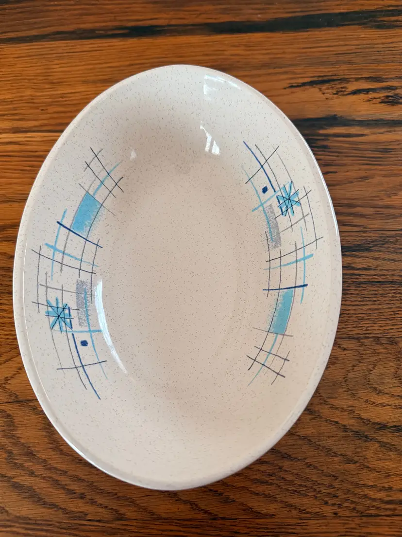 Details: Maker: Franciscan Earthenware Pattern: Starburst (Atomic Starburst) Made in USA Circa: 1950s Size: approximately 8.5 inches long x 6 inches wide Color: Cream speckled glaze with blue and aqua atomic starburst design