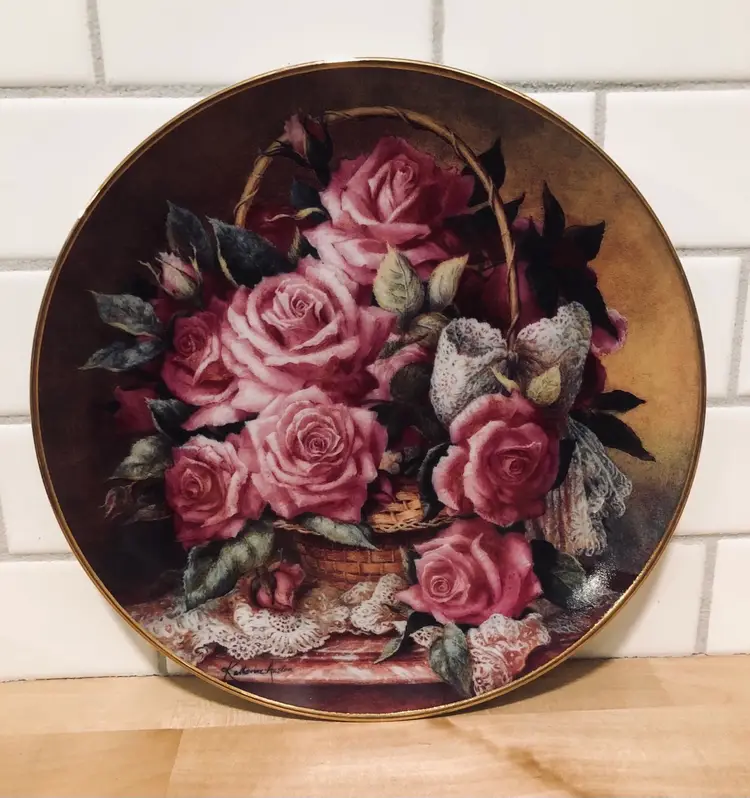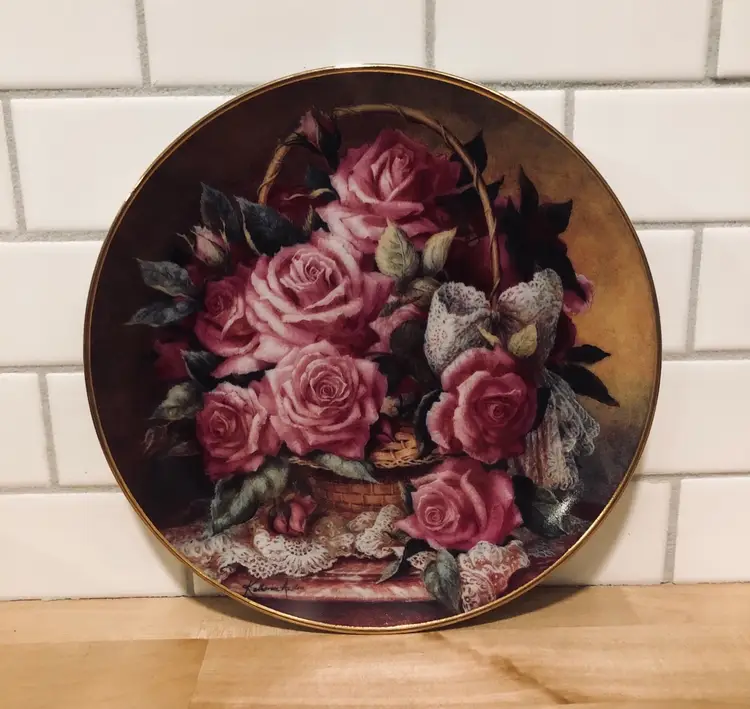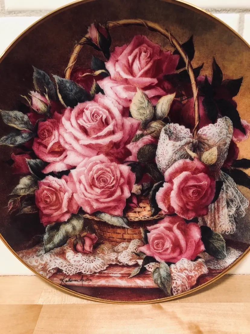 This gorgeous decorative plate made by the Franklin Mint, features the most lovely art by Katherine Austen. Such attention to detail.. with 22 k gold around the rim, would look beautiful with your boho decor. I like to set little clear glass bottles filled with water and starter plants on these beautiful old plates. (See photo) :) It measures approximately 8” in diameter.