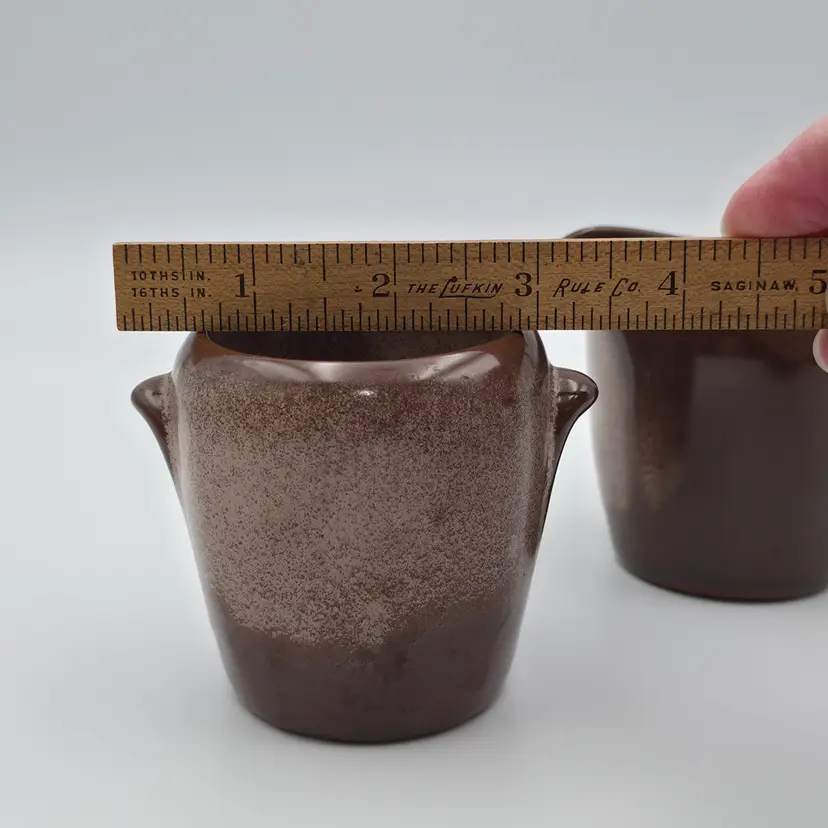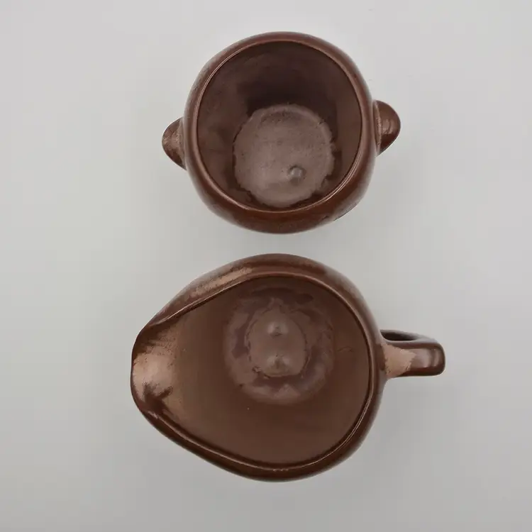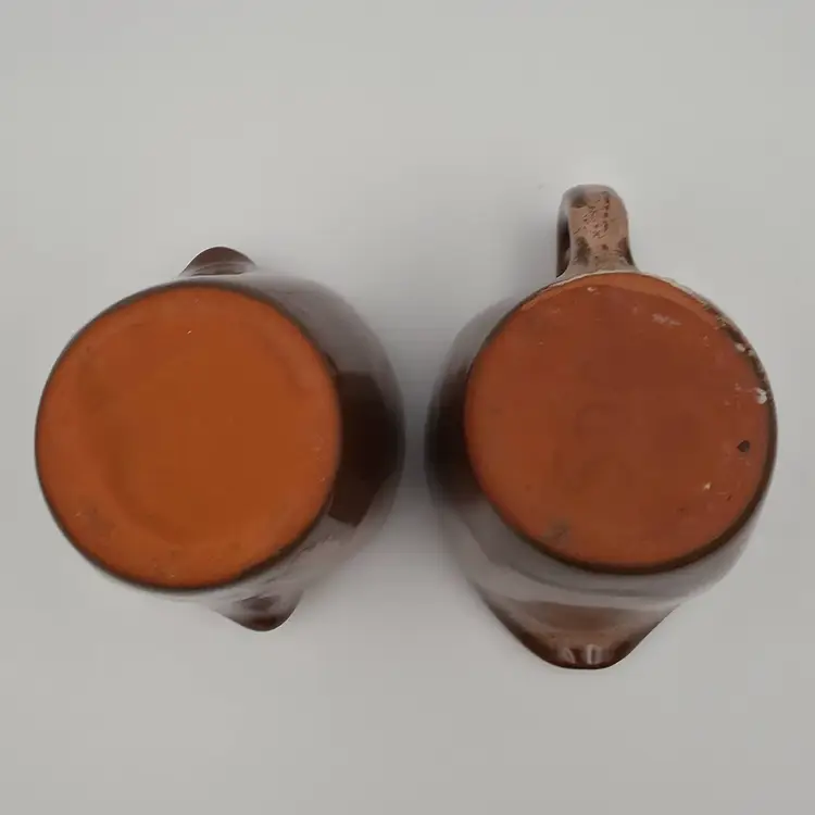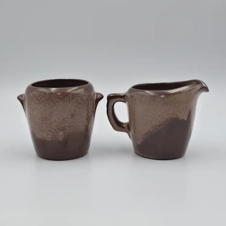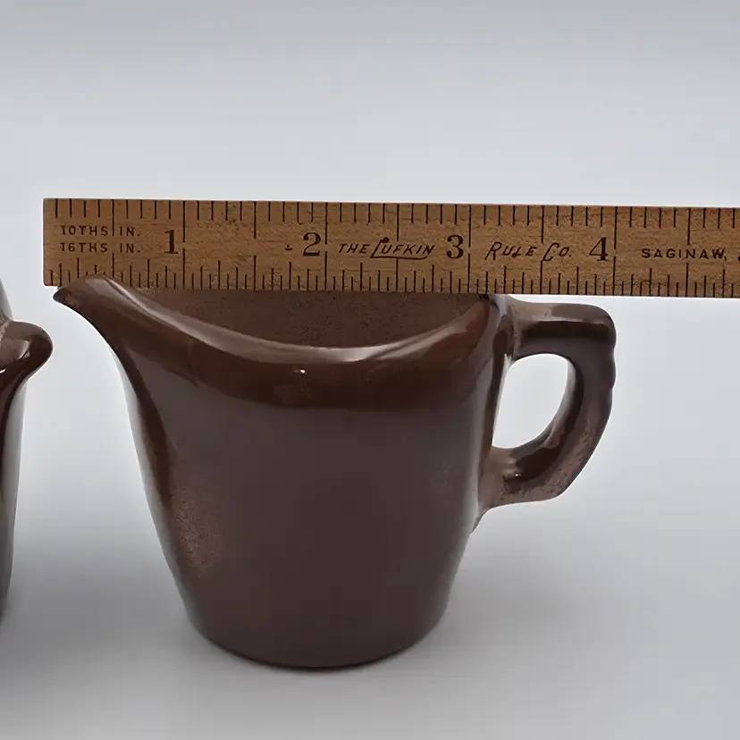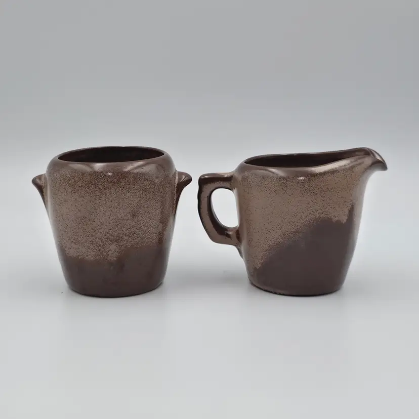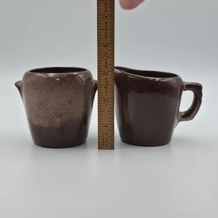 The creamer is marked on the bottom with 5DA. No markings on the sugar. They are in good used condition. The creamer has a spot on the bottom that looks as though excess glaze was ground off. Otherwise no chips or cracks. Measurements- Creamer - 3 inches tall and 4.25 inches wide including spout and handle. Surgar- 3 inches tall and 3.5 inches wide including handles. Thank you for looking and have a great day.
