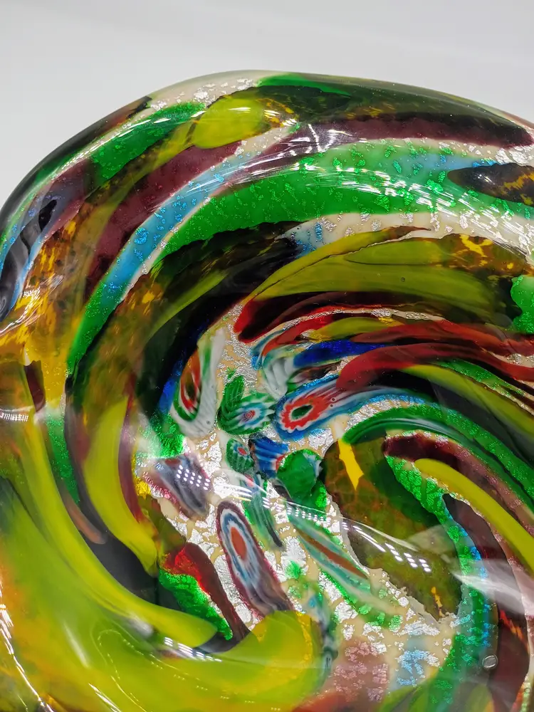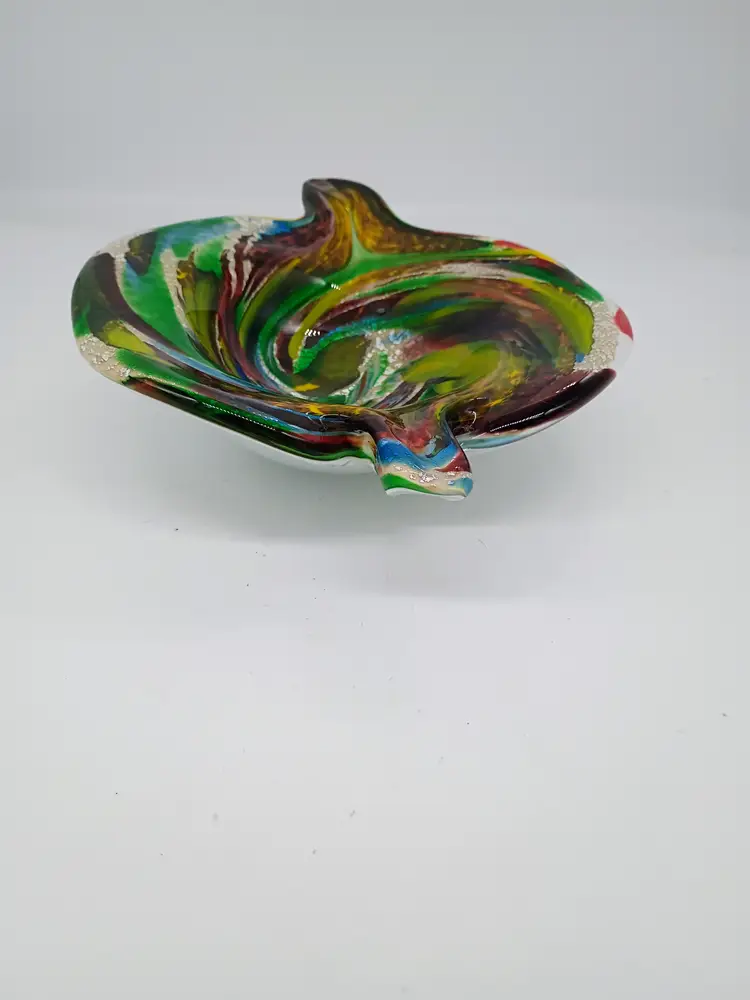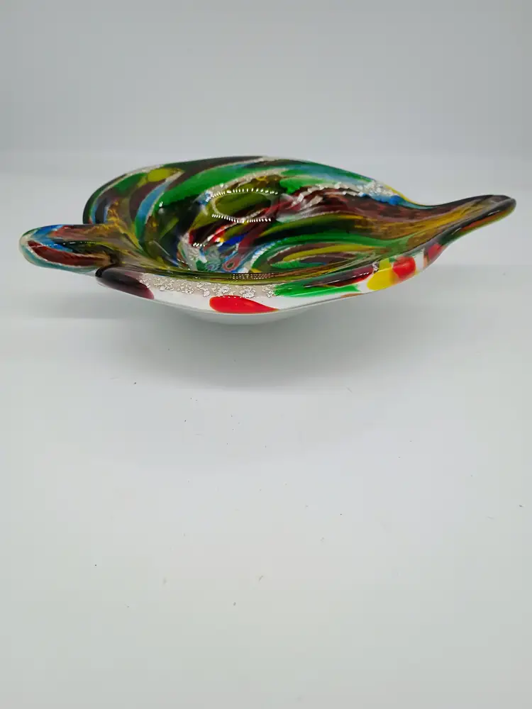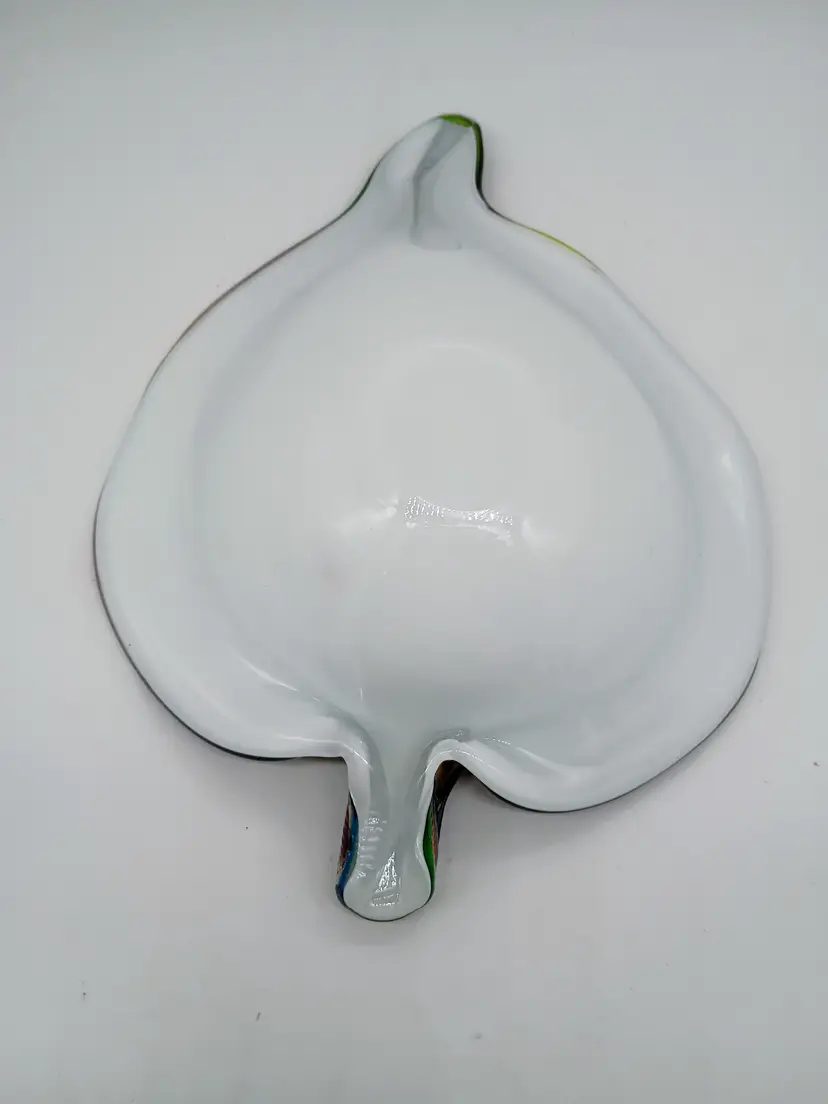 Vintage Fratelli Torso attributed Murano Multicolored Swirl Also Called Tutti Fruiti Art Glass Leaf Shaped Candy Dish 11 In long 9 inches wide and 3 inches tall. Solid heavy well made hand blown glass smooth clear circular pontil. Cased in white glass .This is preowned. It has no chips cracks or flea bites, Silver aventurine mixed into colors. Cased white Excellent used condition. This is attributed to Fratelli Torso thru research and multiple similar comps. Ships USPS domestically and UPS to Canada, and worldwide is USPS International