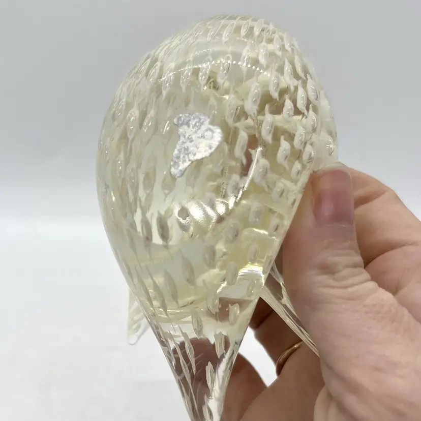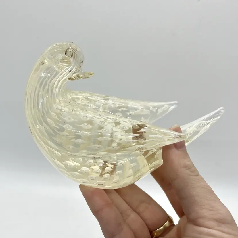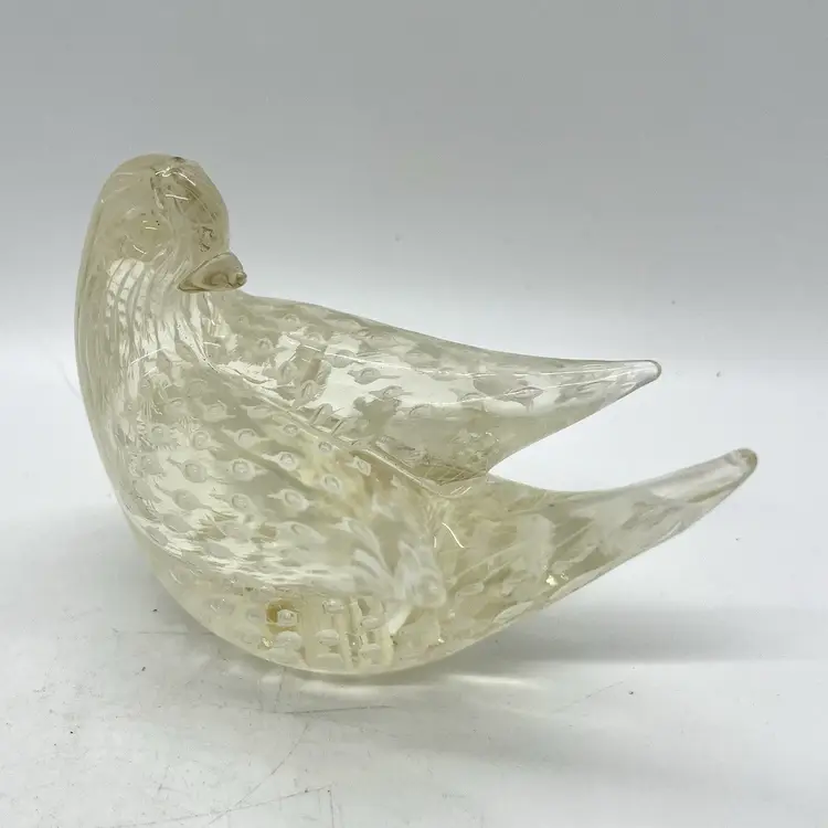 This is a vintage Murano glass dove or love bird figurine/paperweight. Sticker attributes this piece to Fratelli Toso. Has stretched bullicante or controlled bubbles all throughout. Partial sticker on the bottom, no damages. Measures about 4.75" long and 3.25" tall.