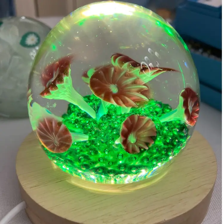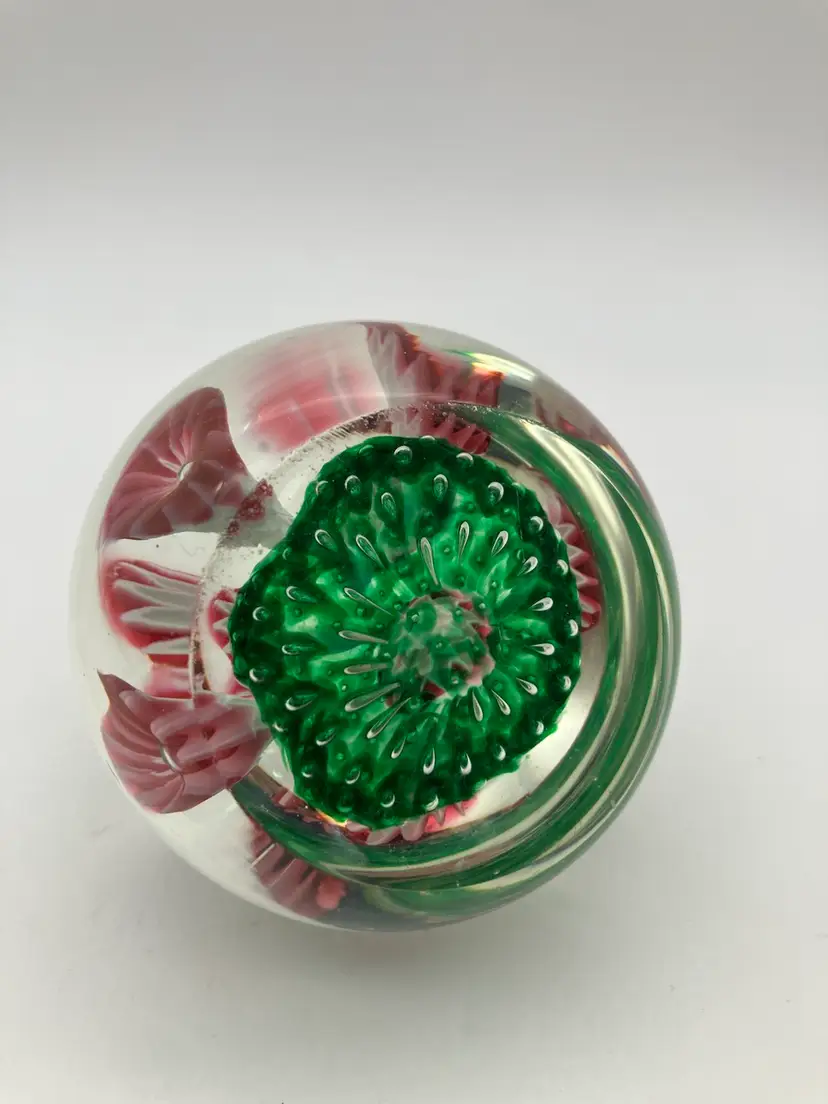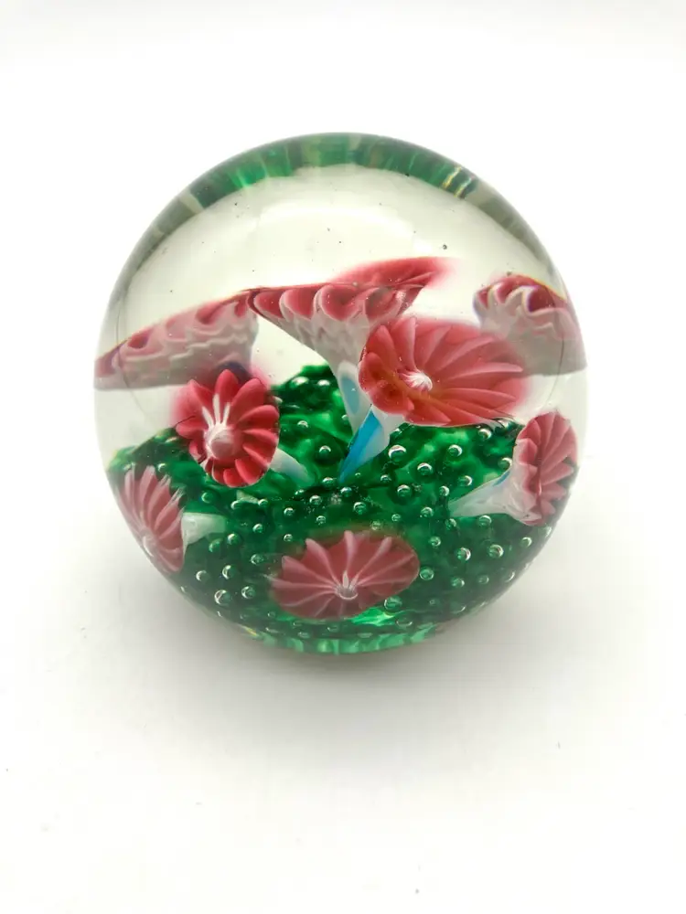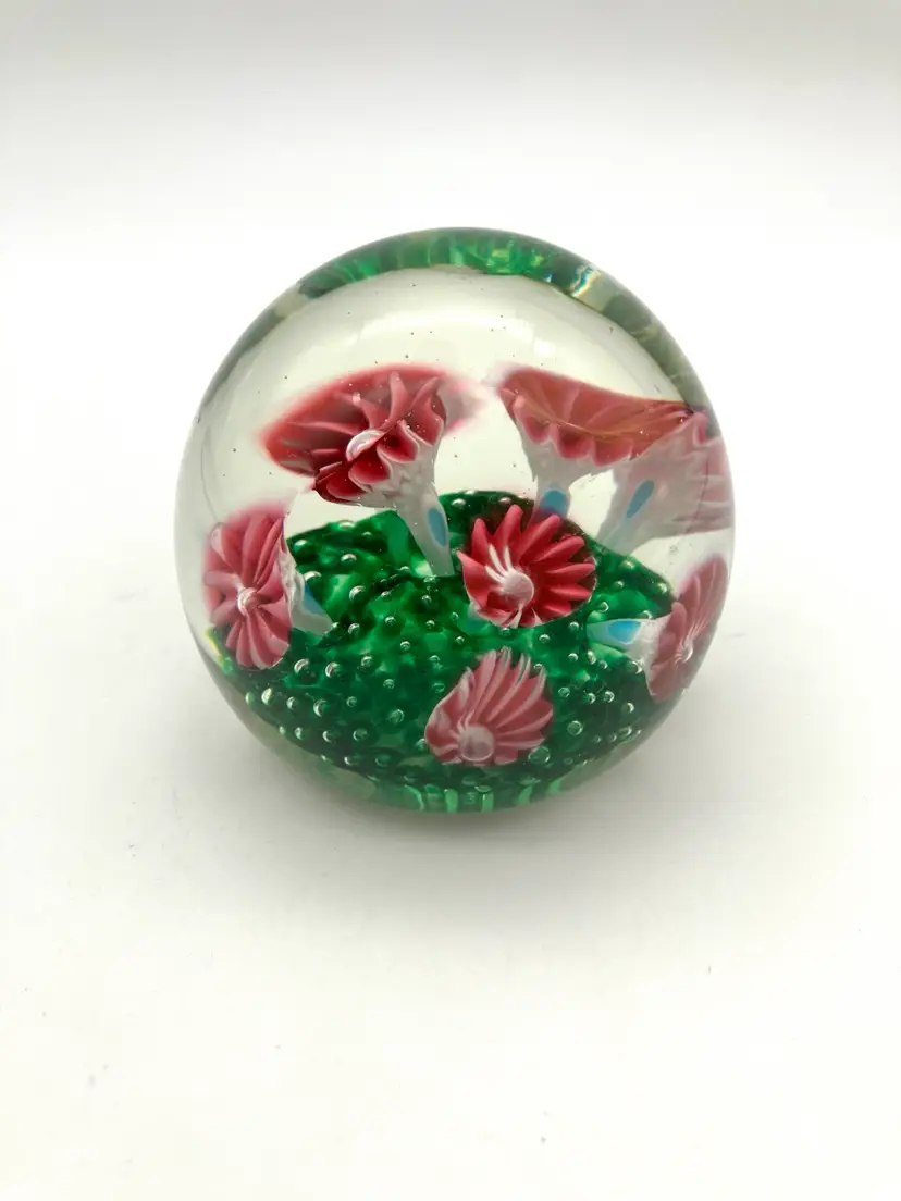 Excellent condition. Measures 3” diameter and 2.5” tall. Eight flowers in a green bubbly garden.