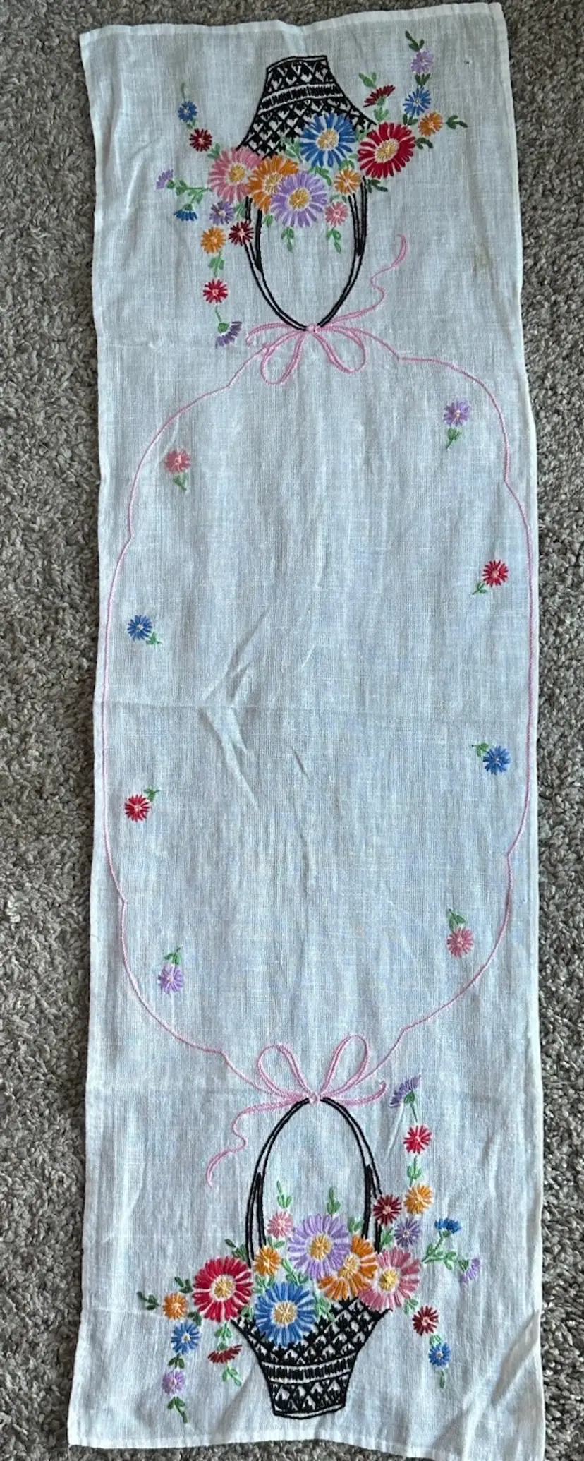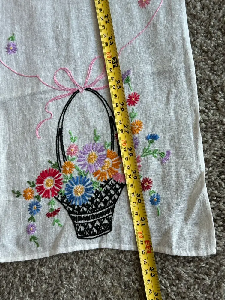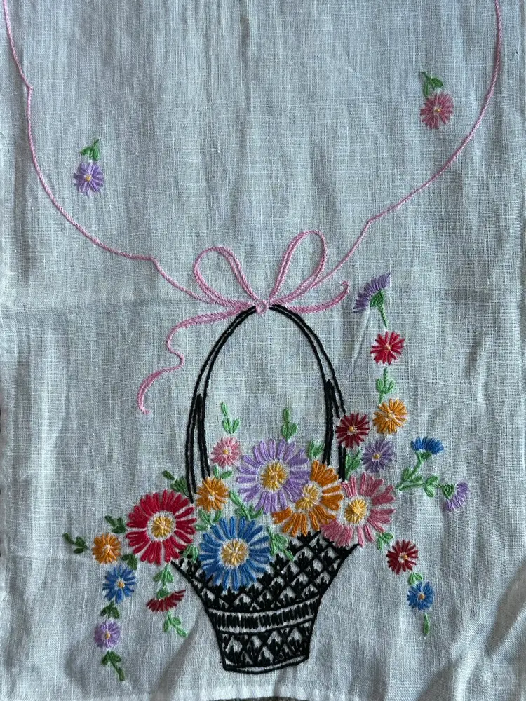THE HAND EMBROIDERED DESIGN REPRESENTS A BASKET WITH ROSES, OTHER FLOWERS AND LEAVES