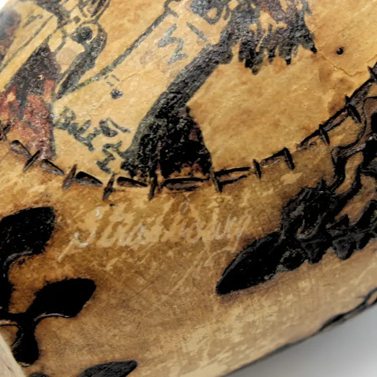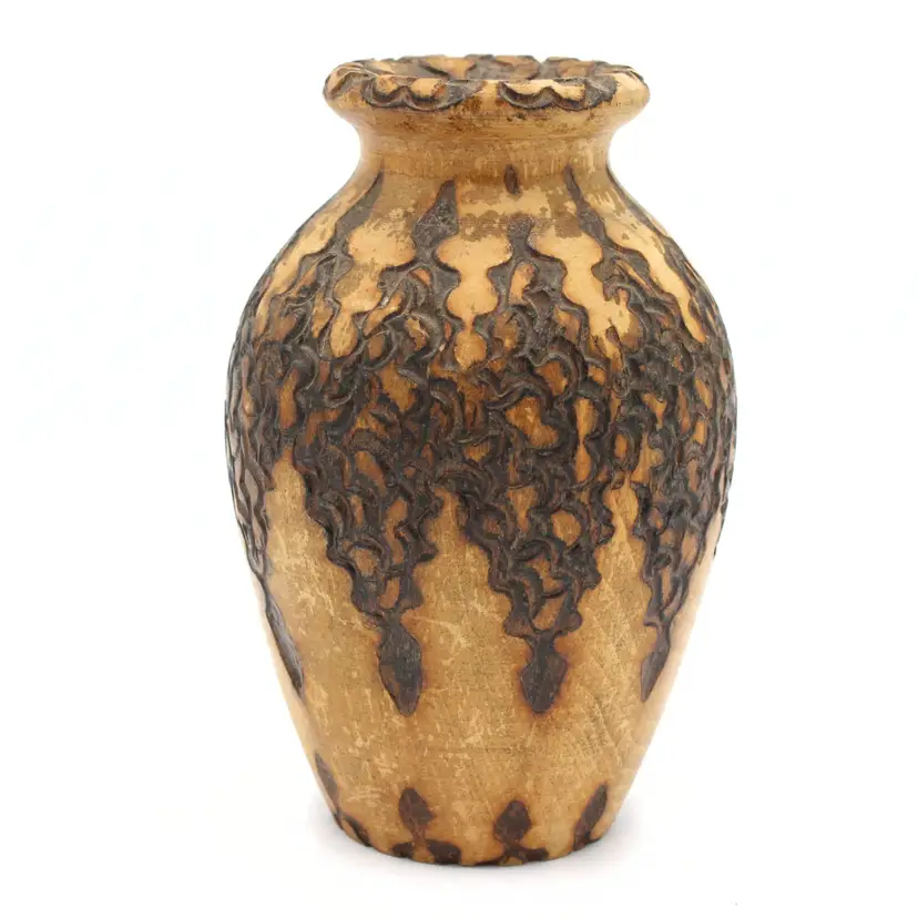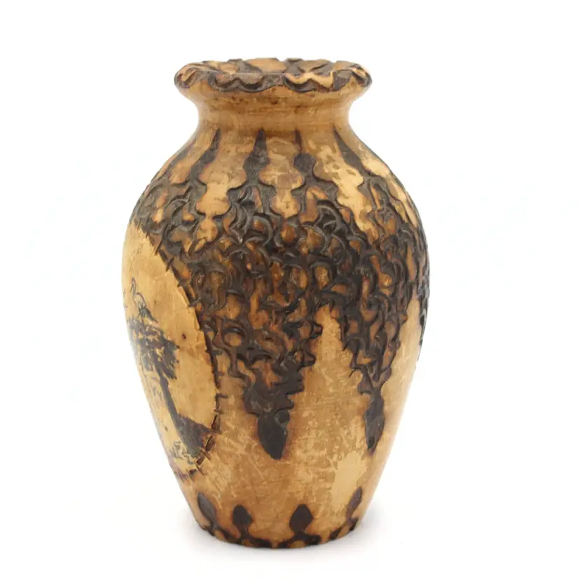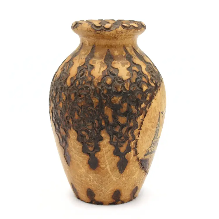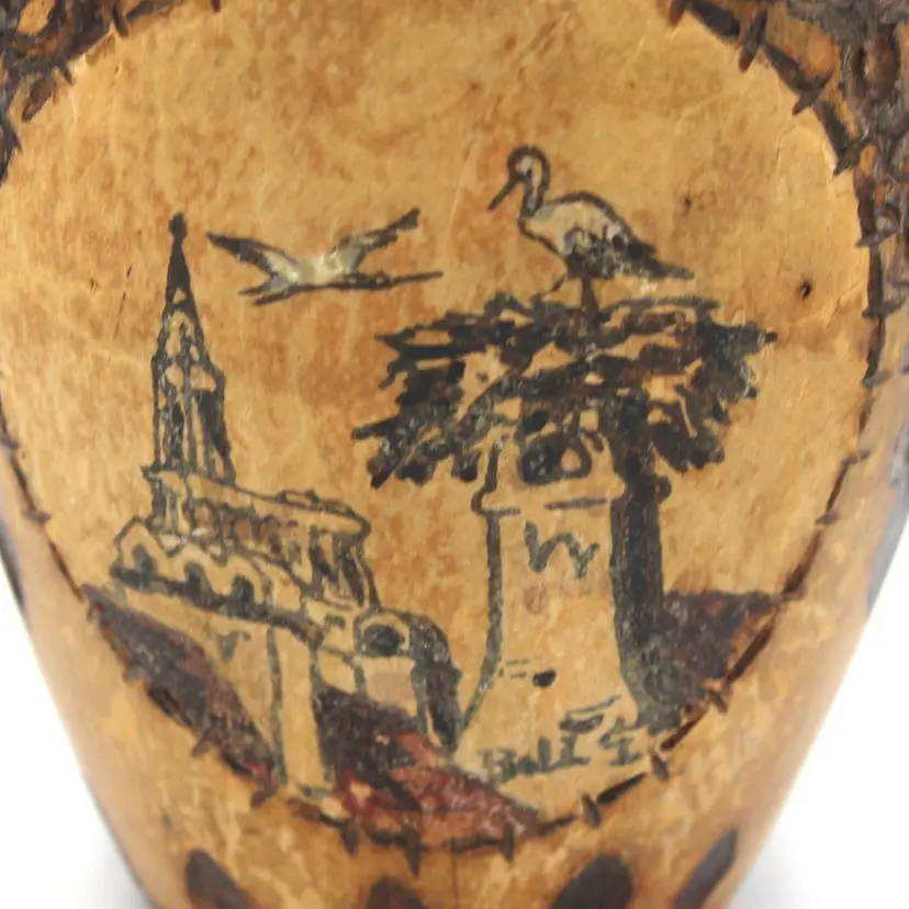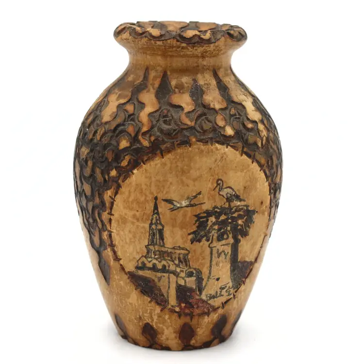 Vintage Alsace Souvenir Vase – Hand Carved with Hand Painted & Pyrography Art by Louis Bollinger (“Boli”), Strasbourg Cathedral & Storks