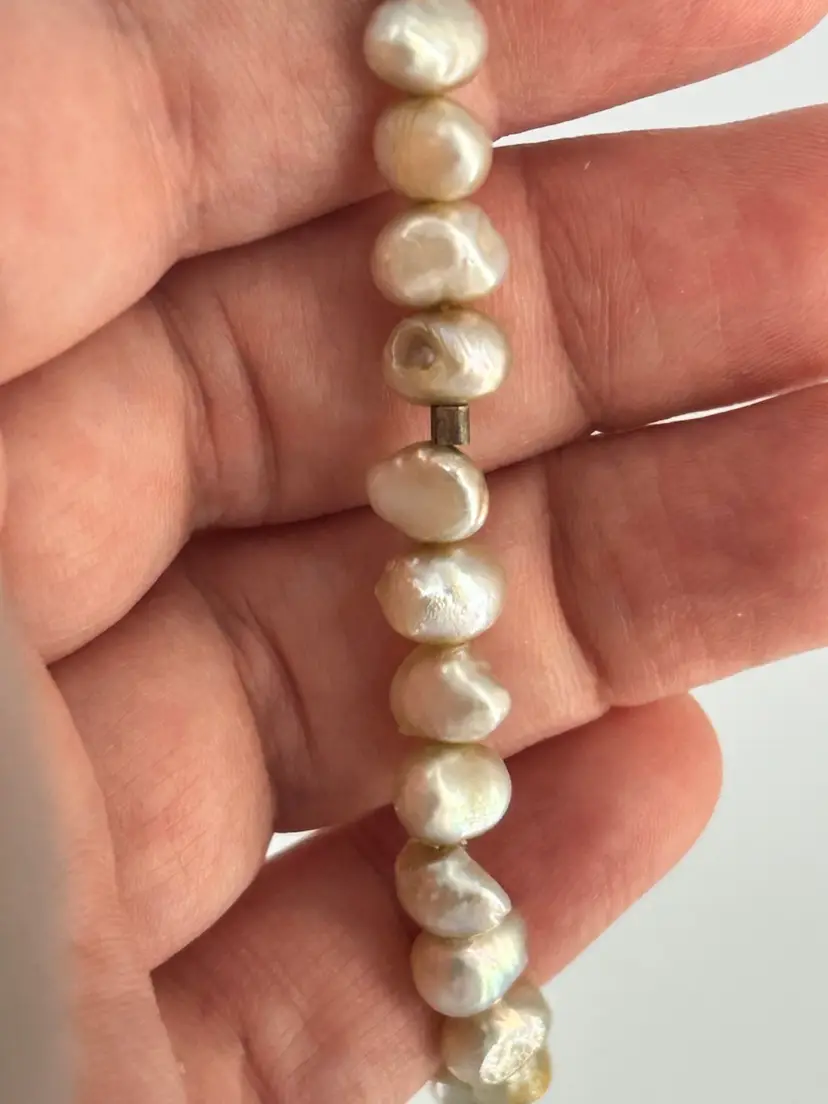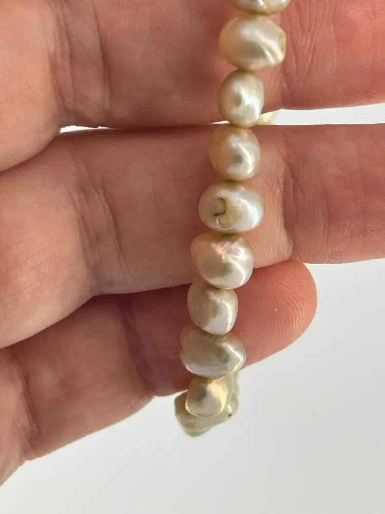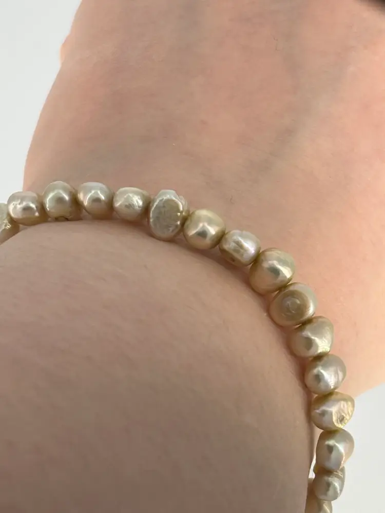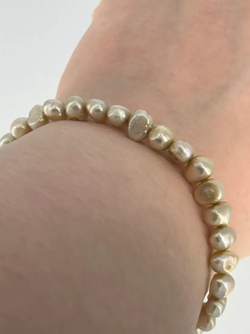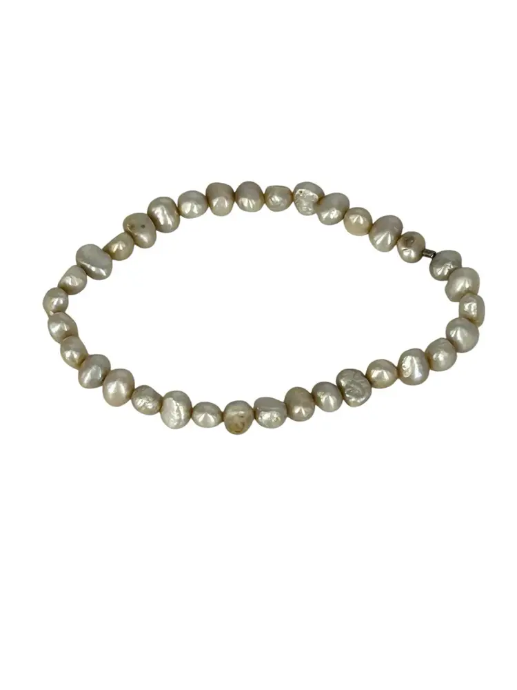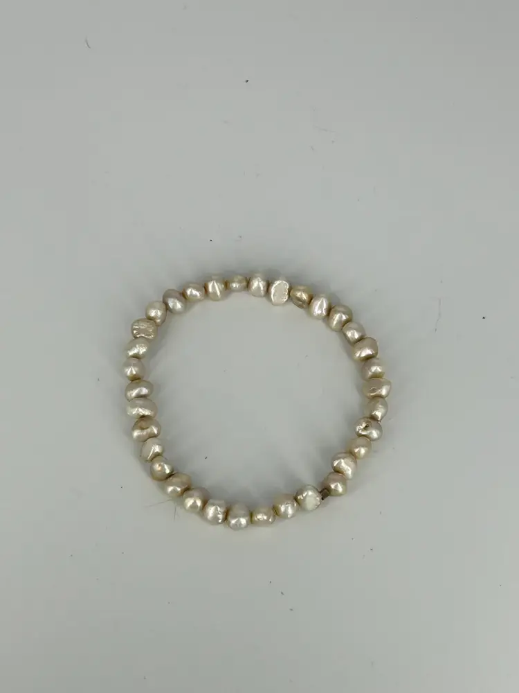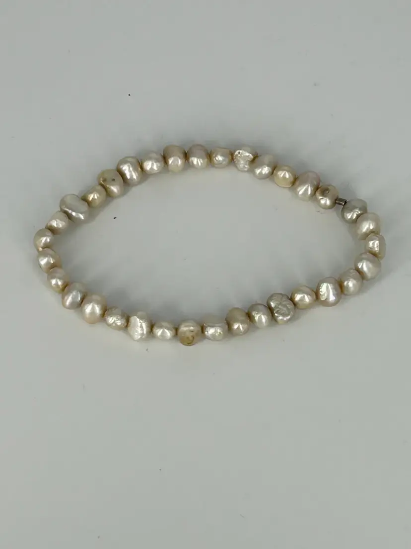 Elevate your accessory game with this elegant vintage freshwater baroque-style pearl bracelet. Featuring organically shaped pearls strung on a stretch cord, this piece offers a timeless, natural beauty perfect for everyday wear or special occasions. Bracelet is unsigned and shows light signs of wear consistent with age.