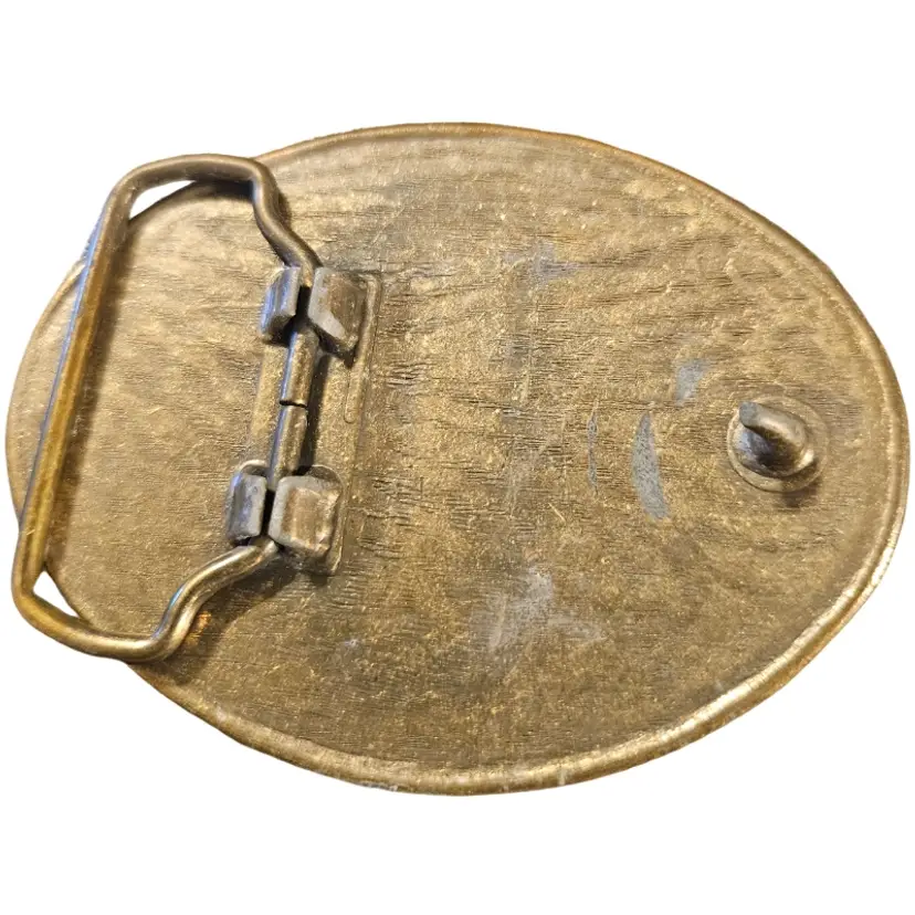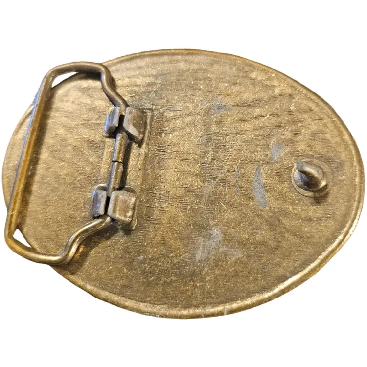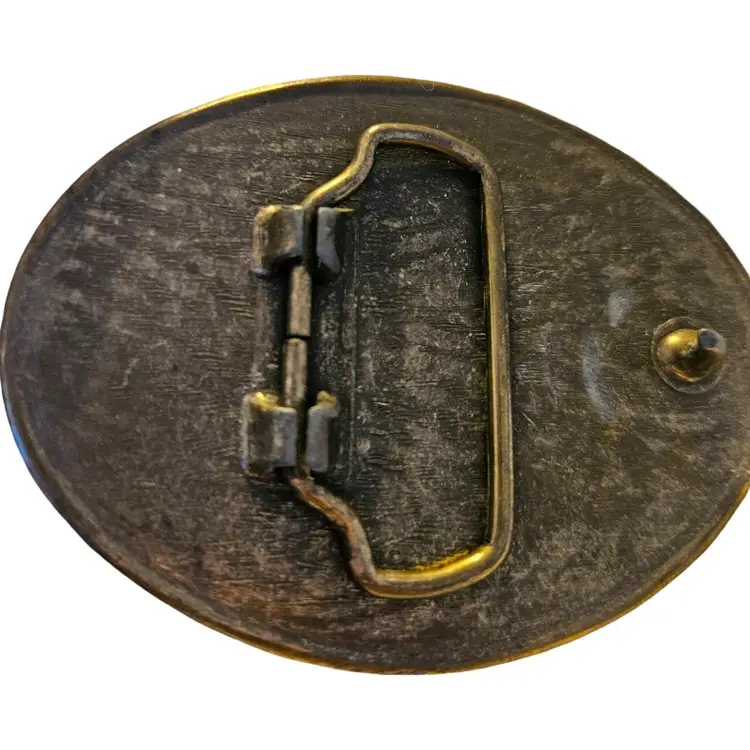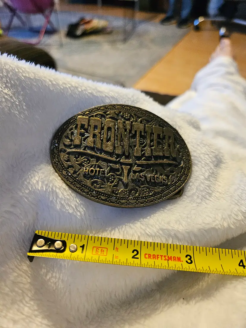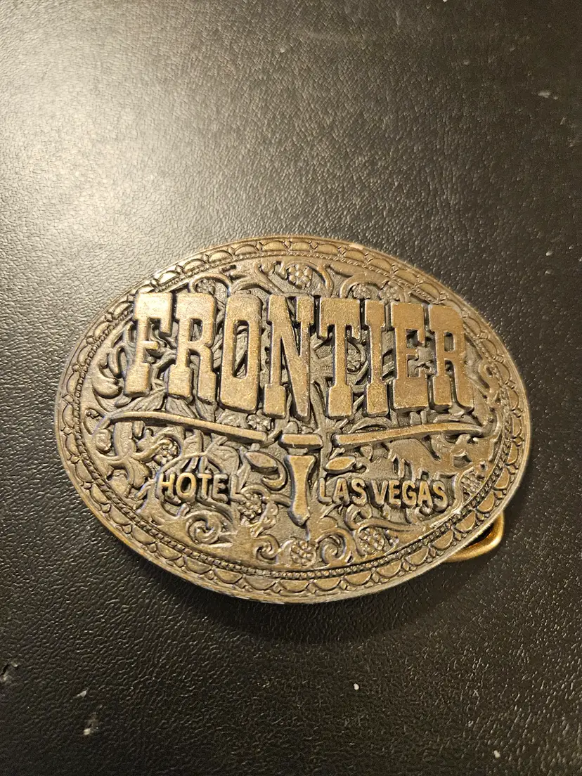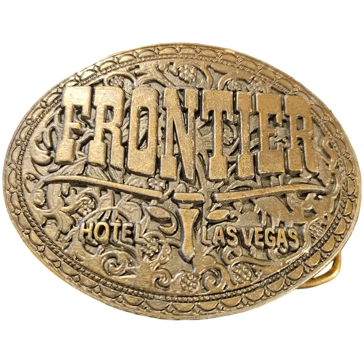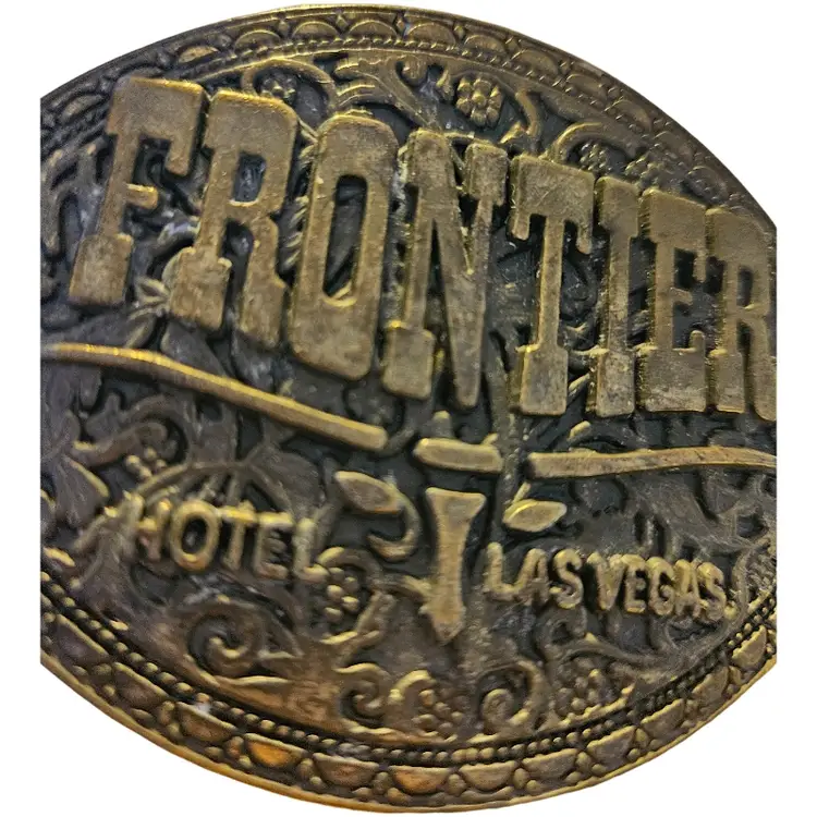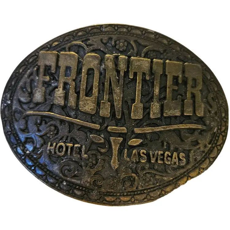 vintage brass souvenir belt buckle from the now-closed Frontier Hotel and Casino in Las Vegas, a collectible item from the 1970s or 1980s.