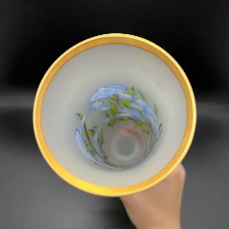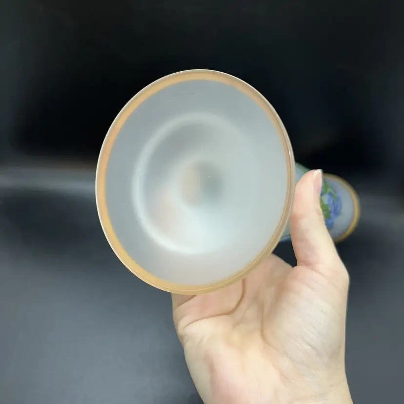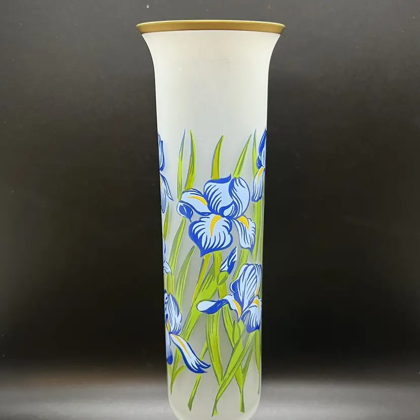 This listing is for a frosted or satin glass bud vase. Made of clear glass with applied iris flower details and gold around the top and bottom rim. No chips or cracks, measures about 10.25" tall and 2.5" across the top.
