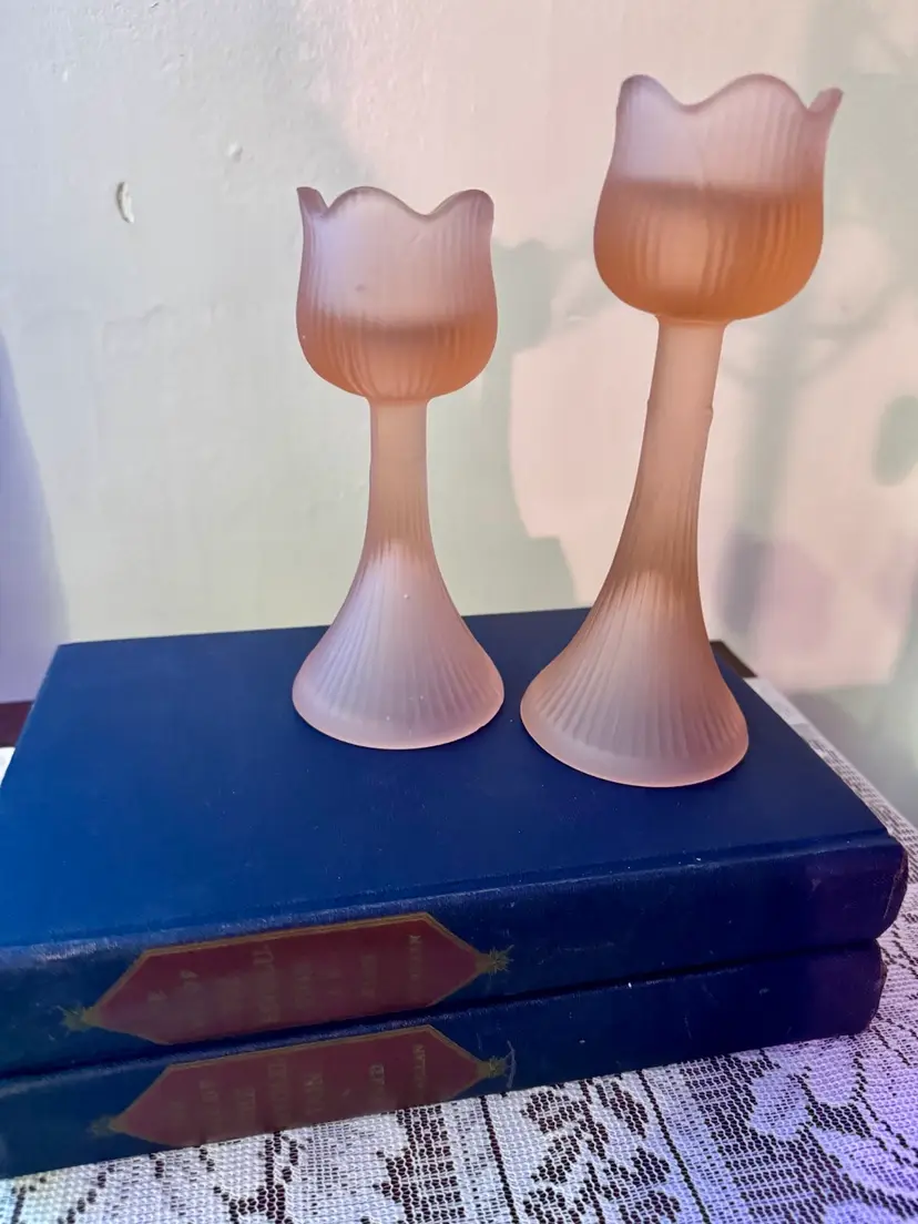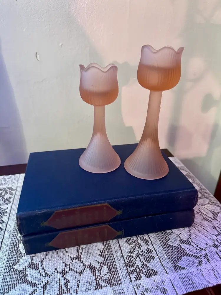 Elevate your tablescape or mantel with this charming pair of vintage frosted glass candlesticks. Featuring tulip-shaped tops and ribbed stems, these candle holders blend classic elegance with soft, romantic appeal. Perfect for cottagecore, shabby chic, or vintage-inspired decor. Excellent vintage condition; no chips or cracks.