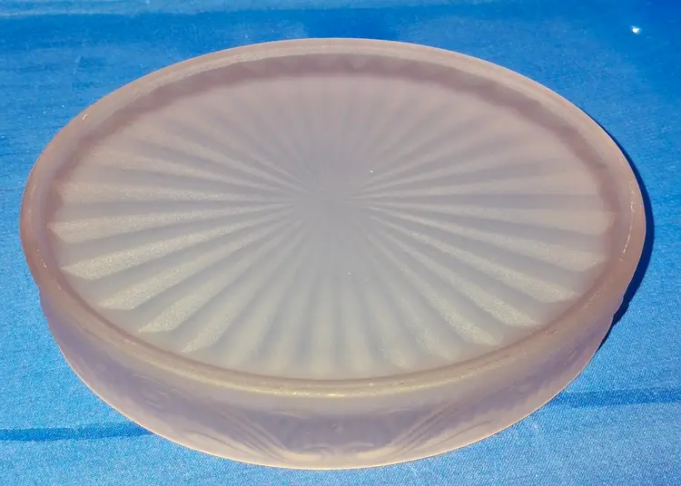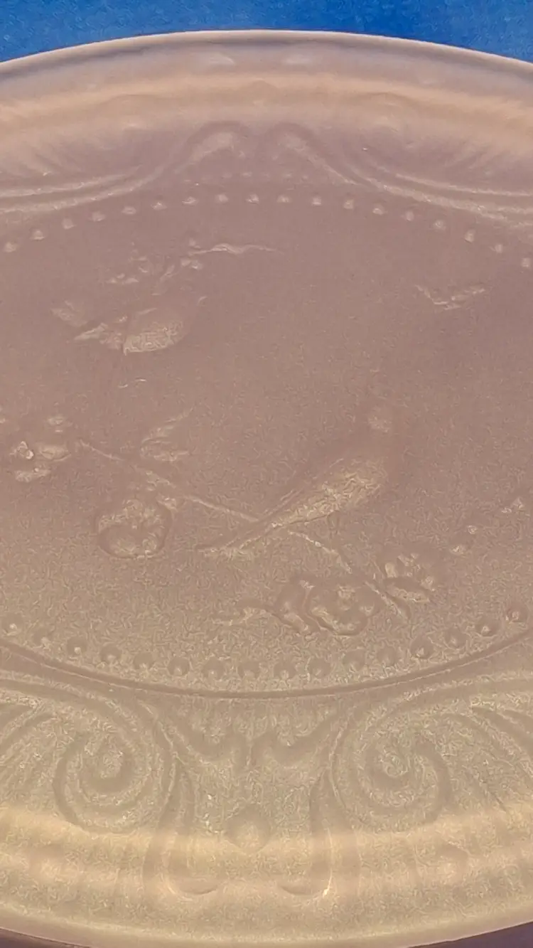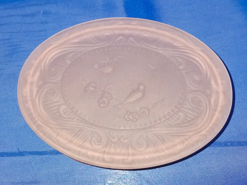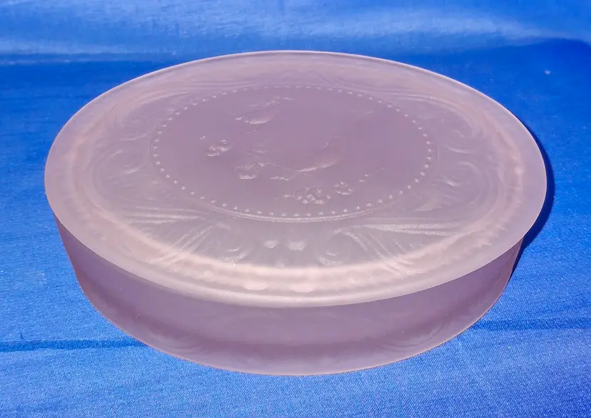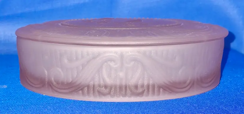 Vintage Frosted Pink Depression Glass Trinket Powder Dish with Lid is 5 5/8" long x 4 1/8" wide x 1 3/8" tall. This beautiful pink jar features an embossed design of scrolls on the sides and top framing the birds sitting on hemlock branches. A great size for trinkets and jewelry. No chips, cracks, or repairs. Please view the pictures and feel free to ask questions. Thank you for visiting my shop.