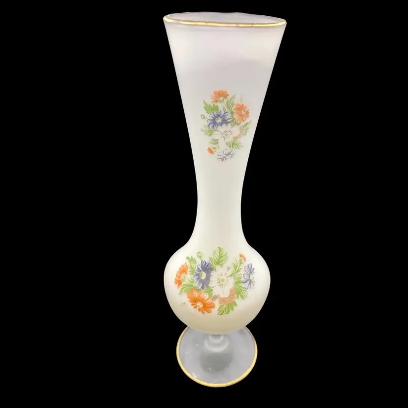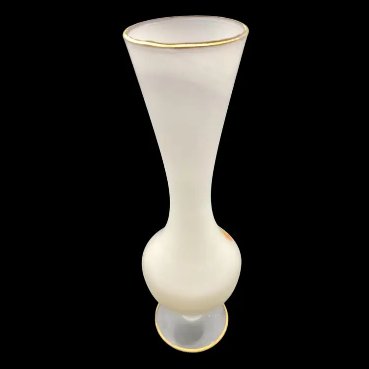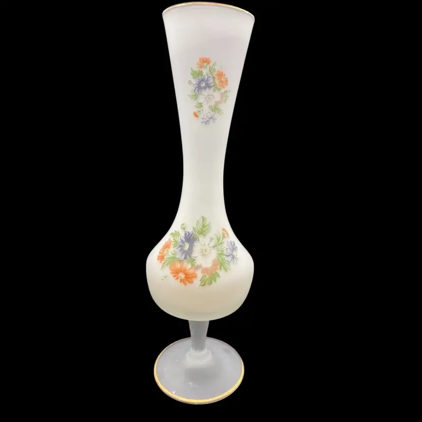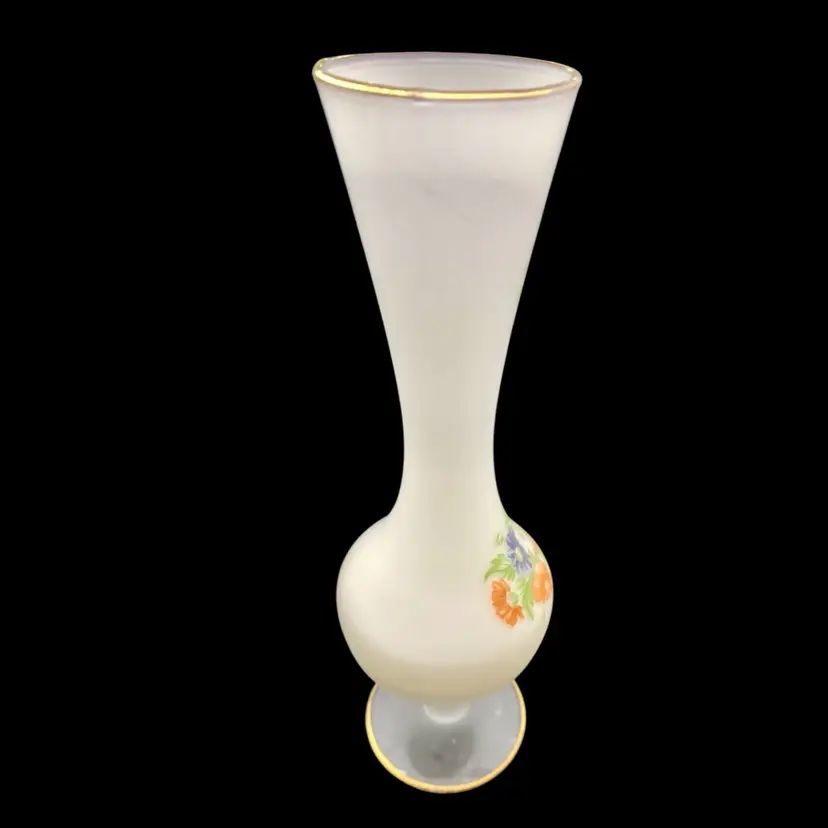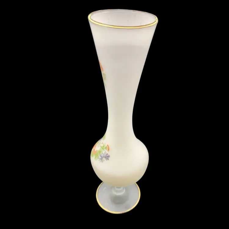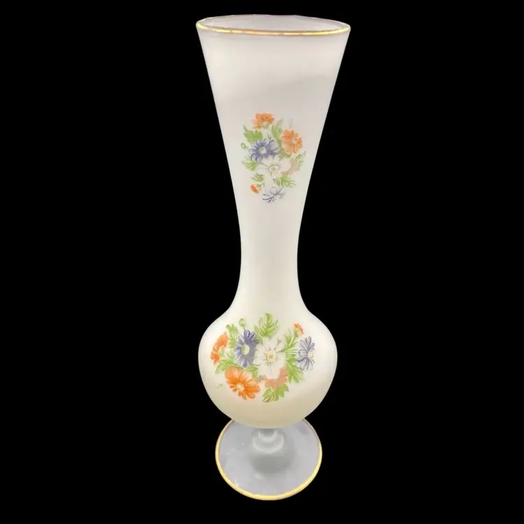 This elegant vintage vase is a stunning addition to any collection. The frosted white satin cased glass creates a beautiful background for the delicate floral pattern. The gold trim on the top and on the pedestal adds a touch of sophistication to this vintage piece. Measuring 10 inches in height and 3 inches in width, this vase is perfect for displaying your favorite flowers or adding a decorative touch to any space.