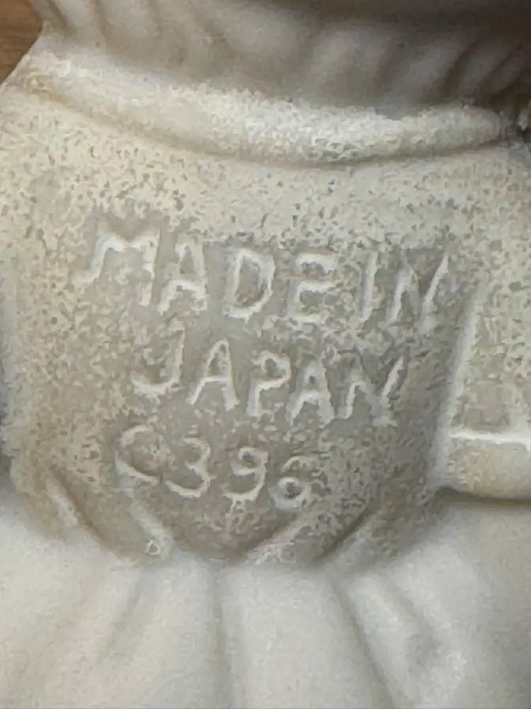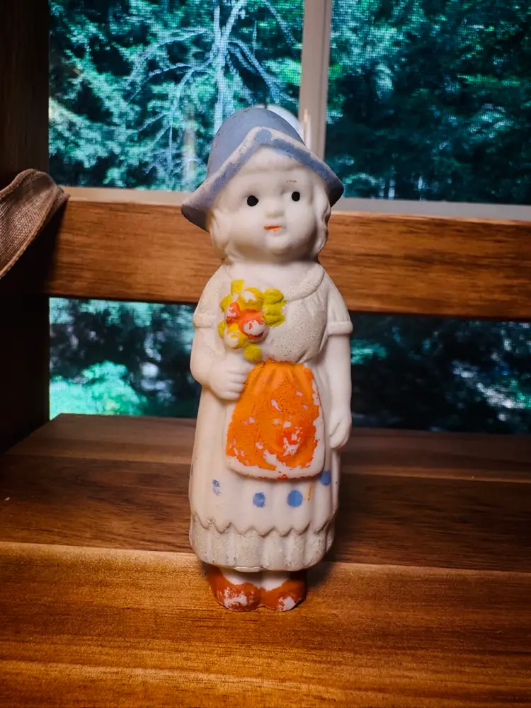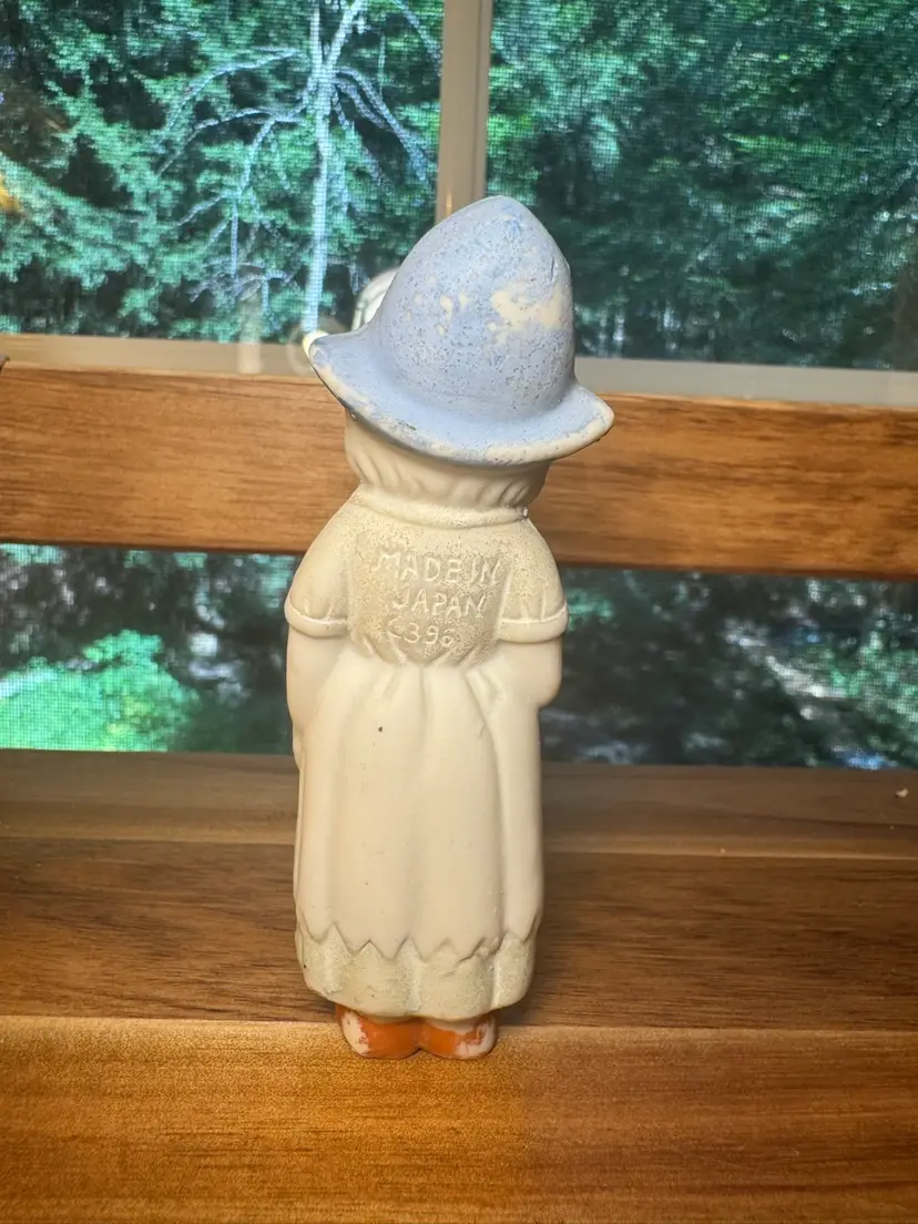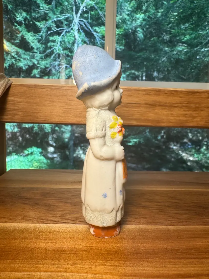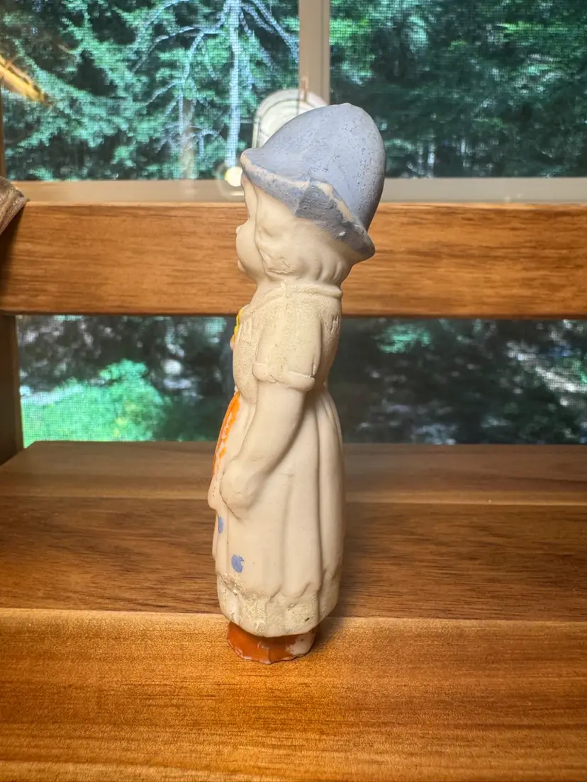 Made in Japan bisque, frozen Charlotte/little Dutch girl. These sweeties are always a joy to place around the house. She would make a good house plant addition.Polkadot apron.Japan & number stamped on back. Paint loss. Stands alone Approx 4” H.