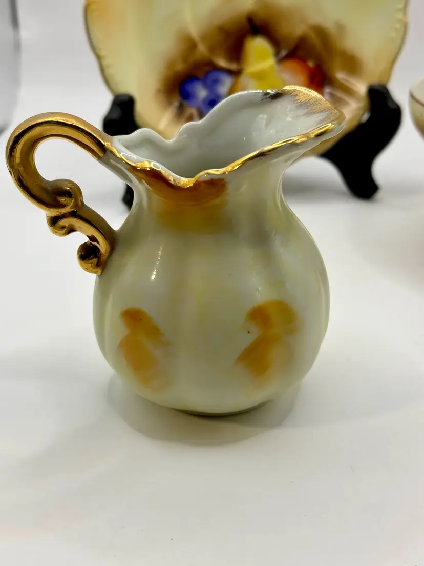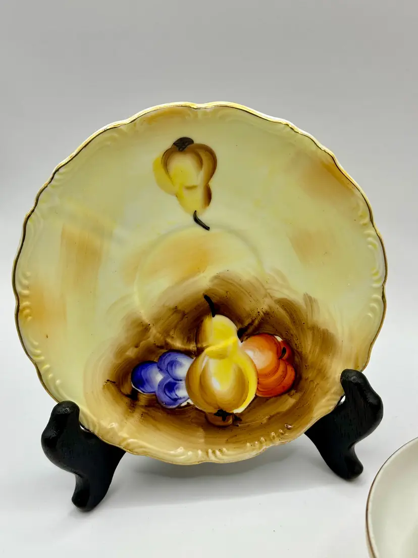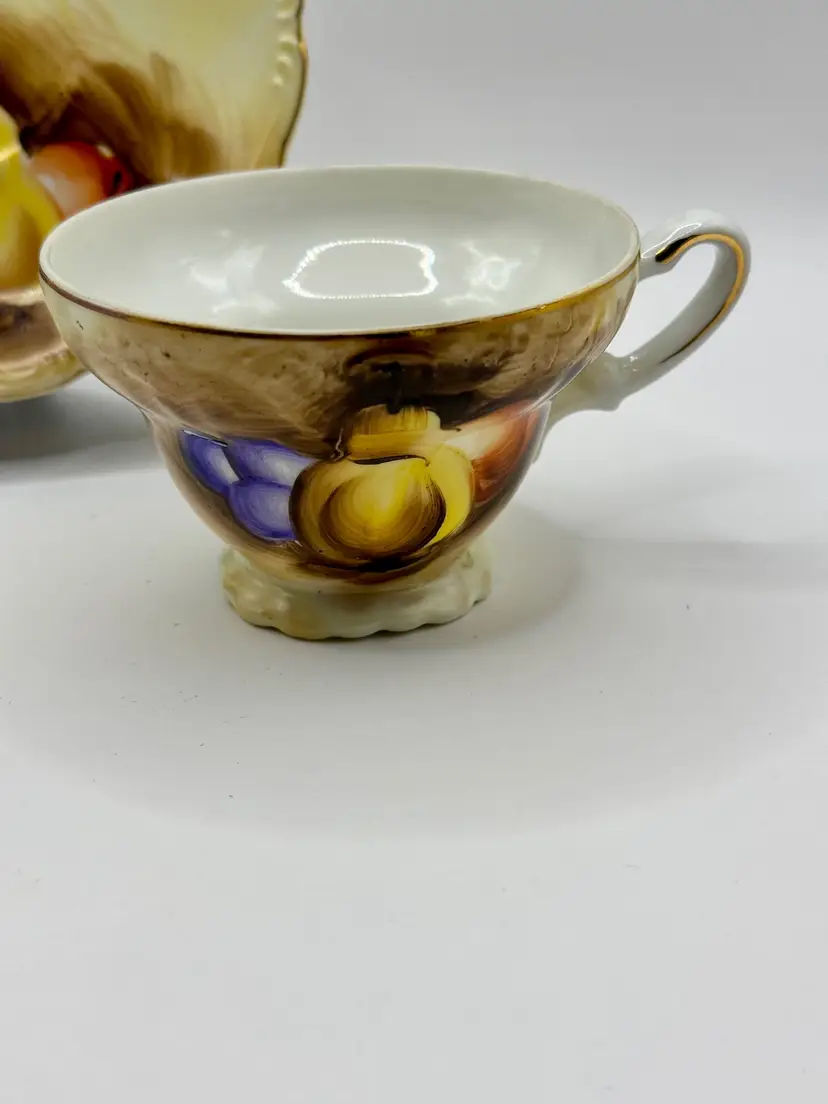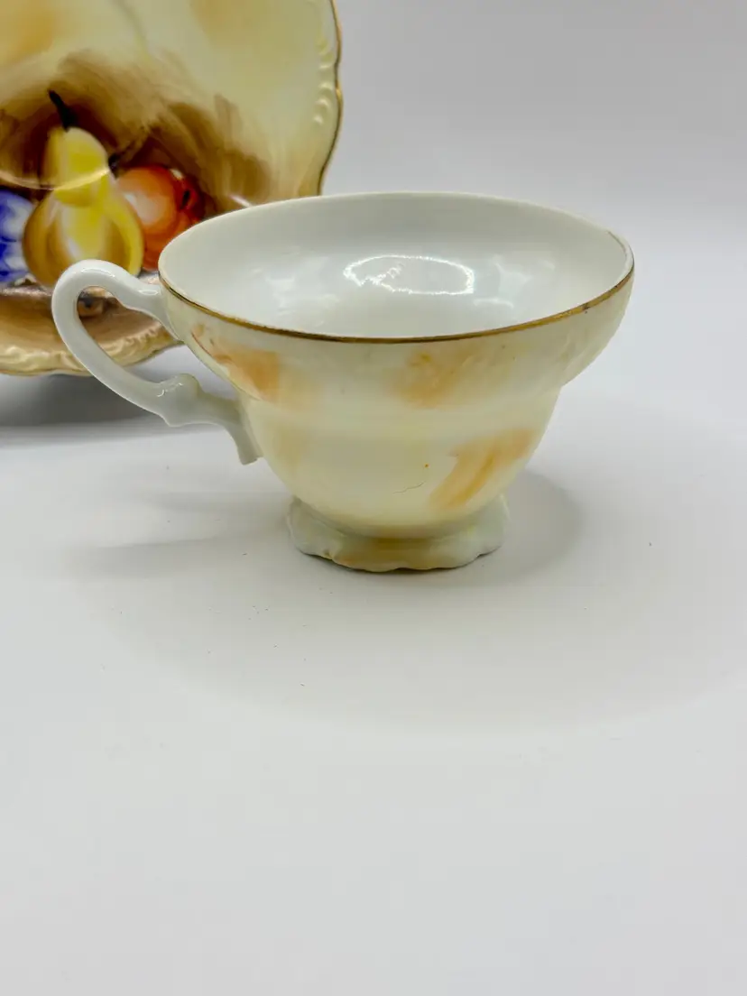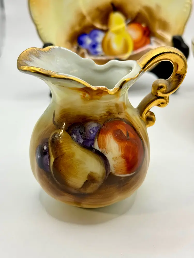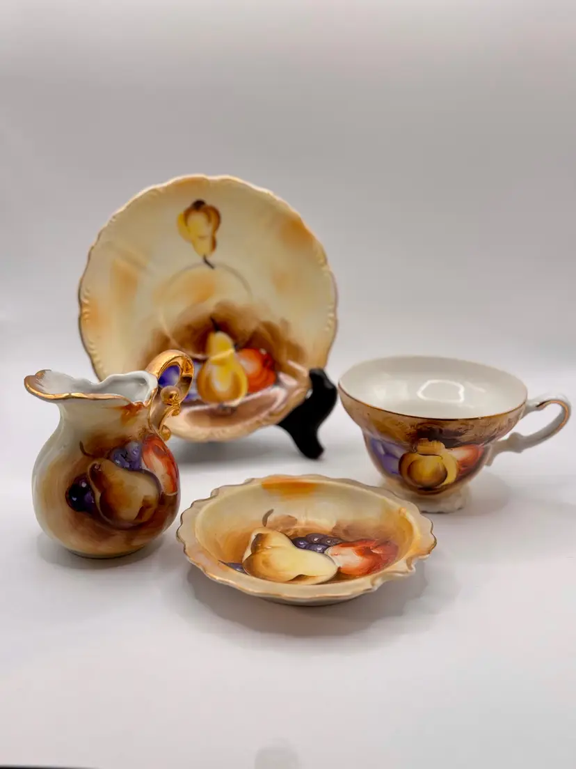 Charming vintage porcelain tea set featuring a delightful peach and plum motif. This set includes a teacup, saucer, creamer, and decorative plate, perfect for adding a touch of nostalgia to your tea time. No visible chips or cracks. A lovely find for collectors or as a unique gift. Measures cup 4.75x2.5x2., saucer 5.5”, creamer 3.5x3.5x1.5, plate 5”. Weighs 2lb.