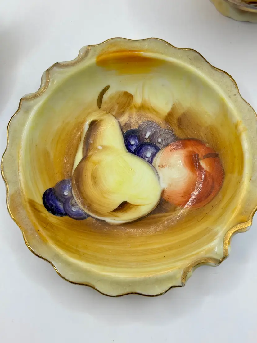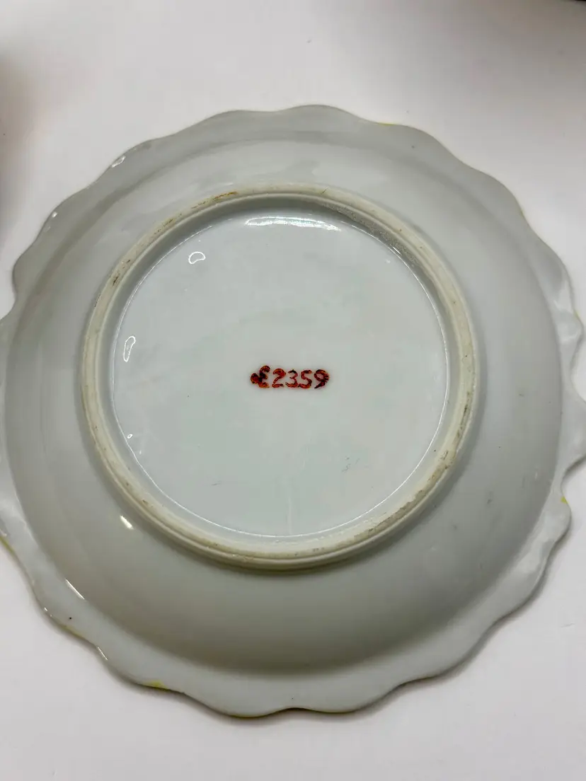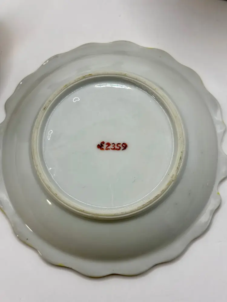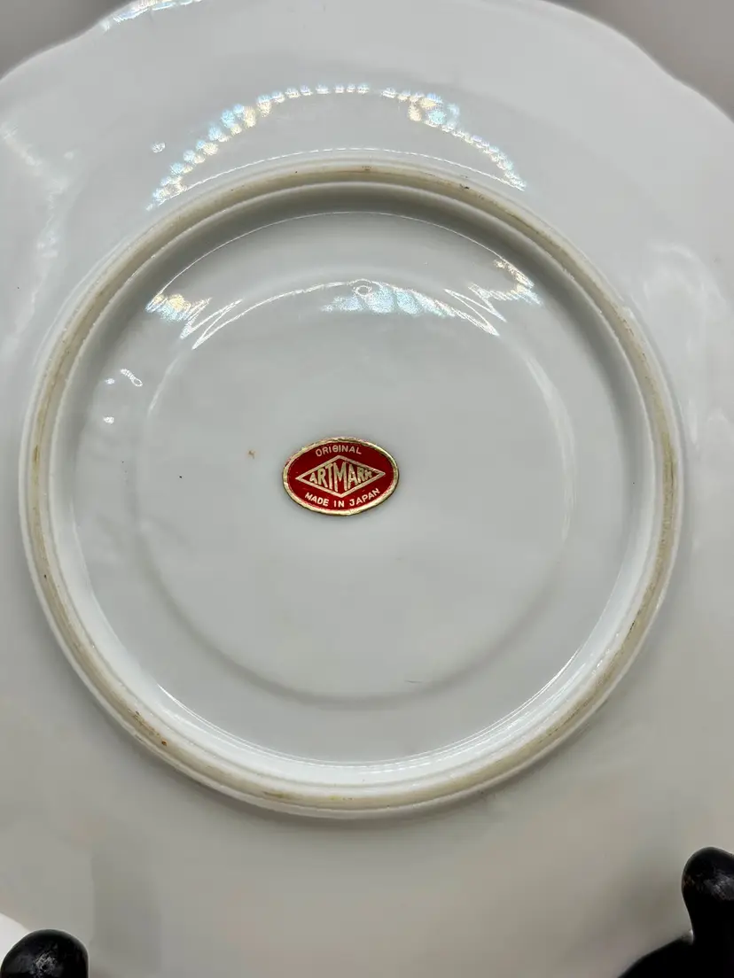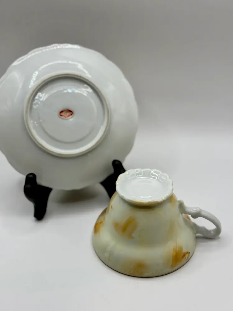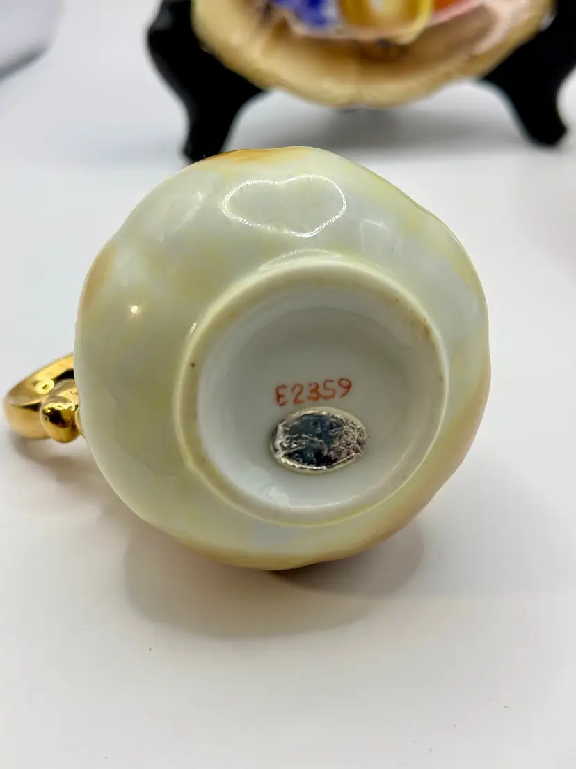 Charming vintage porcelain tea set featuring a delightful peach and plum motif. This set includes a teacup, saucer, creamer, and decorative plate, perfect for adding a touch of nostalgia to your tea time. No visible chips or cracks. A lovely find for collectors or as a unique gift. Measures cup 4.75x2.5x2., saucer 5.5”, creamer 3.5x3.5x1.5, plate 5”. Weighs 2lb.