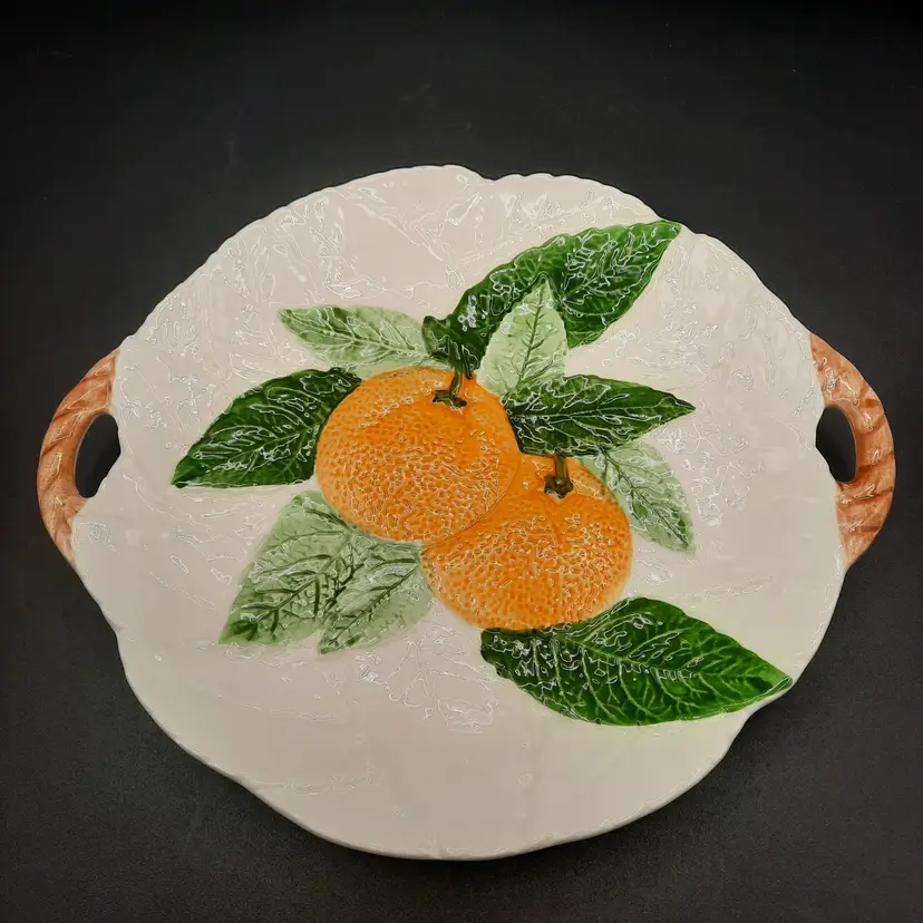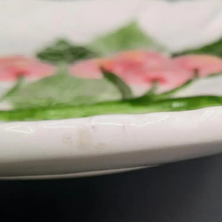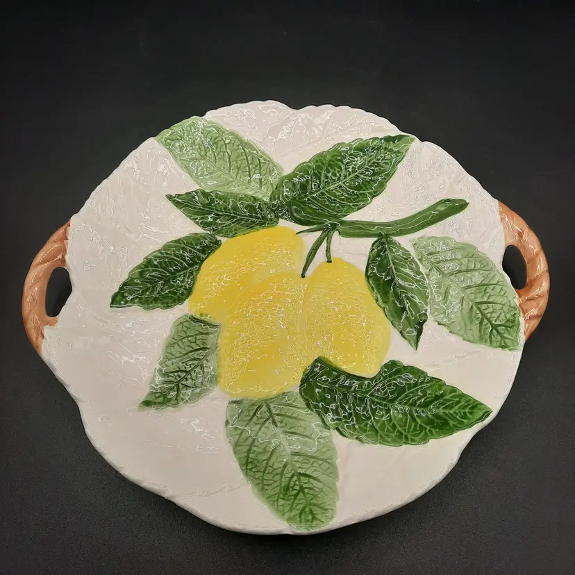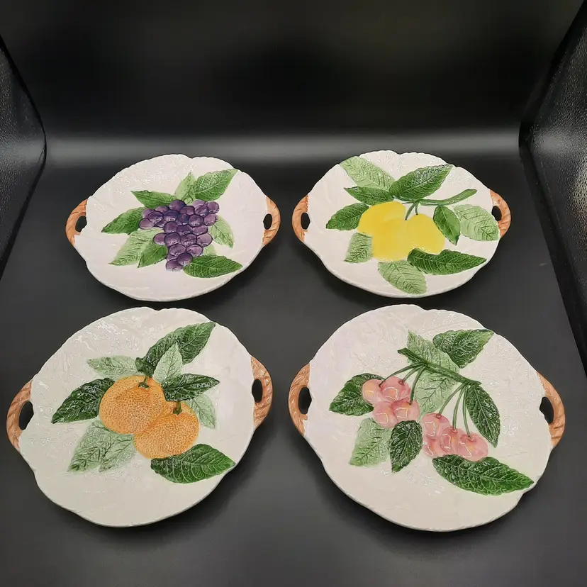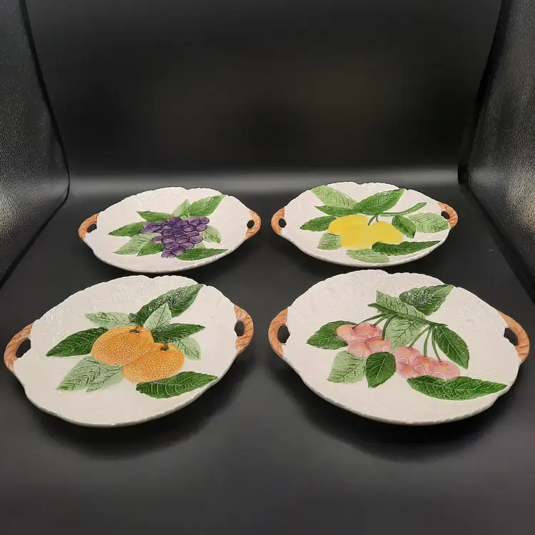 Set of 4 different plates, 9", in great condition with a few fleabites/paint chips on edges, wavy lines across back of lemon look like mfg flaw