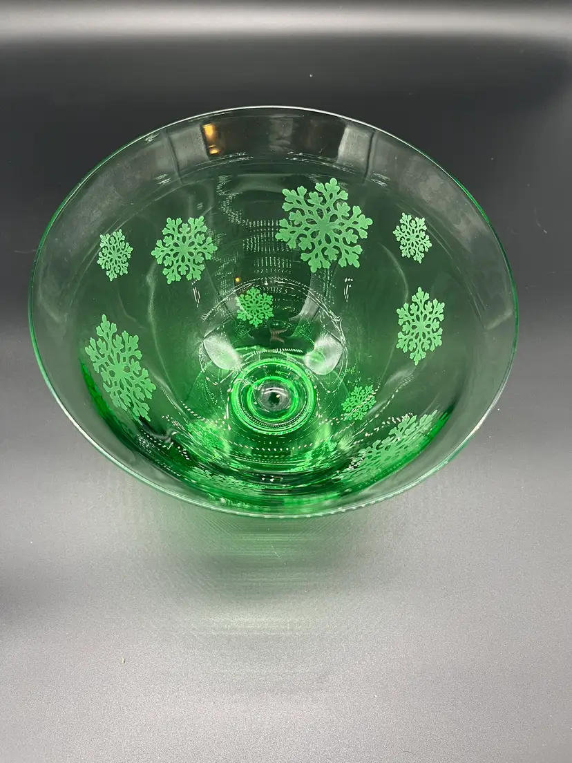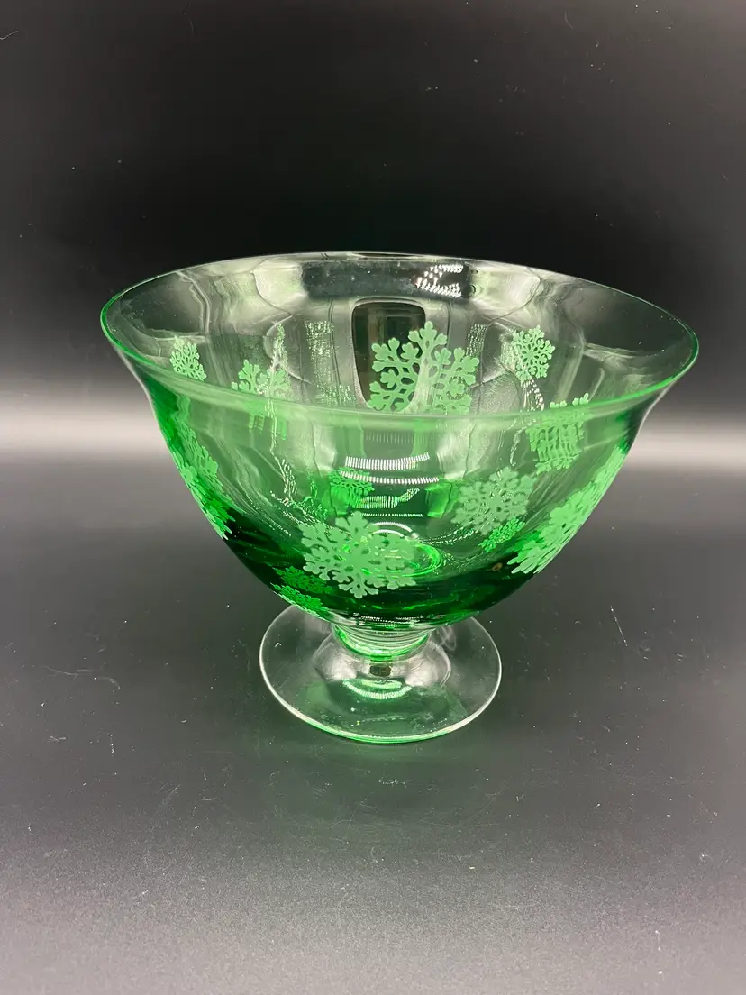 A stunning addition to any collection and holiday table. Bowl is green and footing is clear pressed glass with beautiful snowflake pattern etchings. Perfect for display or as servingware for an elegant holiday tablescape. Shipping included. 5.5" tall, 7" wide. Very good condition, no chips or cracks noted. Minor bubble in clear base, does not appear to be scratch but bubble within the glass, as shown in photo.