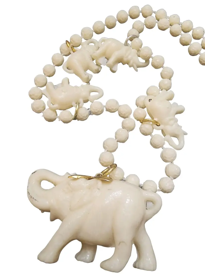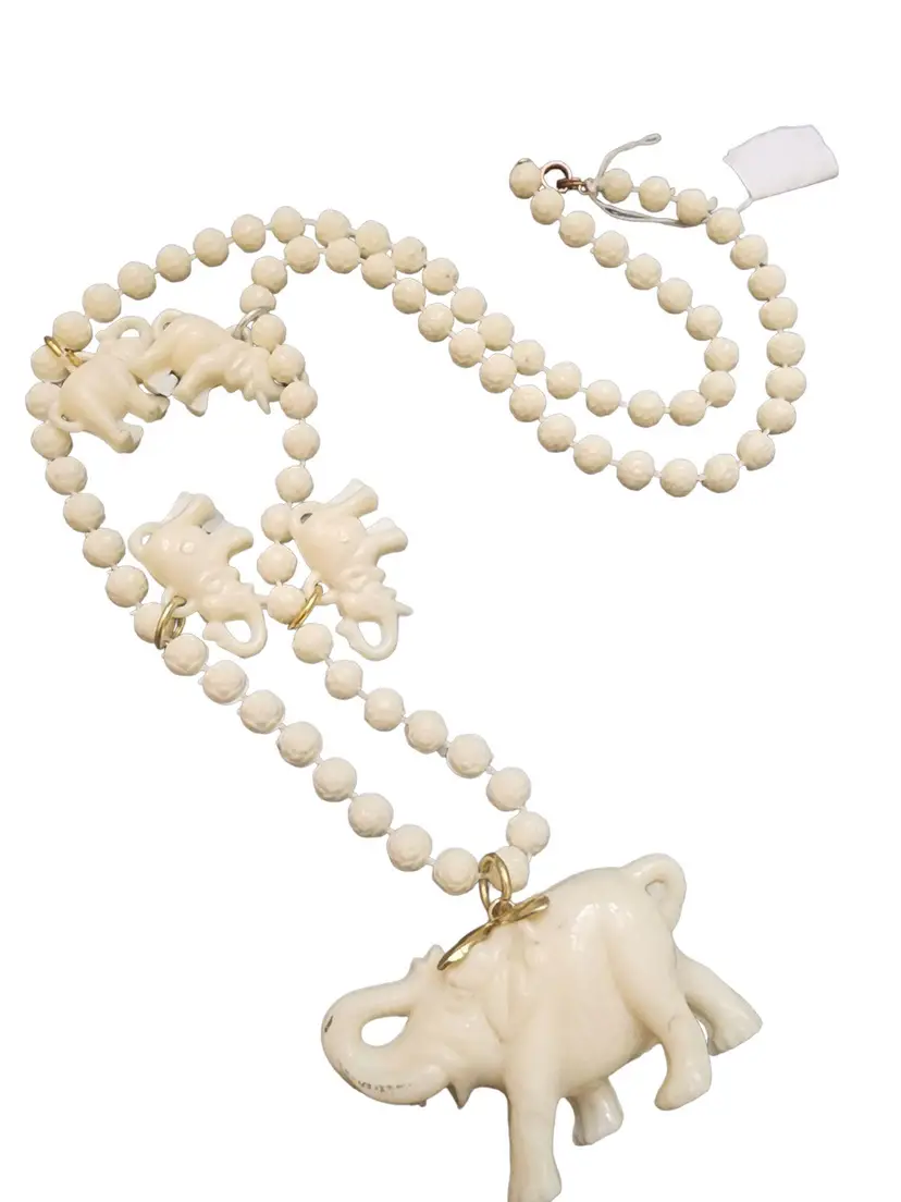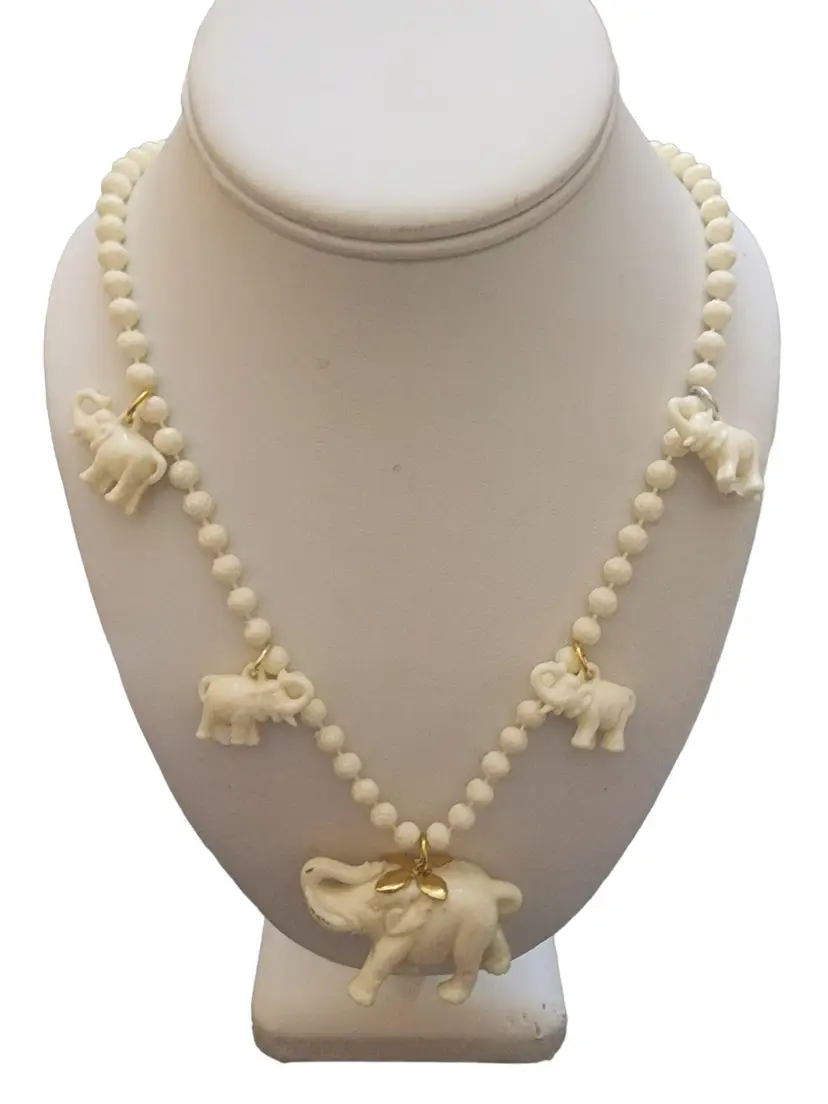 Wonderful elephant charm necklace, features 5 elephant charms in total. This necklace is in cream color, has spring ring closure. A fun piece that can be worn everywhere.