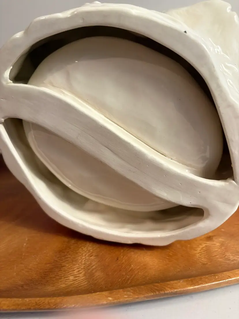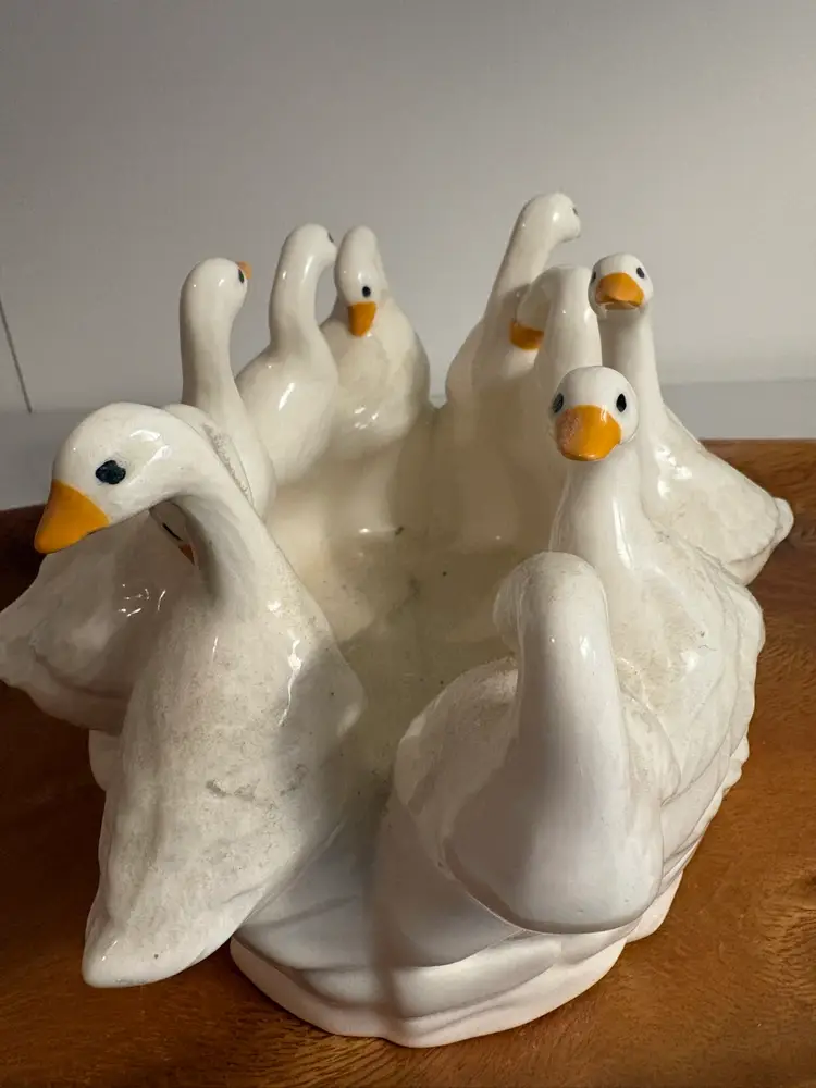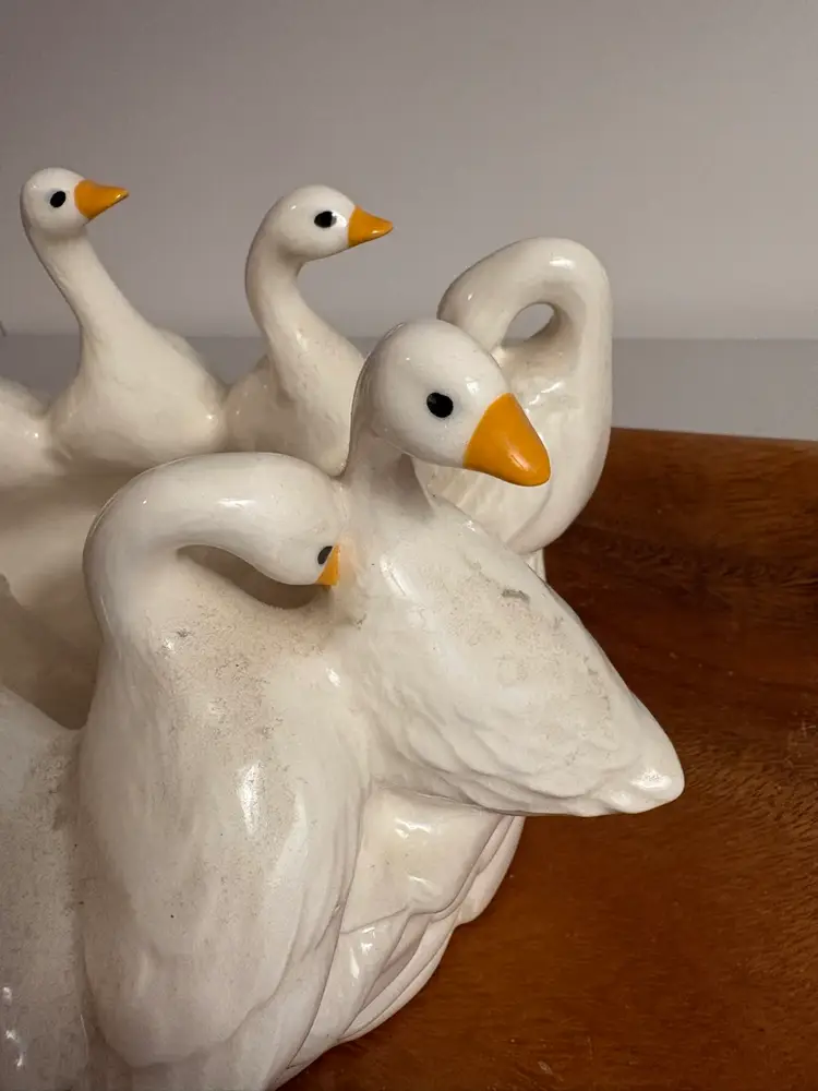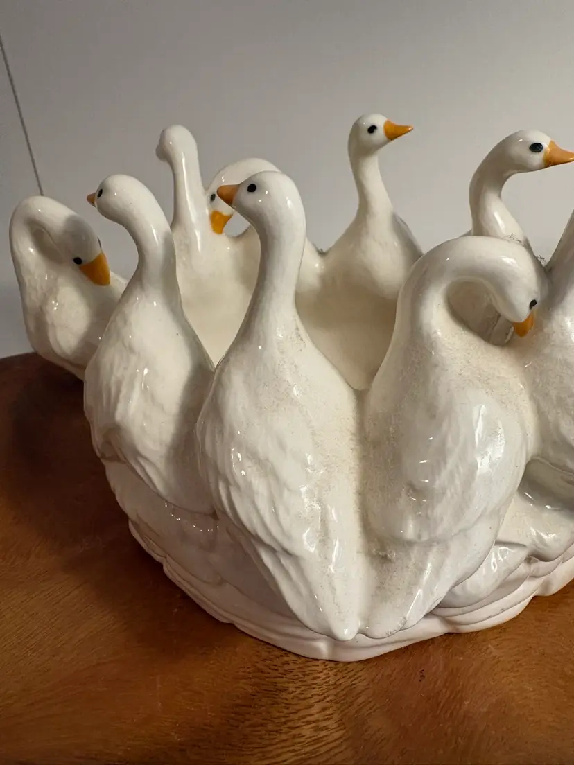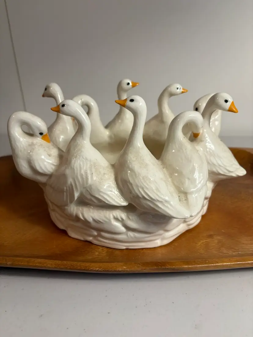This vintage ceramic vase planter features a circle shape with a gaggle of geese in a ring design. It is of medium size, multicolored, and has a glazed finish. Handmade in the late 20th century, this country-style piece is perfect for all occasions and would make a unique addition to any collection of decorative collectibles. Its unique design and charm make it a standout piece for those who appreciate nostalgic and whimsical decor.