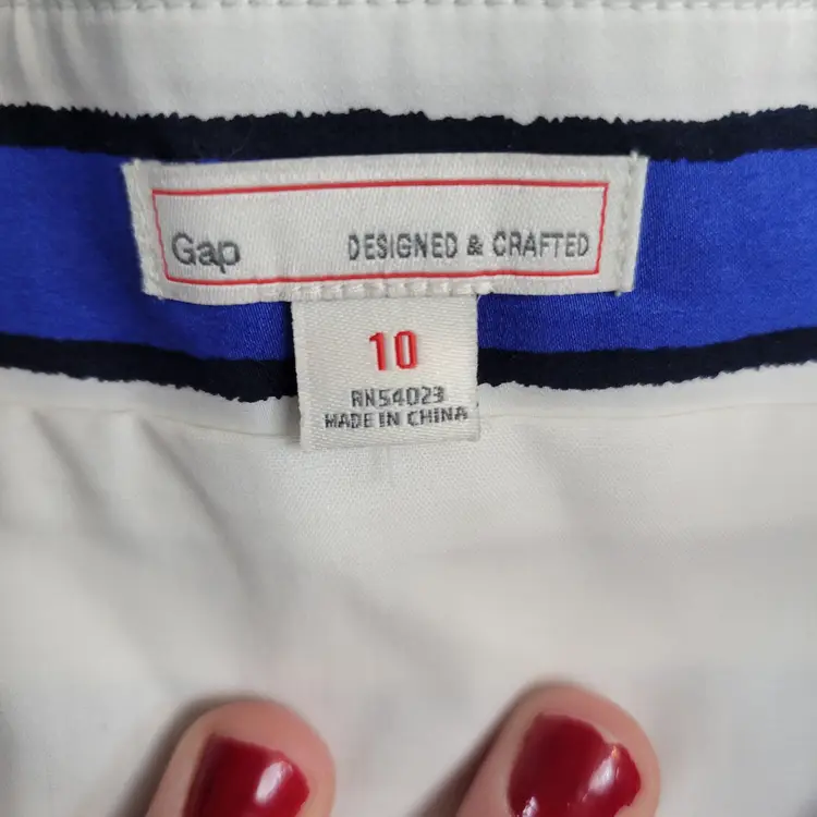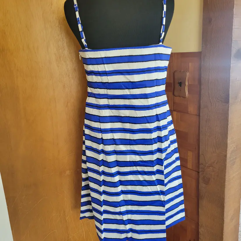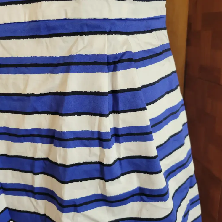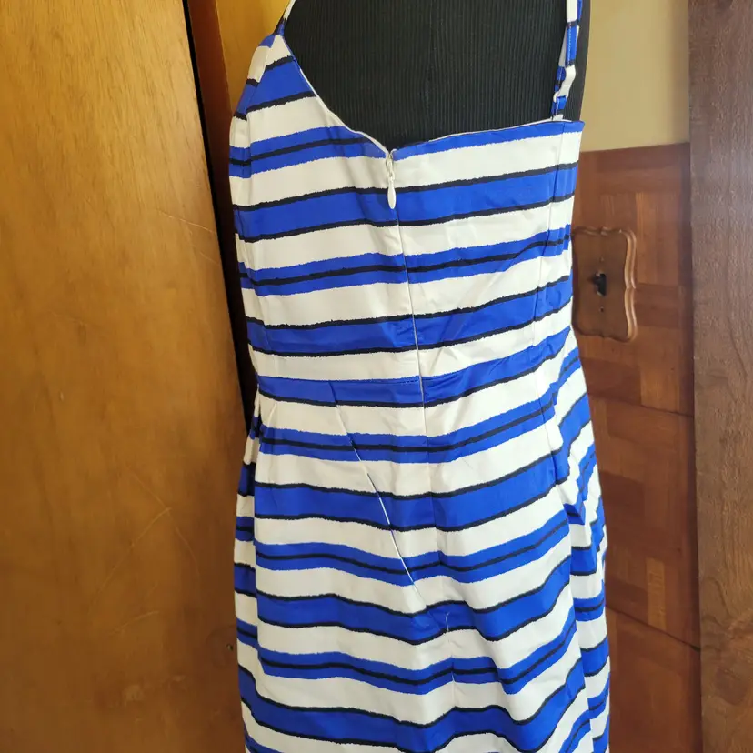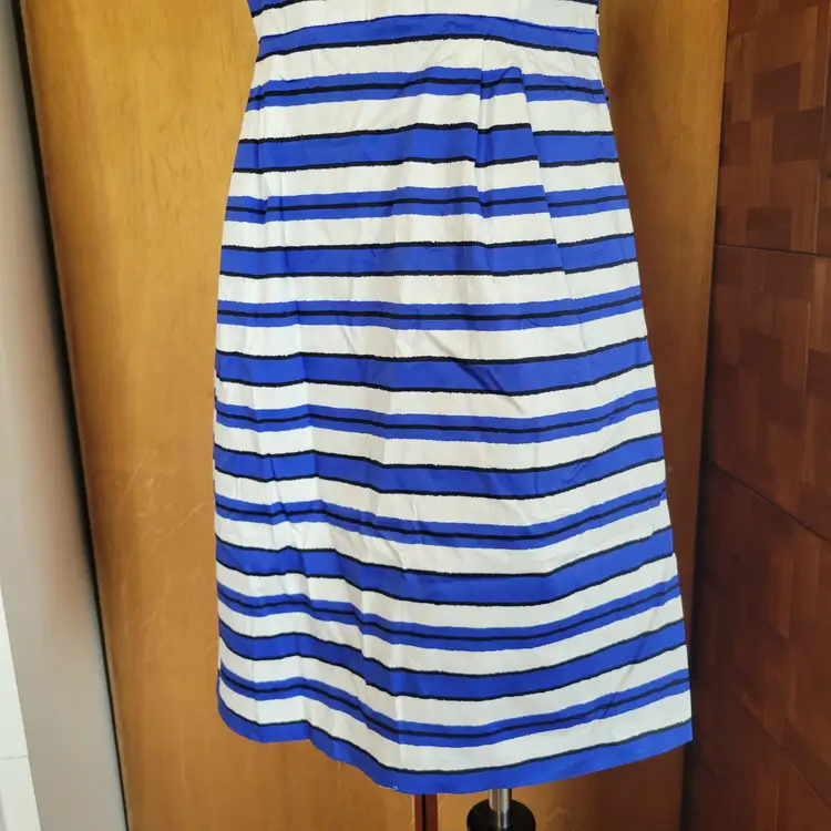 The Vintage Gap Connie Blue & White Stripe Sateen Summer Dress #351626 in size 10 is a stylish and colorful A-Line dress perfect for summer parties or casual occasions. Made of comfortable cotton material, this sleeveless dress features a sweetheart neckline, strappy sleeves, and a knee-length hemline. The blue and white striped pattern adds a classic touch to the vintage-inspired design by Gap, making it a versatile and trendy addition to any woman's wardrobe.