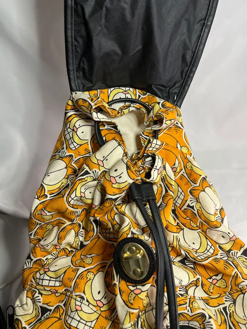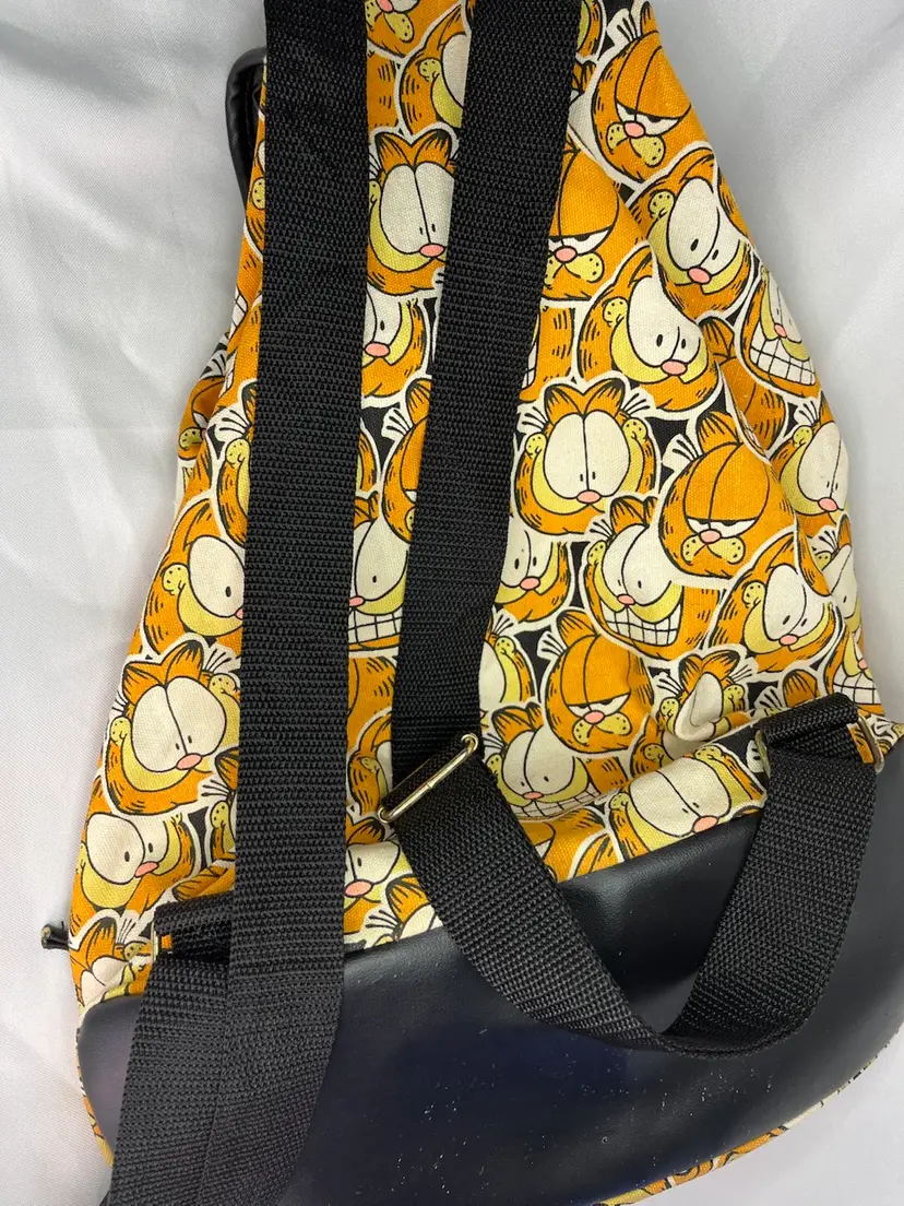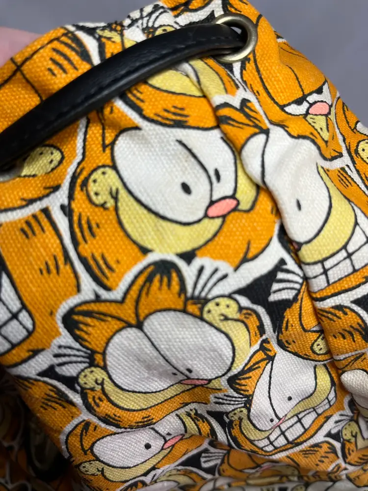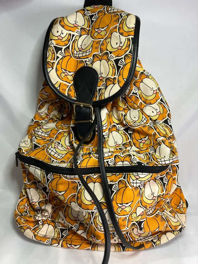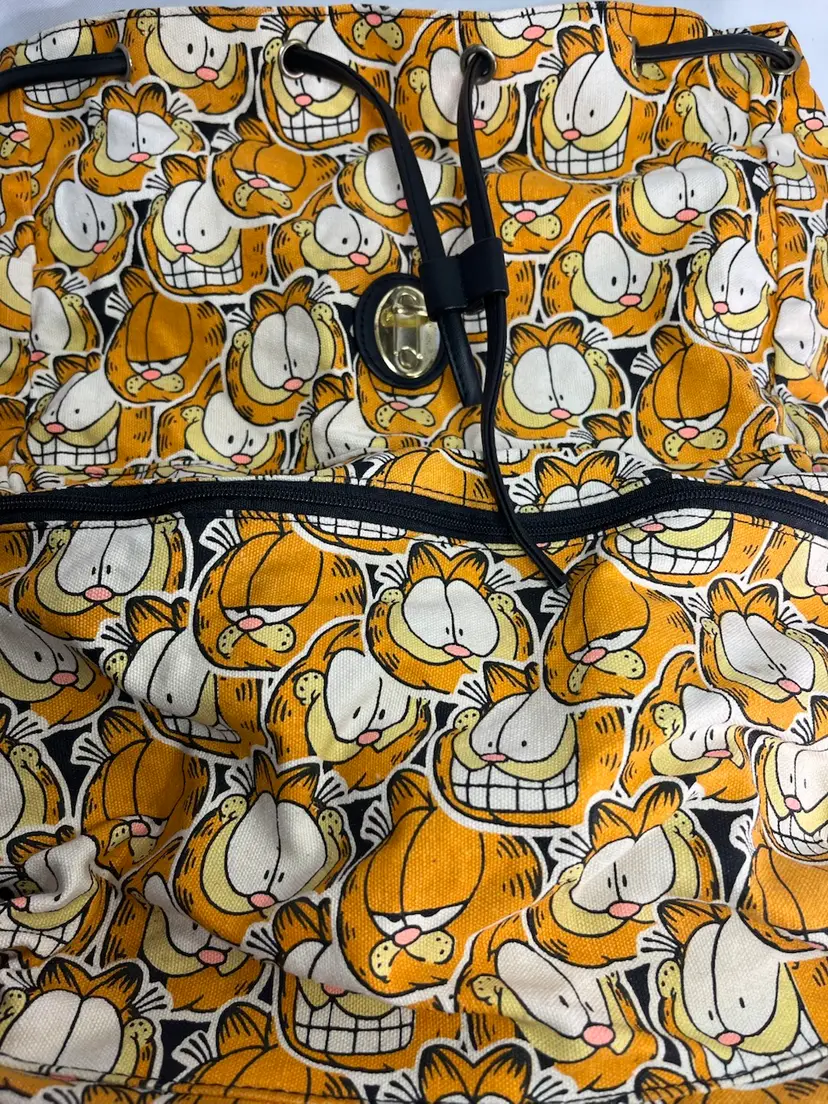 Vintage Garfield backpack featuring an all-over print of the iconic orange cat in multiple expressions. This canvas bag has black faux leather trim, adjustable straps, and a front zipper pocket. It closes securely with both a drawstring and buckle clasp. The interior is spacious with a clean lining and shows minimal signs of use. Some small spots and faint stains on the exterior may clean off with care, and the bottom shows light spotting. Metal hardware has some tarnish from age. Overall in great vintage condition and perfect for Garfield fans or collectors. Pictures are part of the description.