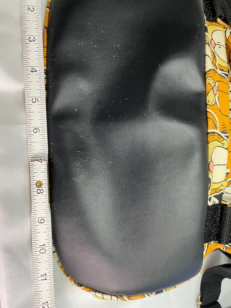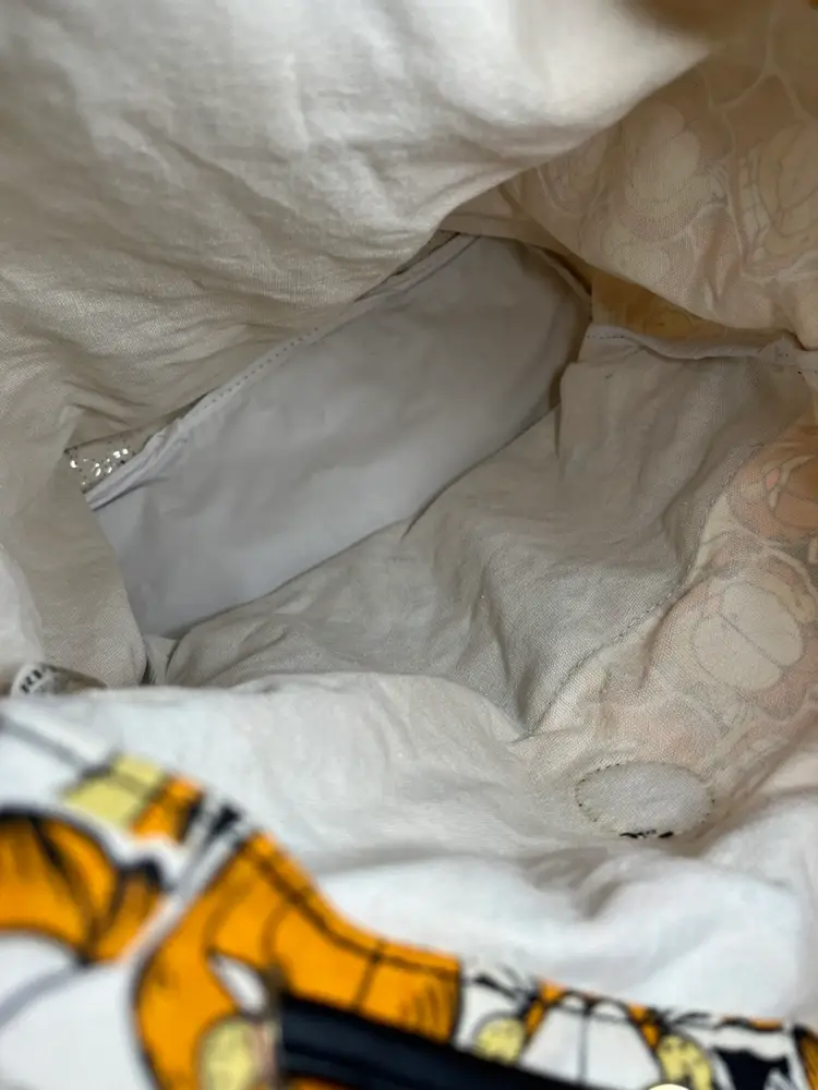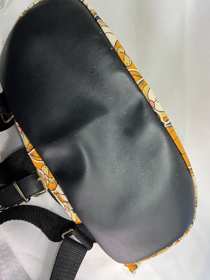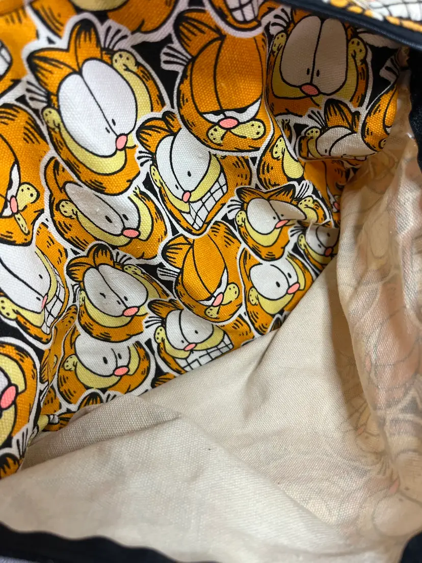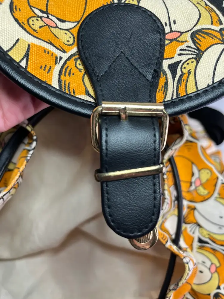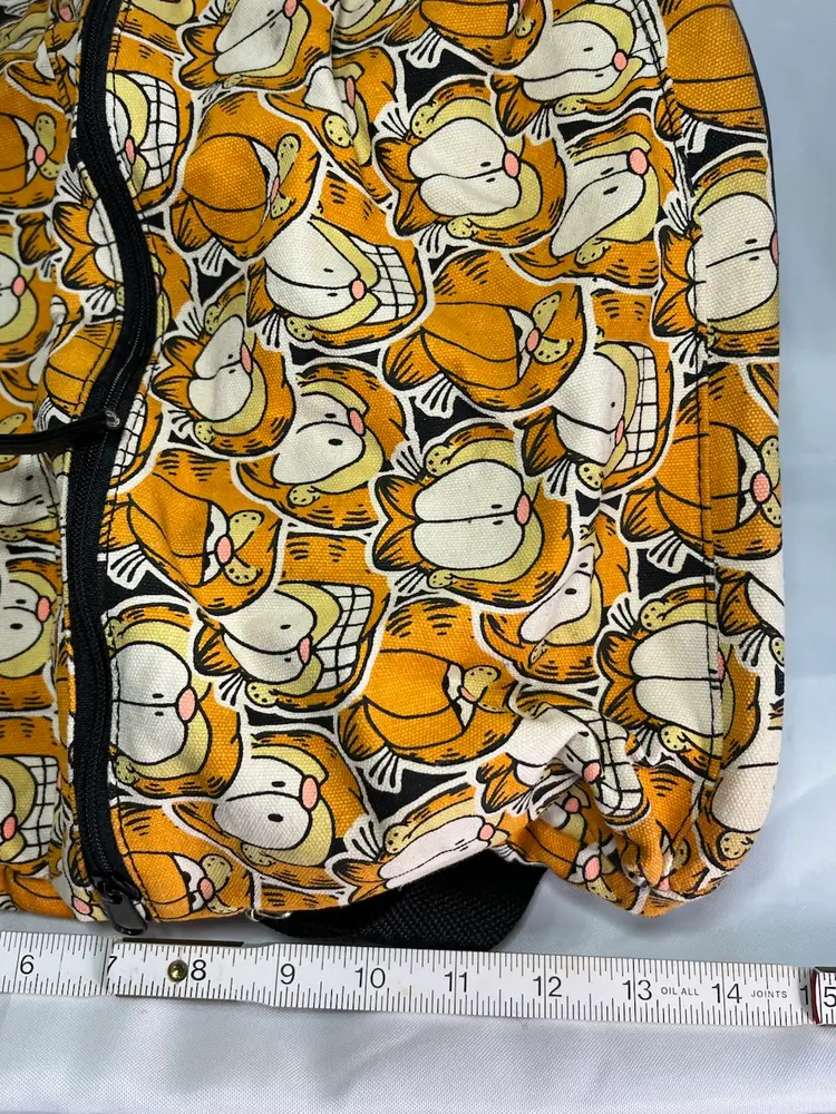 Vintage Garfield backpack featuring an all-over print of the iconic orange cat in multiple expressions. This canvas bag has black faux leather trim, adjustable straps, and a front zipper pocket. It closes securely with both a drawstring and buckle clasp. The interior is spacious with a clean lining and shows minimal signs of use. Some small spots and faint stains on the exterior may clean off with care, and the bottom shows light spotting. Metal hardware has some tarnish from age. Overall in great vintage condition and perfect for Garfield fans or collectors. Pictures are part of the description.