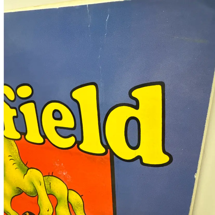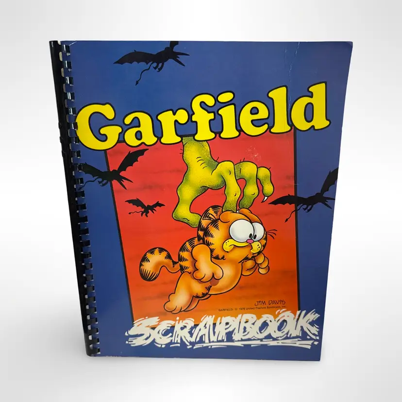 Vintage unused Garfield scrapbook with a monster hand holding Garfield and monsters flying in the background. Some creases on the cover. Measures approximately 12” W x 14” H