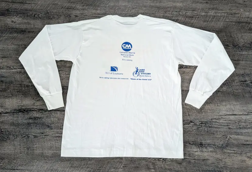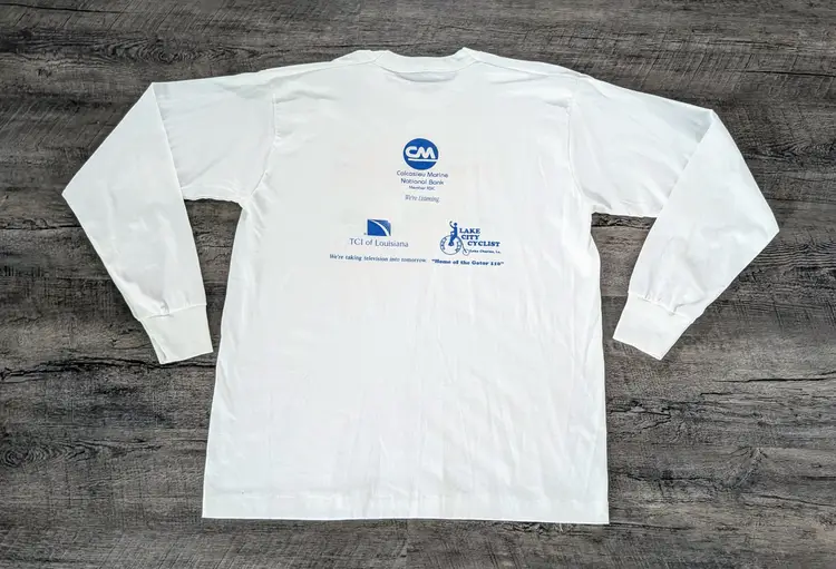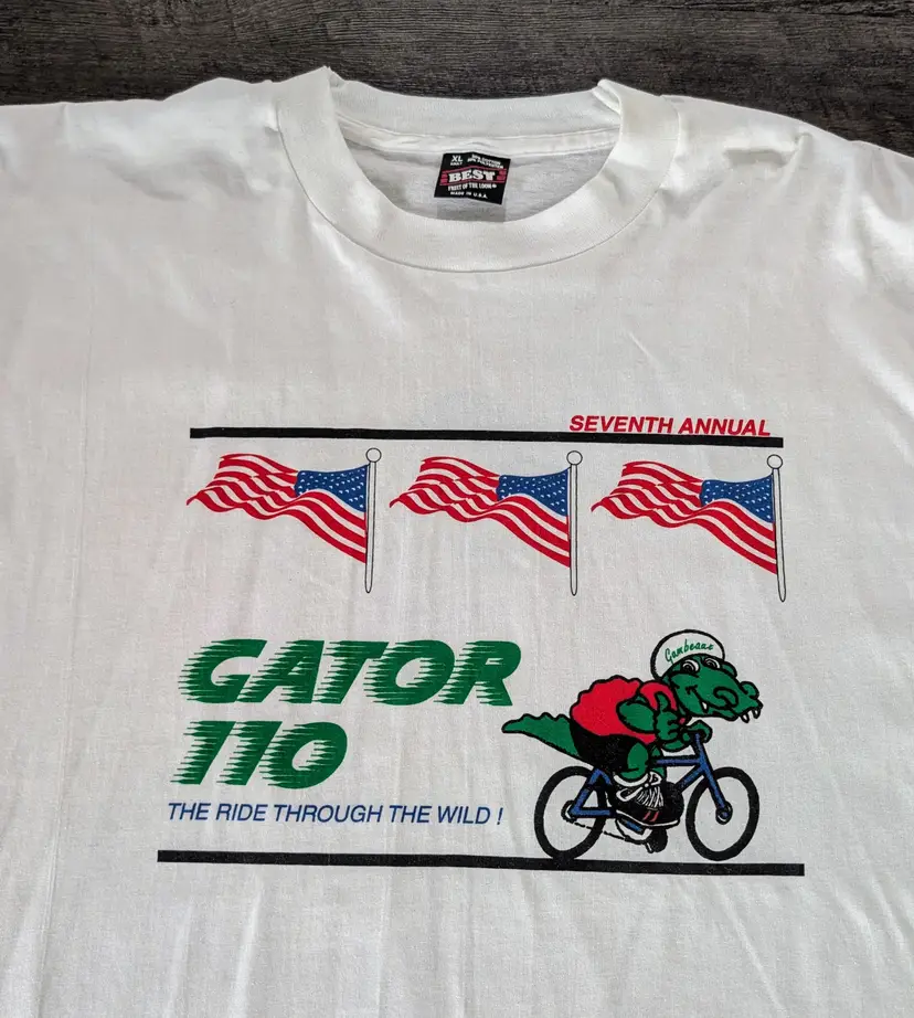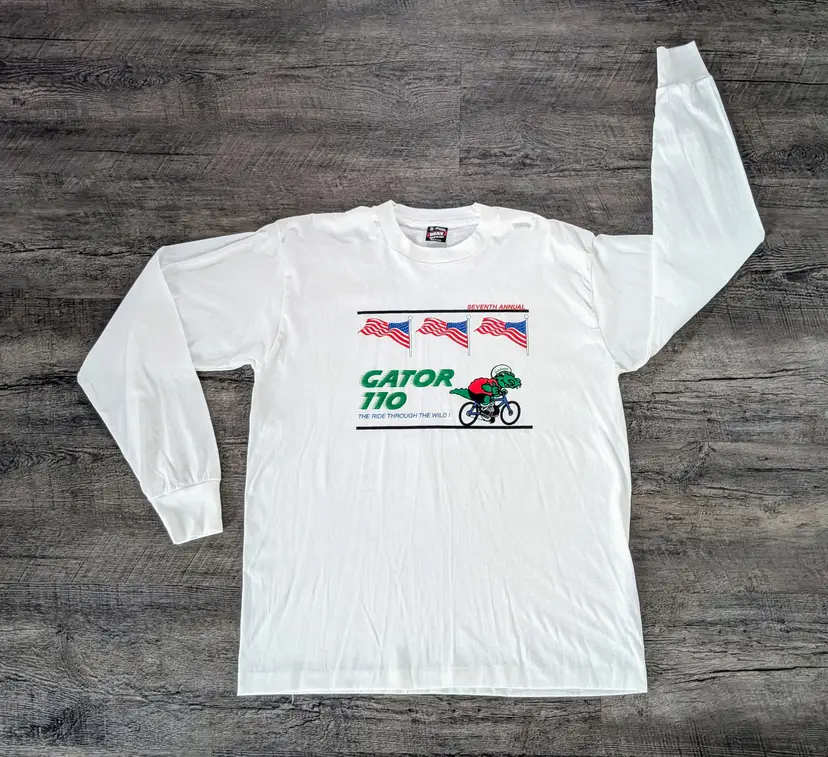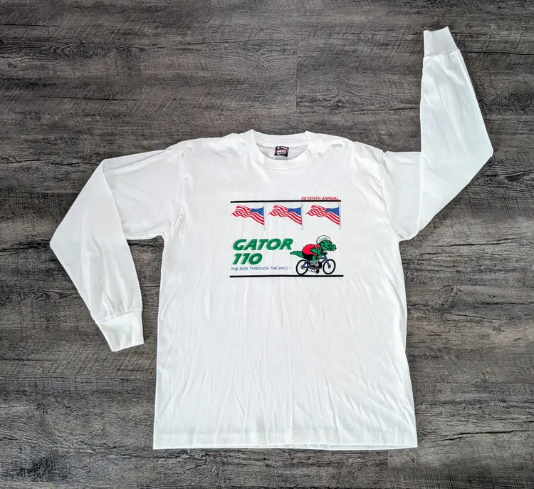 This listing is for a sweet vintage 7th annual Gator 110 Bicycle Race from Florida to Texas. Cool Gator graphics on both sides. Nice Long Sleeve Single Stitch Shirt size XL on Hanes Best tag 50/50 blend made in the USA. This is from the 1996 race. The Gator 110 is in their 36th year currently. Really cool vintage long sleeve. No rips or stains for being close to 30 years old. Measurements approx in inches: 29½" length 22½ chest 33" sleeve