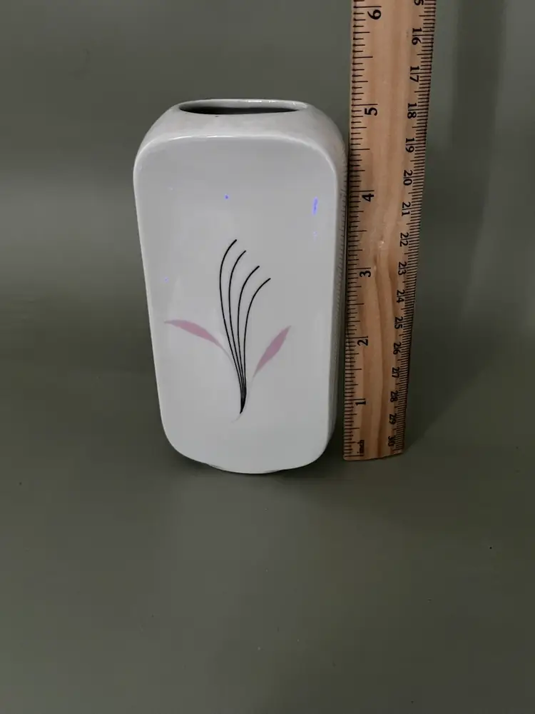Elegant vintage porcelain vase from East Germany (GDR), featuring a mid-century modern floral design in pink and black on a glossy white base. A beautiful 1950s–1960s collectible piece, perfect for retro home decor!