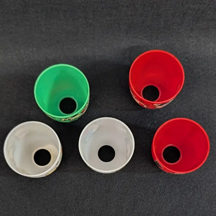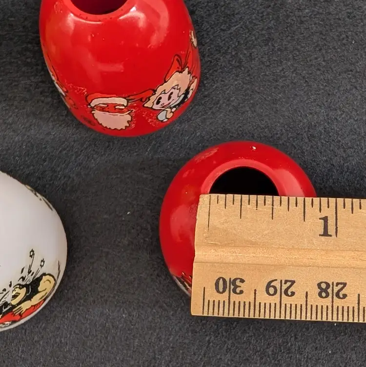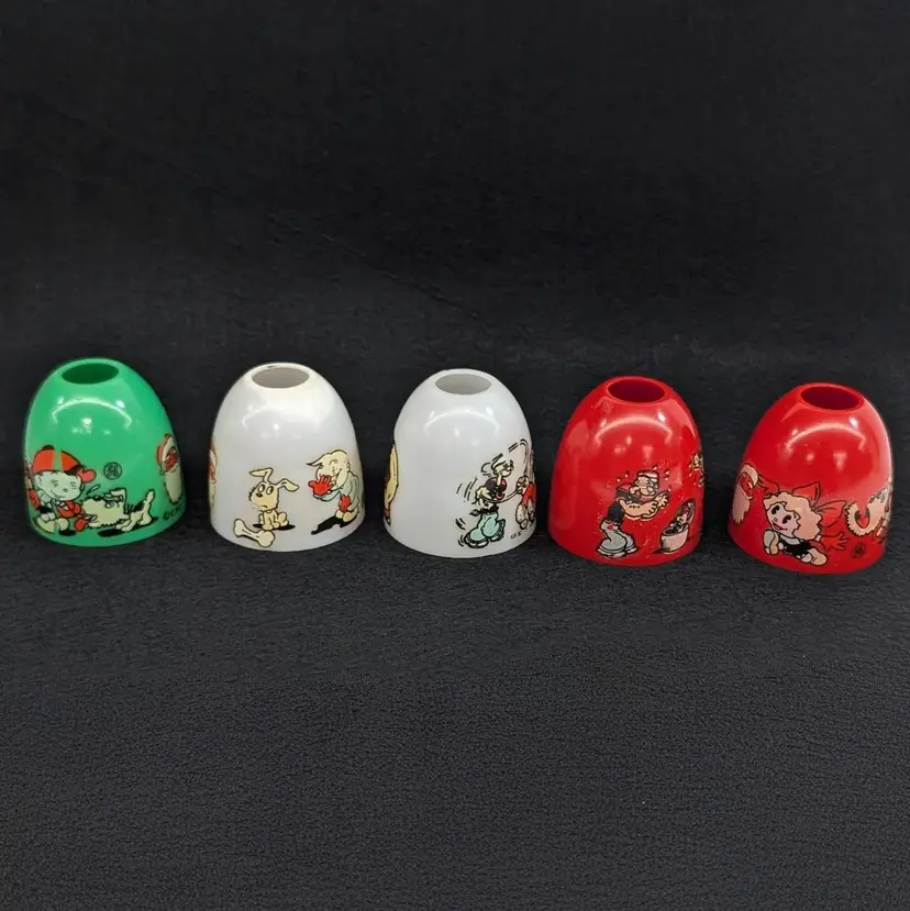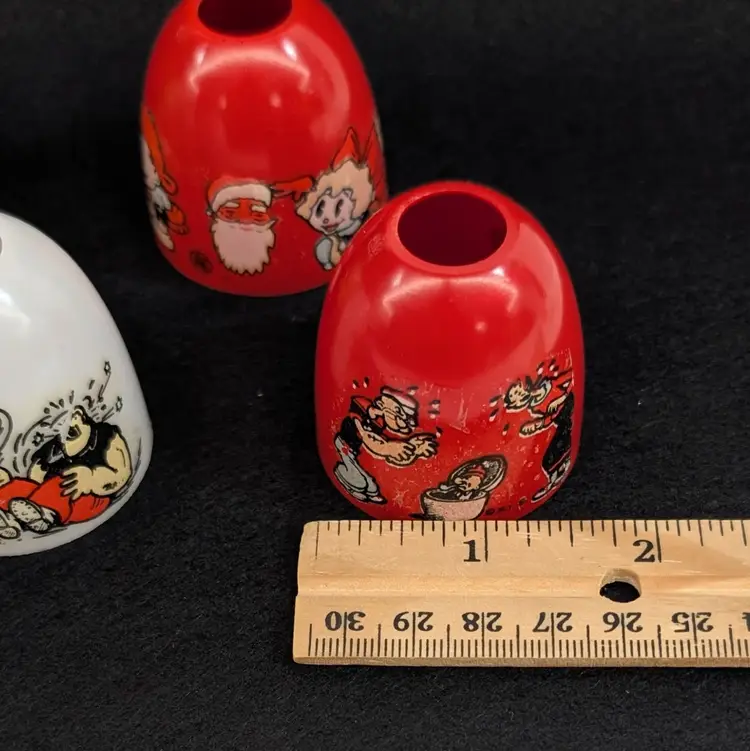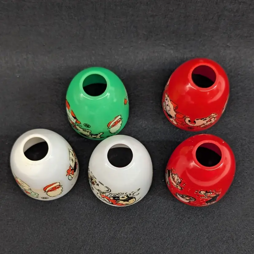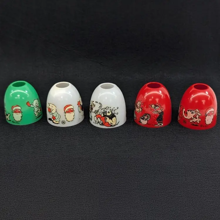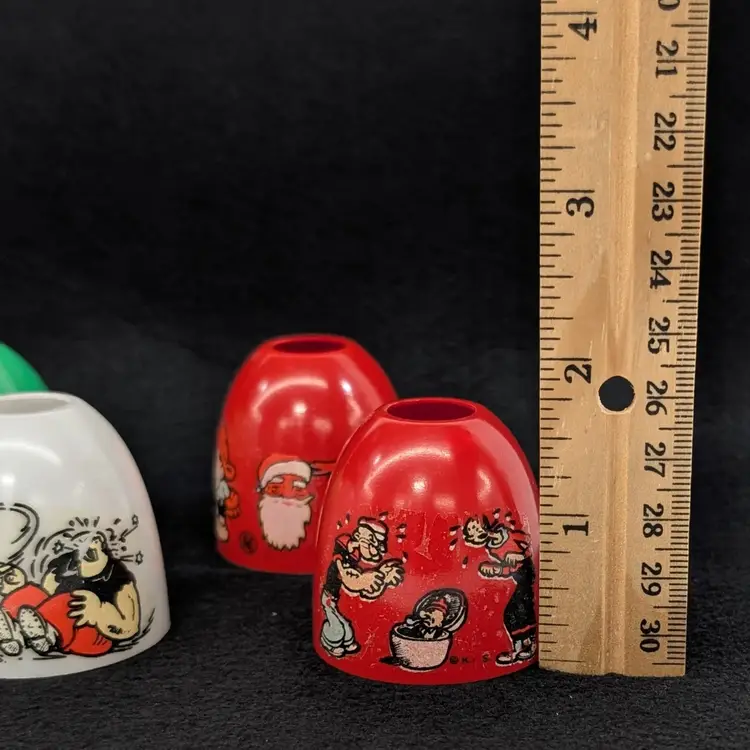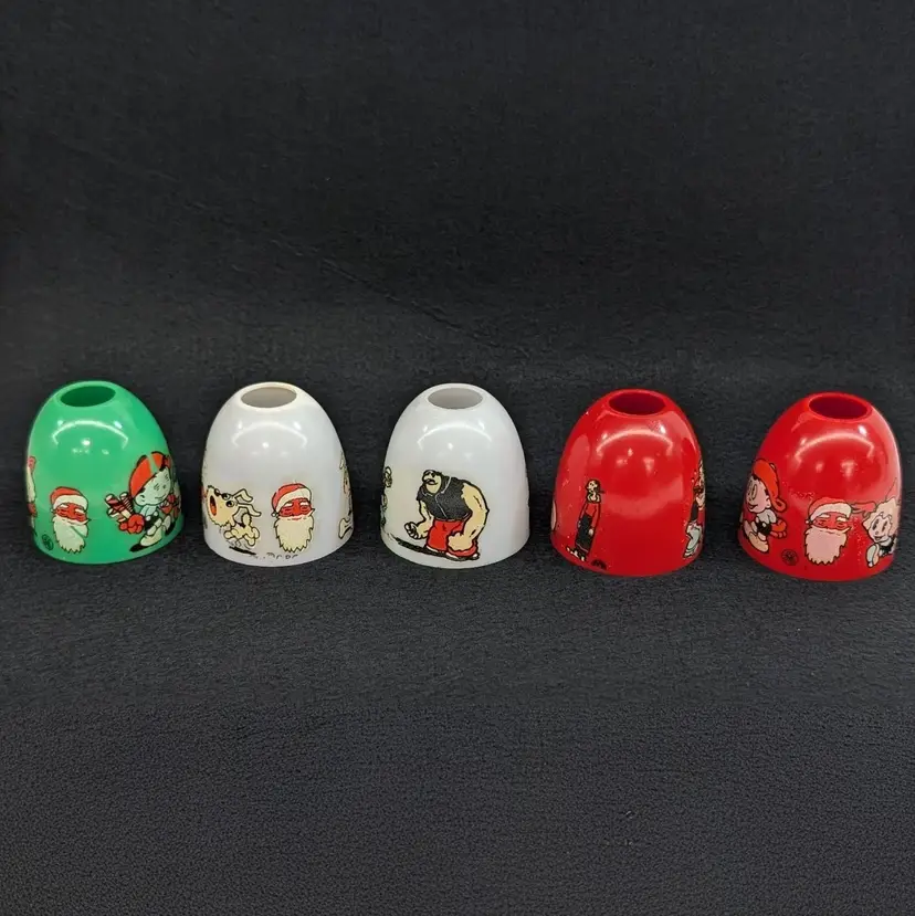 Set of 5 Christmas tree bulb light covers with assorted Popeye cartoon graphics. In used, vintage condition with minor wear to the graphics and one of the white ones has some discoloration at the top (see pictures). Measurements ~ 1.5 x 1.75"