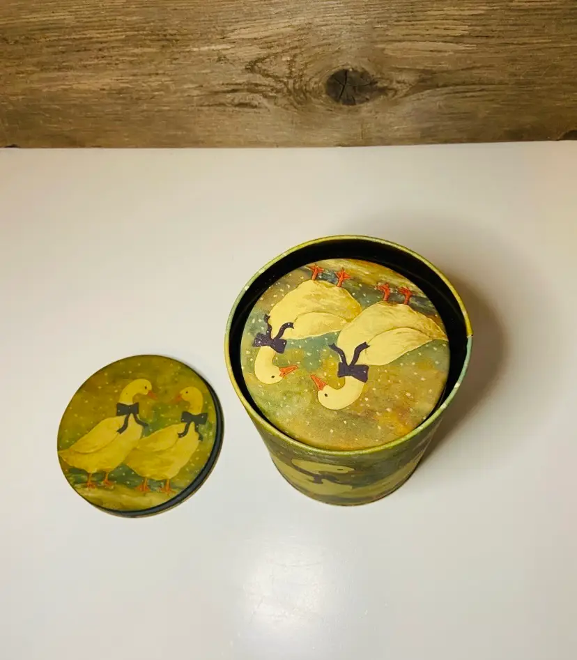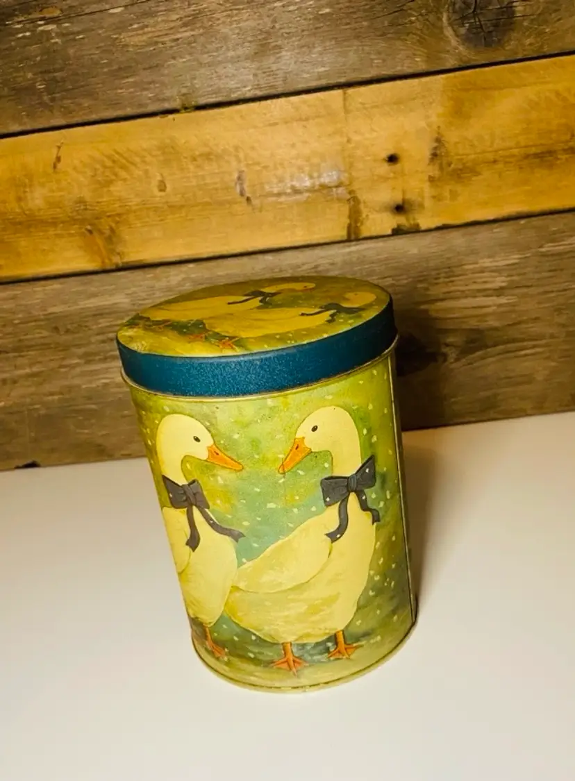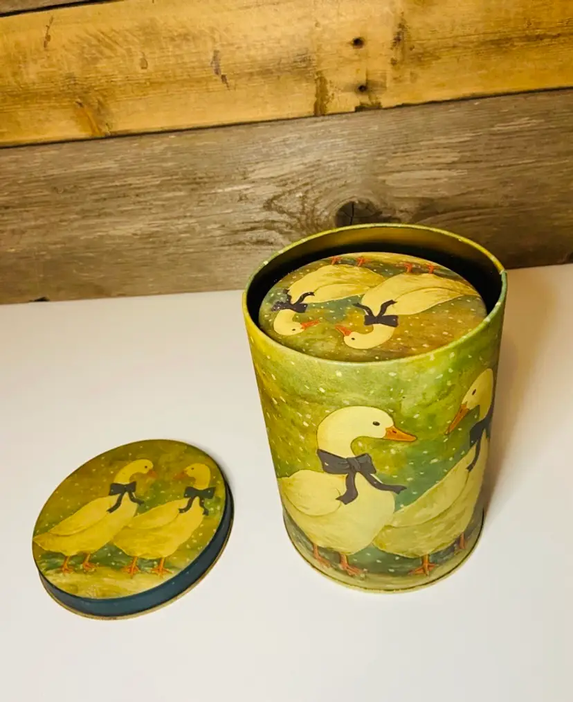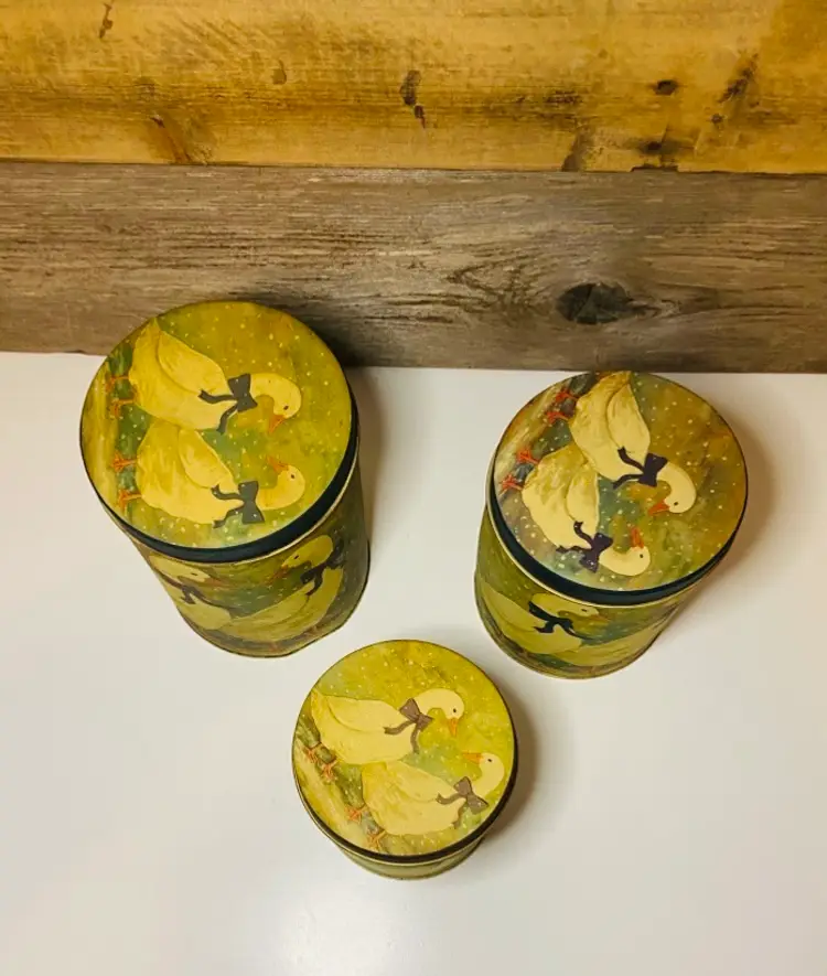 Set of 3 Vintage Geese in Winter Wearing Blue Bows Canister Set With Lids. 3 Sizes. Nesting Tins. These geese nesting tins bring classic country cottage and farmhouse charm to your kitchen or home décor. This set nests neatly for display or storage while adding a cozy, nostalgic touch to open shelves or countertops. Perfect for kitchen storage, these tins can be used to hold tea bags, cookies, dry goods, or small household items. In good used condition. The largest one does have a dent on the bottom (see pic).
