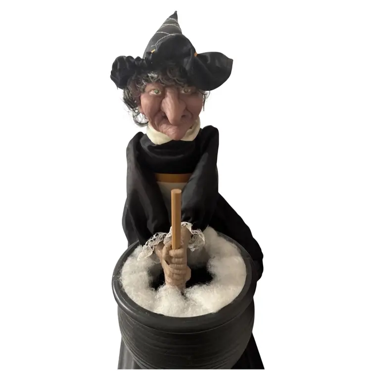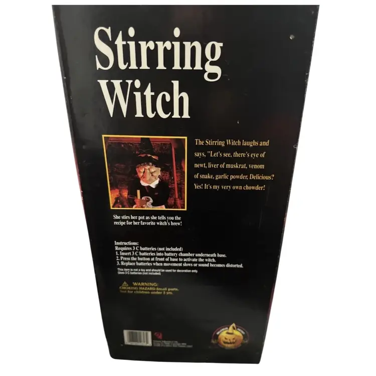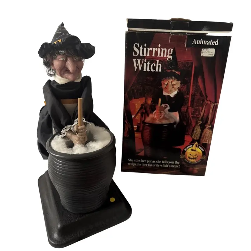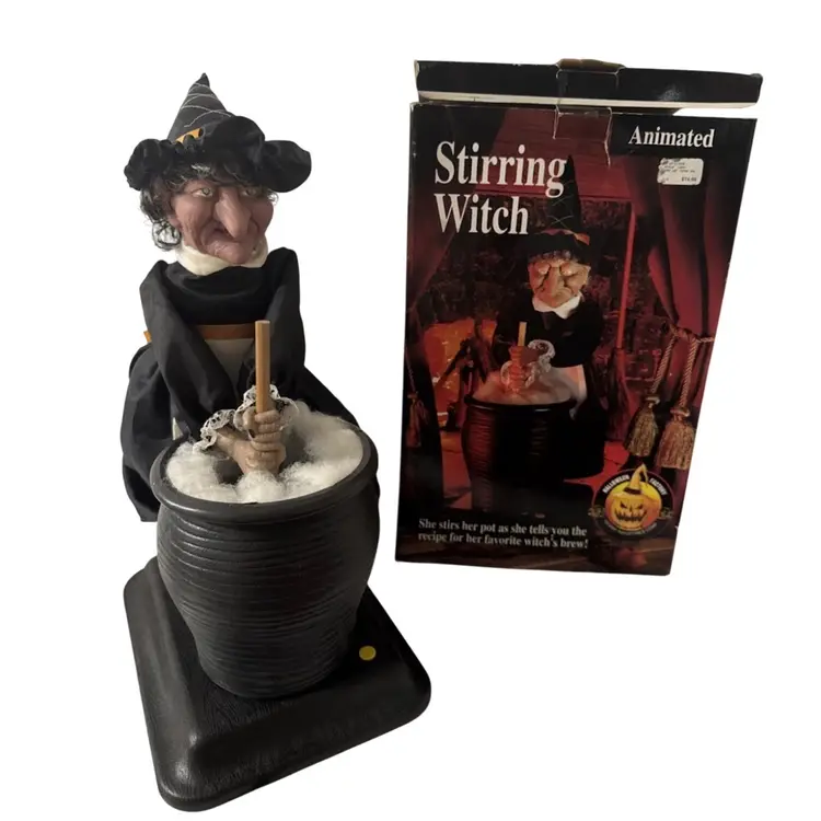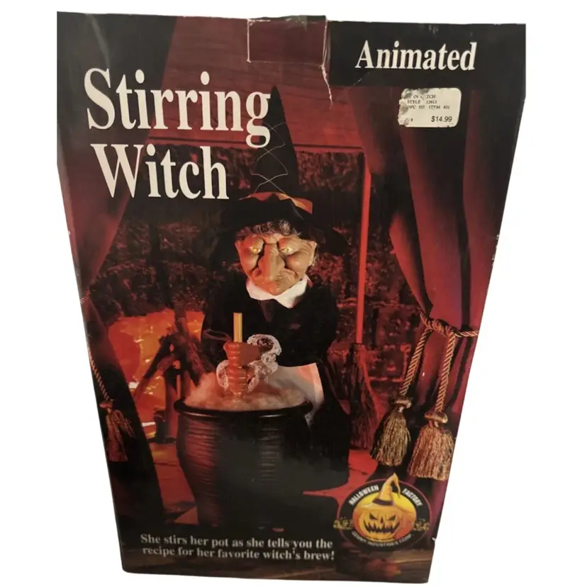 It is an animated prop designed to light up and speak, telling the recipe for a "witch's brew"