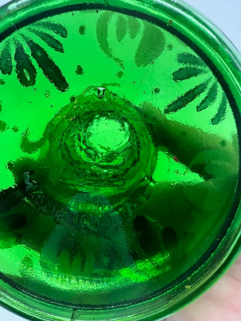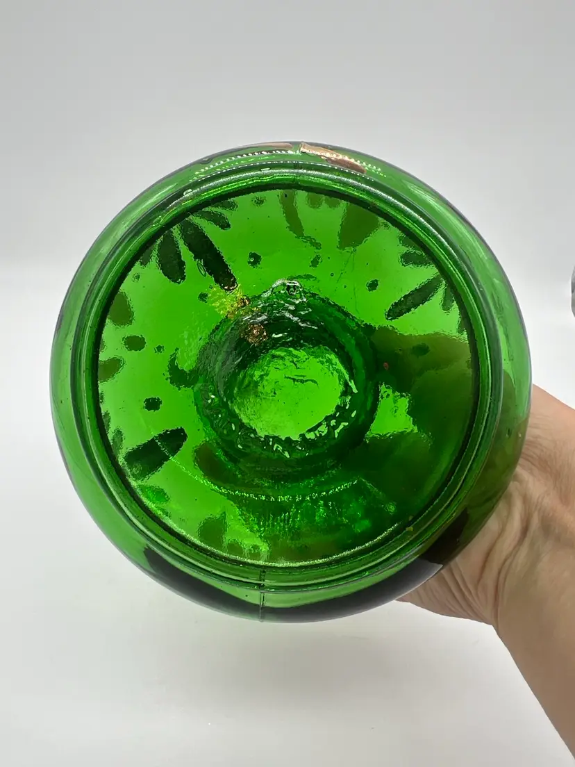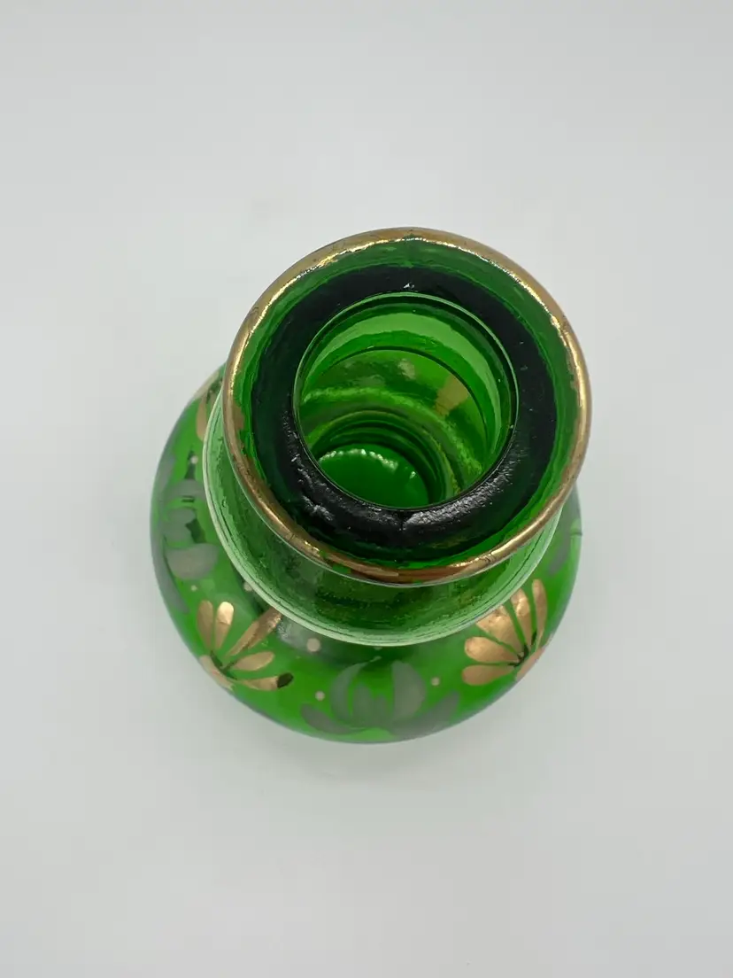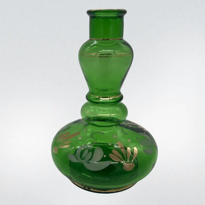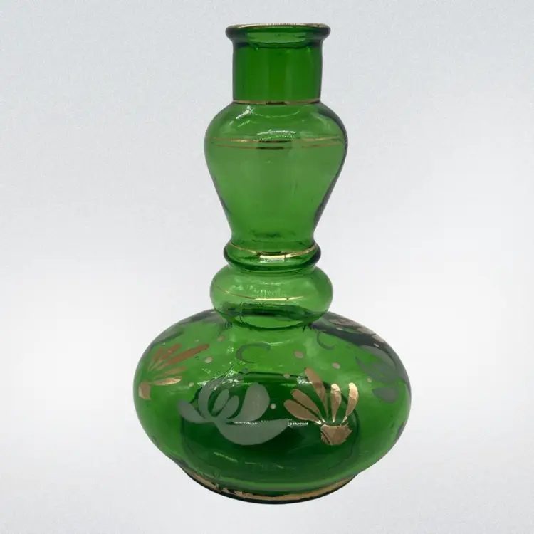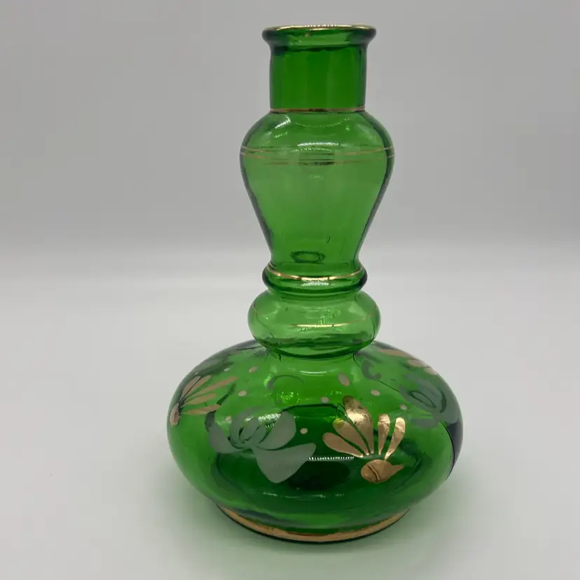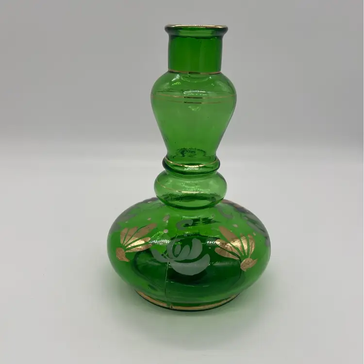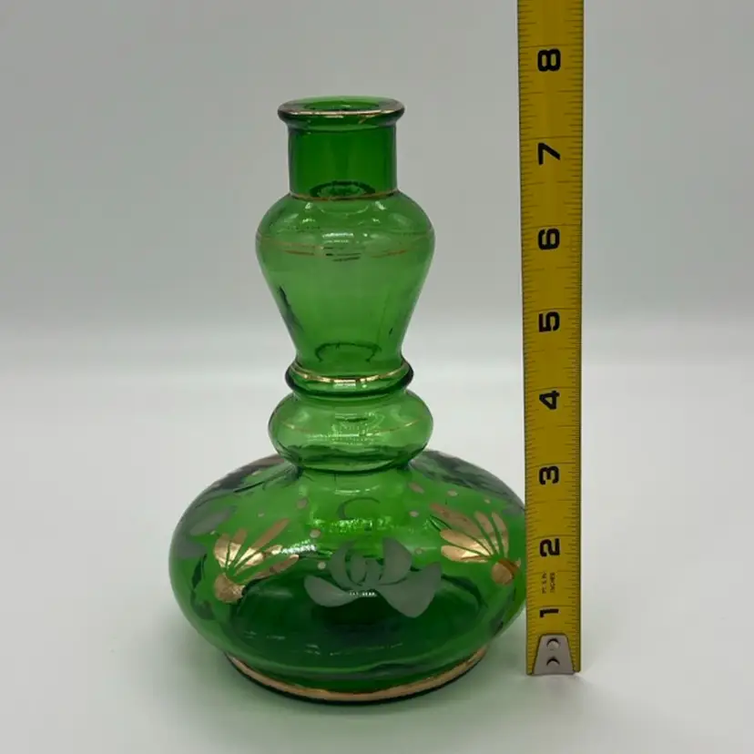 Measures about 7 1/2” tall. Good condition. Missing stopper. No chips or cracks. There is wear to gold as pictured.