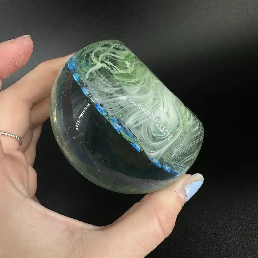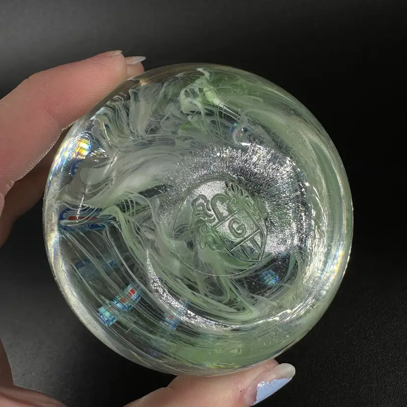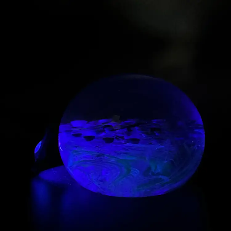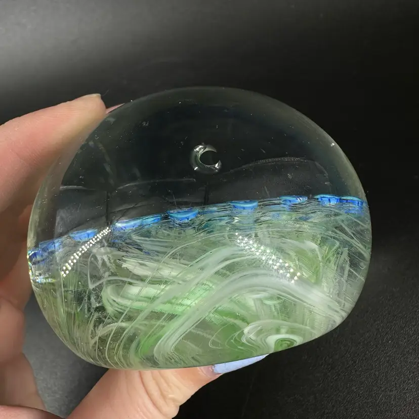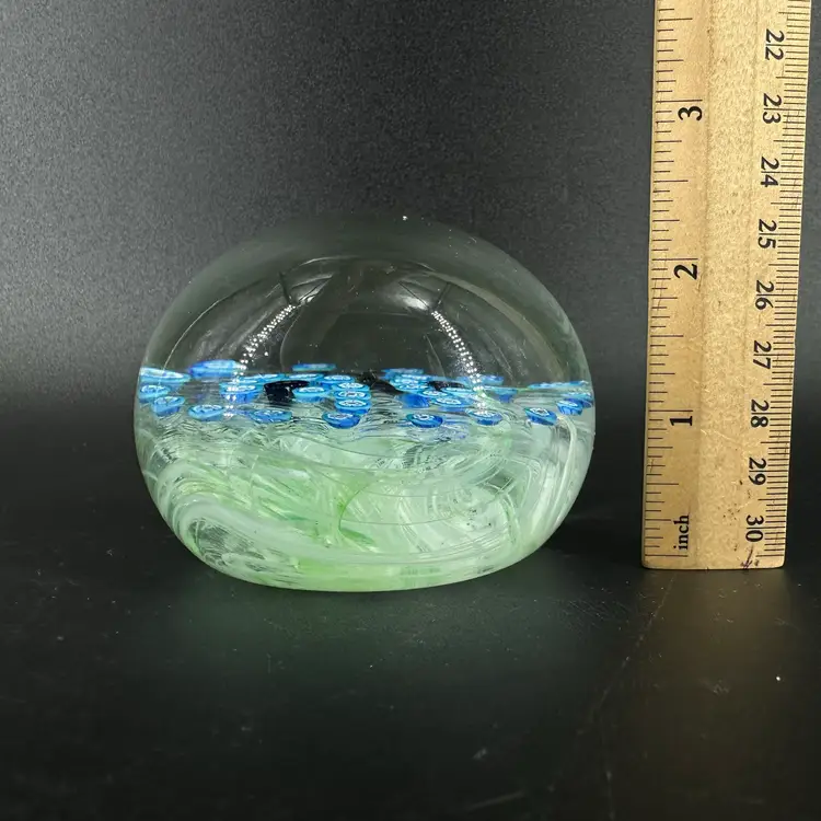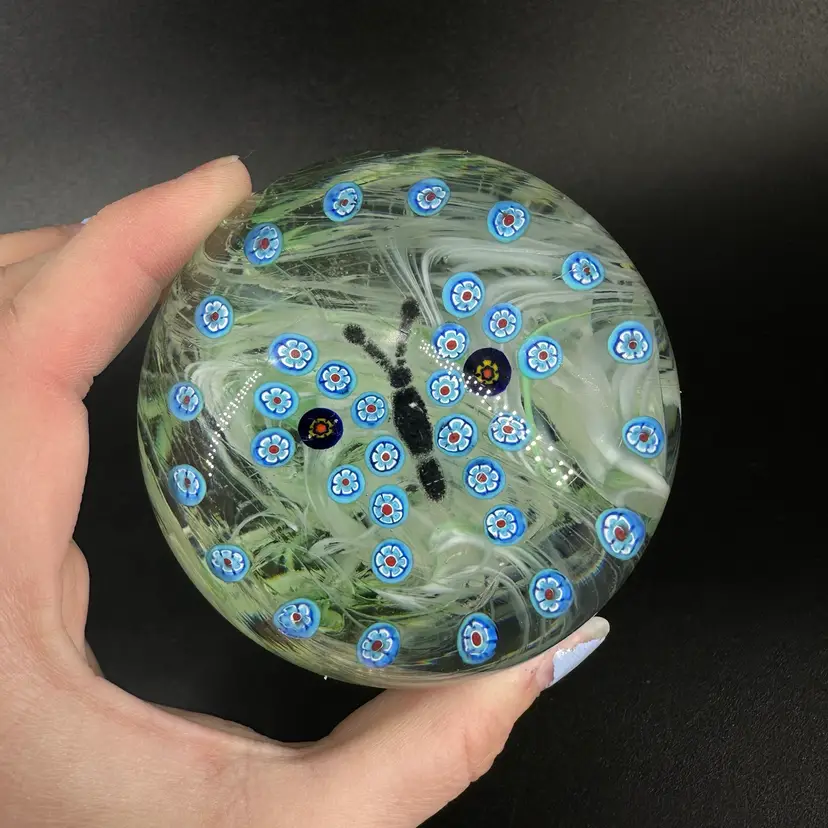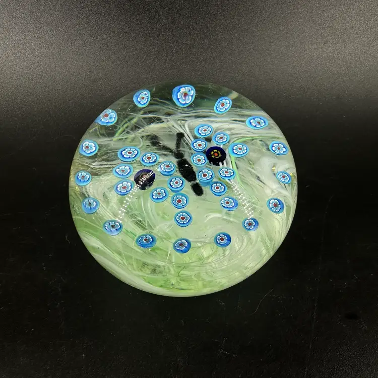 Vintage Gentile art glass paperweight featuring millefiori designs/butterfly and green/white swirls. There is a tiny bit of glow of green swirls under UV light. Measures approximately 2.75” tall by 3” wide. No cracks. Small bruise. See photos. Marked on bottom.