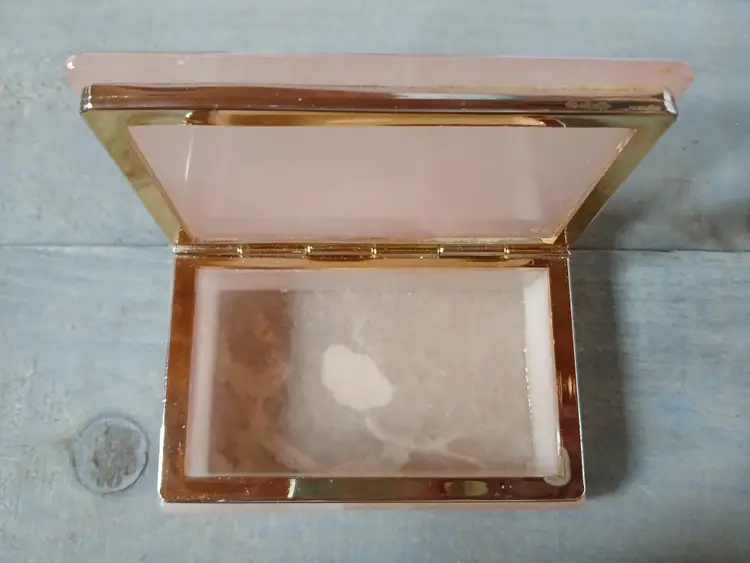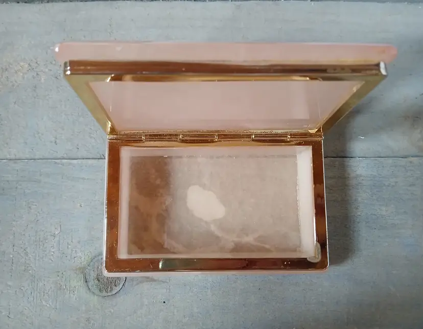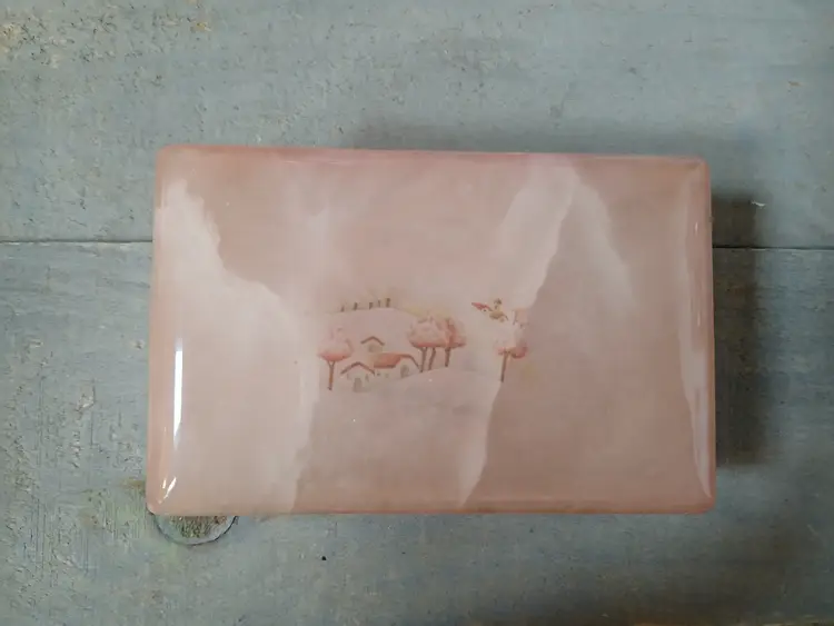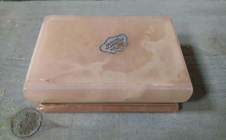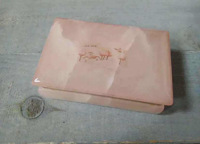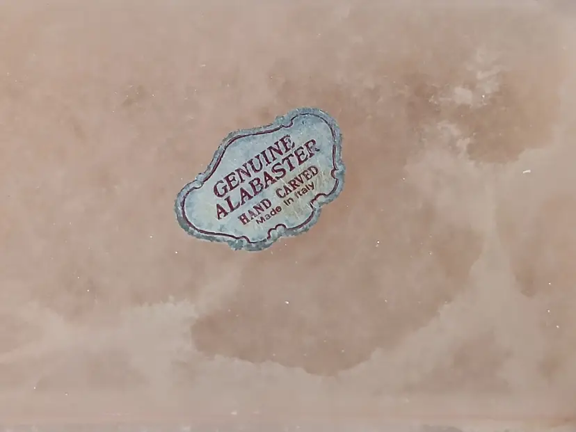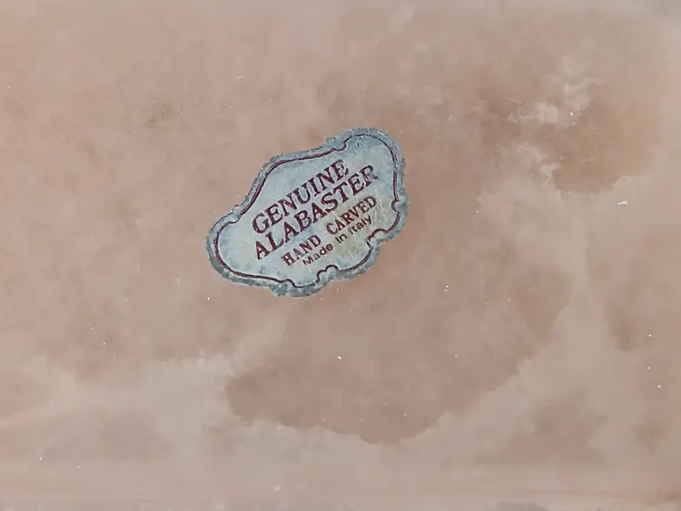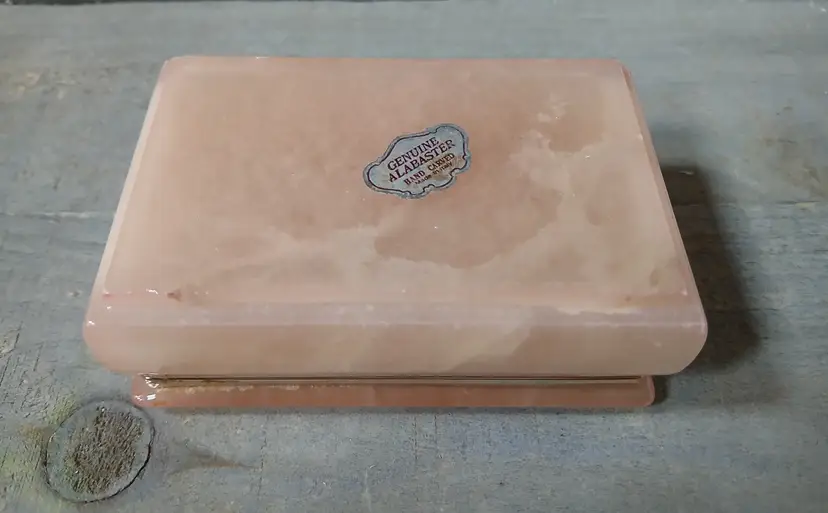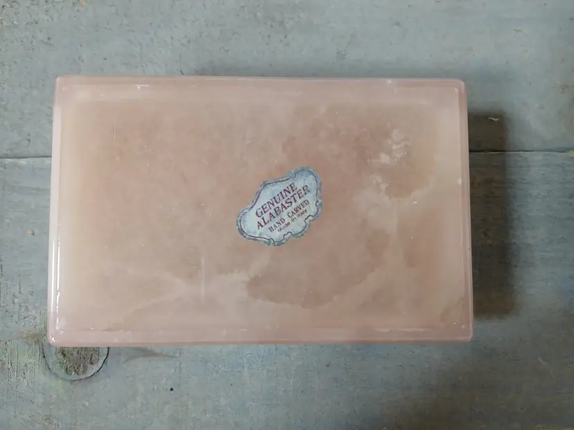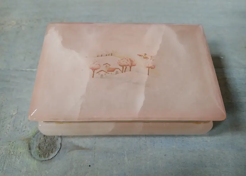 Lovely vintage peach alabaster carved trinket box with hinged lid. Delicate painted landscape scene on cover. Corners of box and lid are beautifully rounded. Made in Italy. Original sticker on bottom. Measures approximately 4.25" long x 2.75" wide x 1.6" high. In very good pre-owned condition, with minimal wear.
