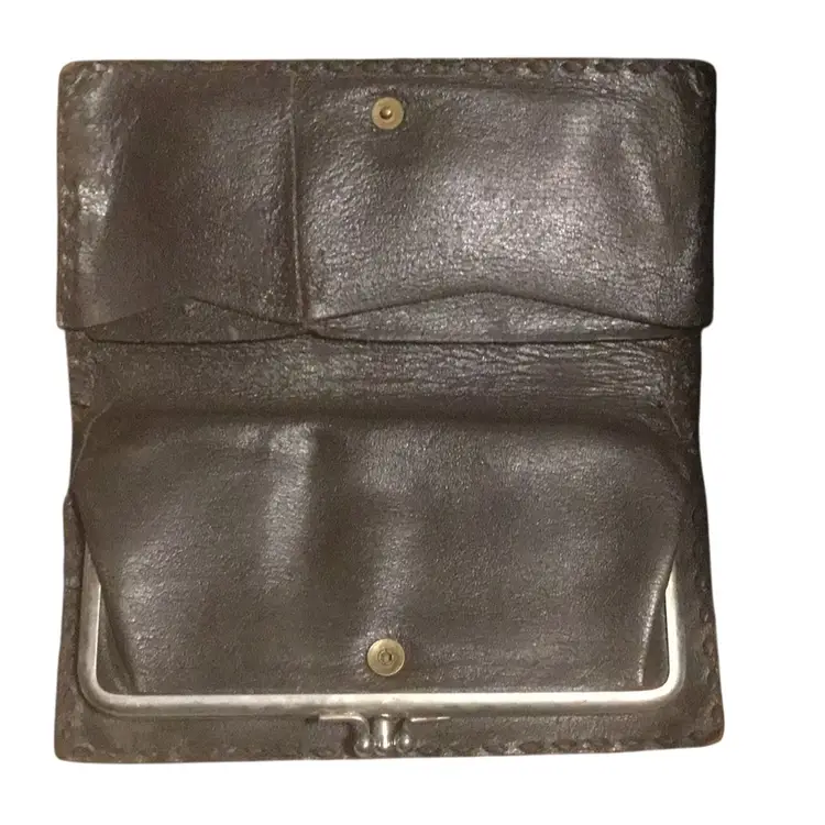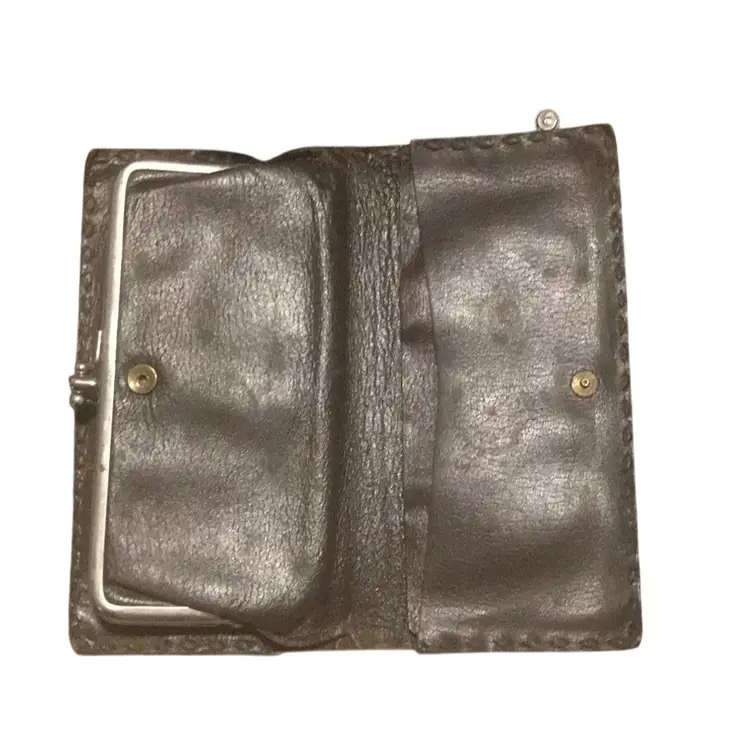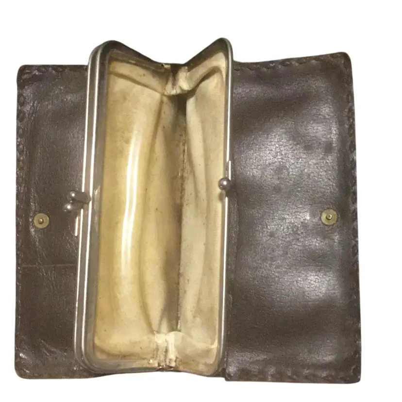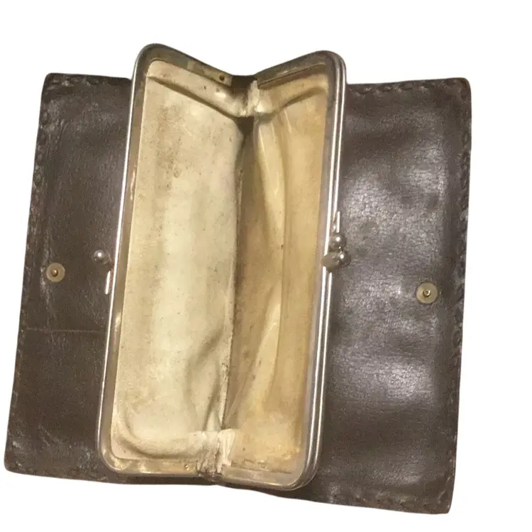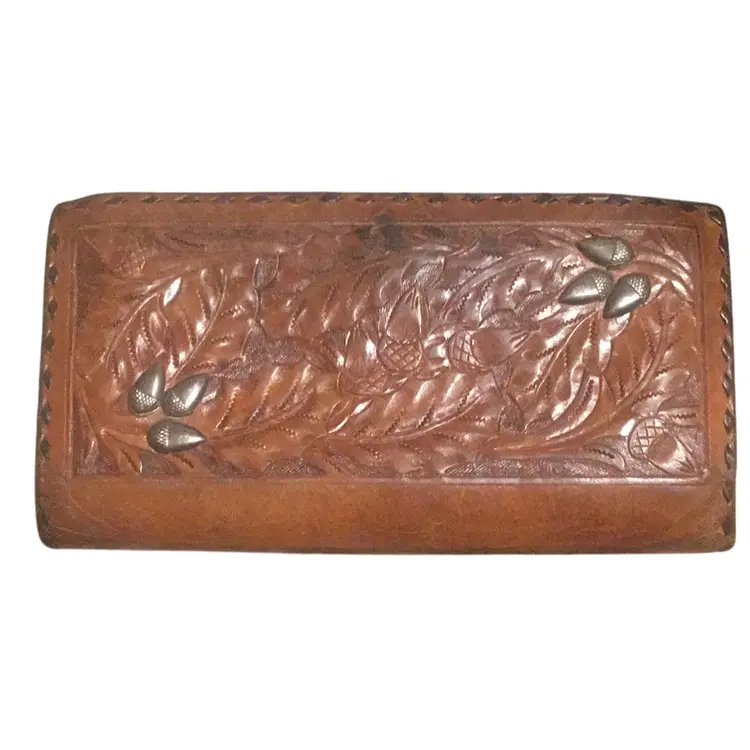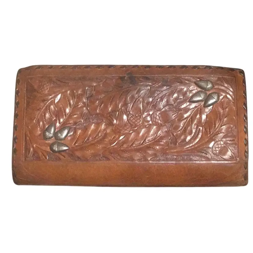 a vintage hand-tooled leather clutch with the name "MARY" embossed on the front. It features a kiss-lock closure and decorative silver accents. Type: Vintage hand-tooled leather clutch wallet. Material: Genuine leather with tooling. Design: Floral and leaf patterns, with the name "MARY" embossed. Features: Kiss-lock closure, silver accents. Style: Western, retro, bohemian. Age: Likely vintage, possibly 20-30 years old or older. Origin: Could be handmade, possibly from Mexico. Usage: Suitable as a clutch or wallet.