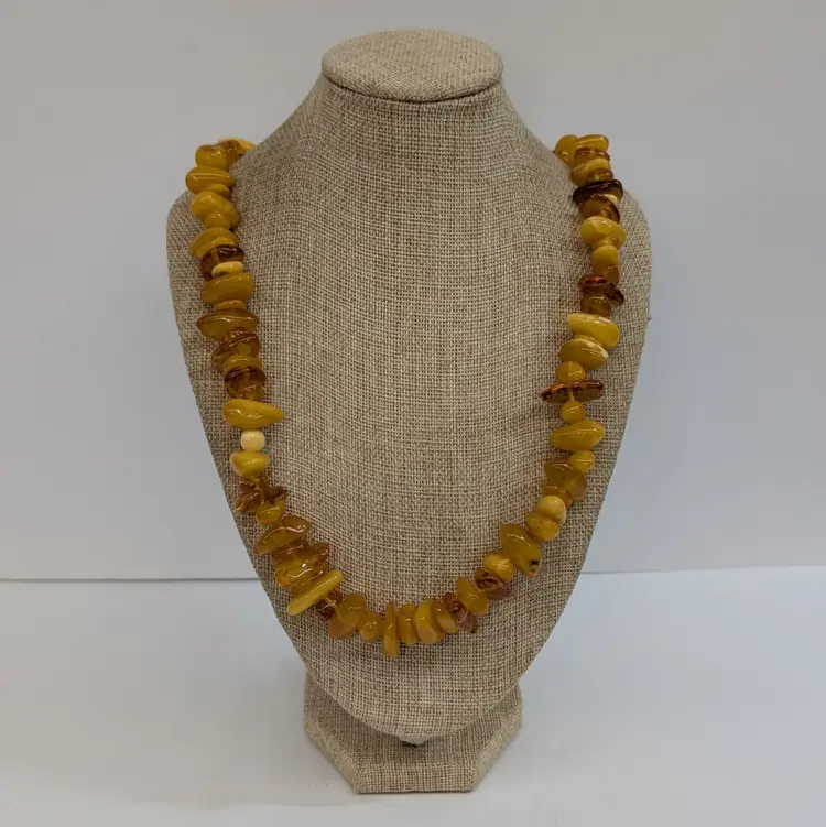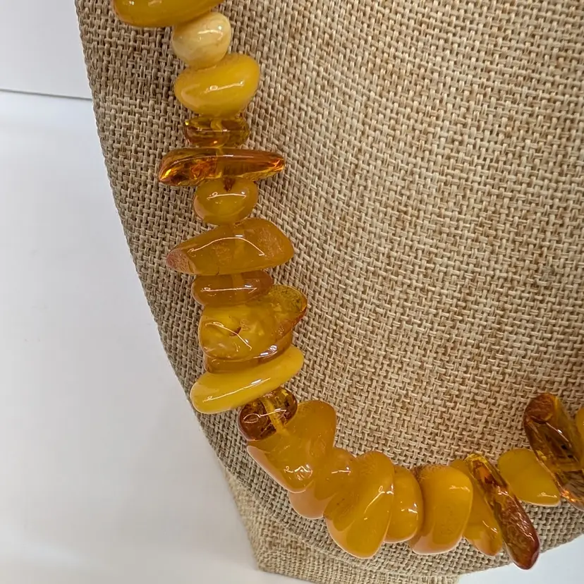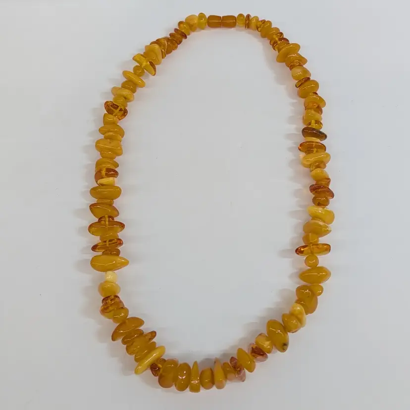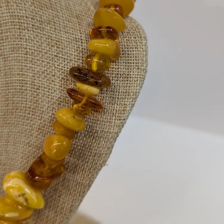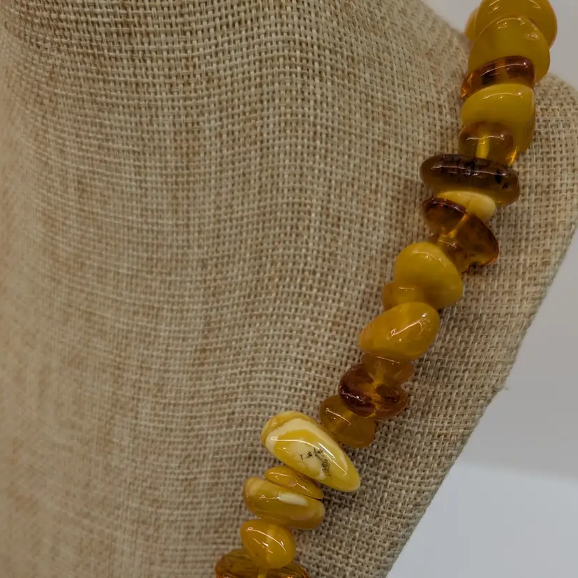 Beautiful, single stand amber necklace with a nice mix of transparent and egg yolk tumbled beads. In nice, used condition with a hidden barrel clasp. Measurements 25" long and 73 grams