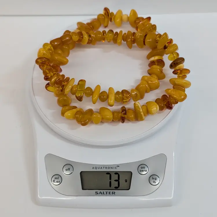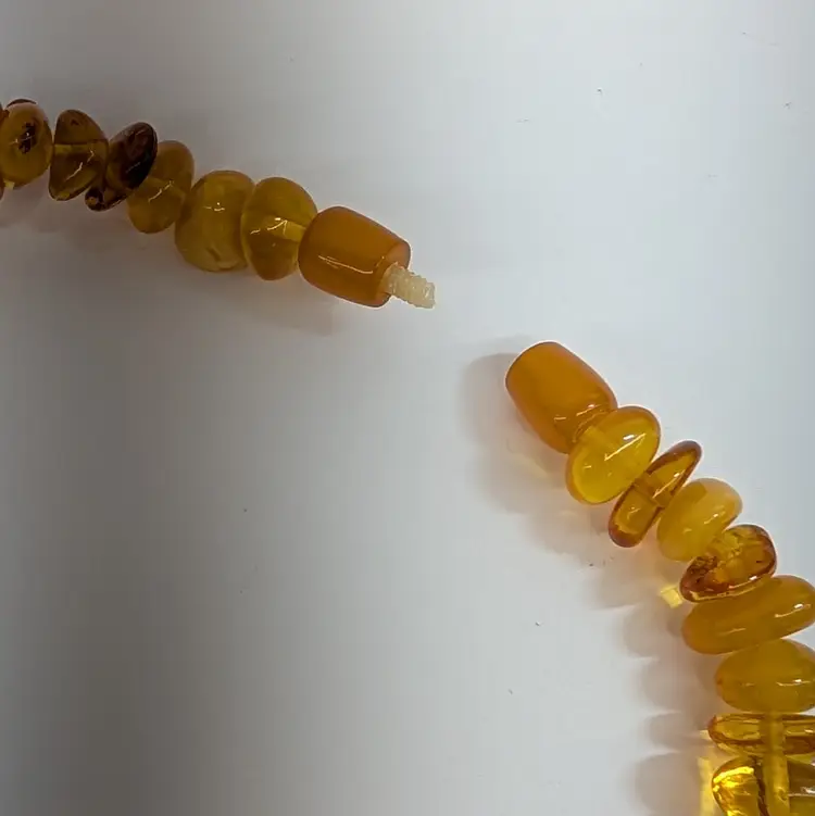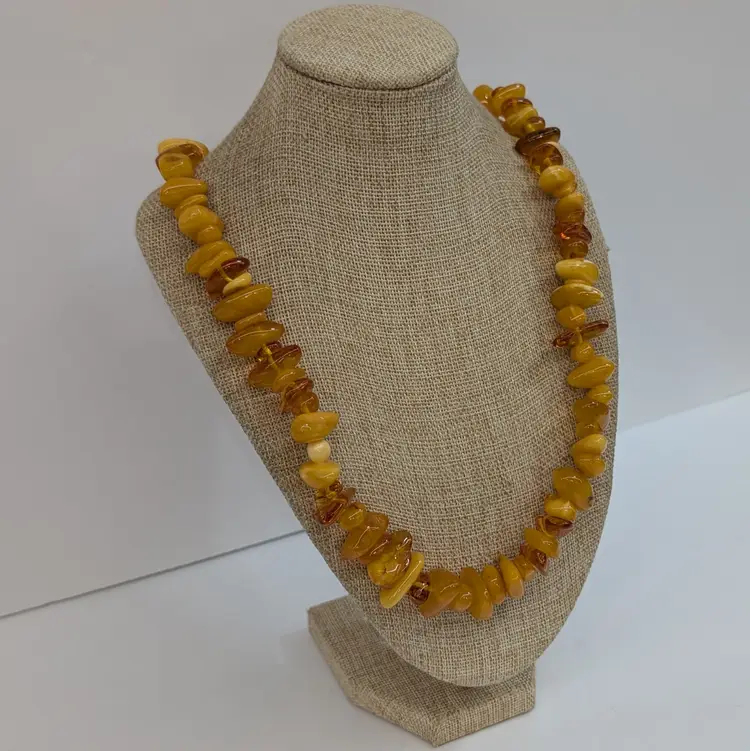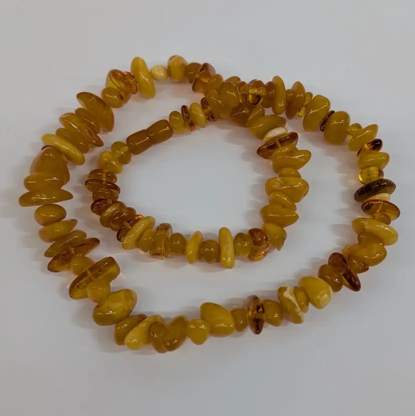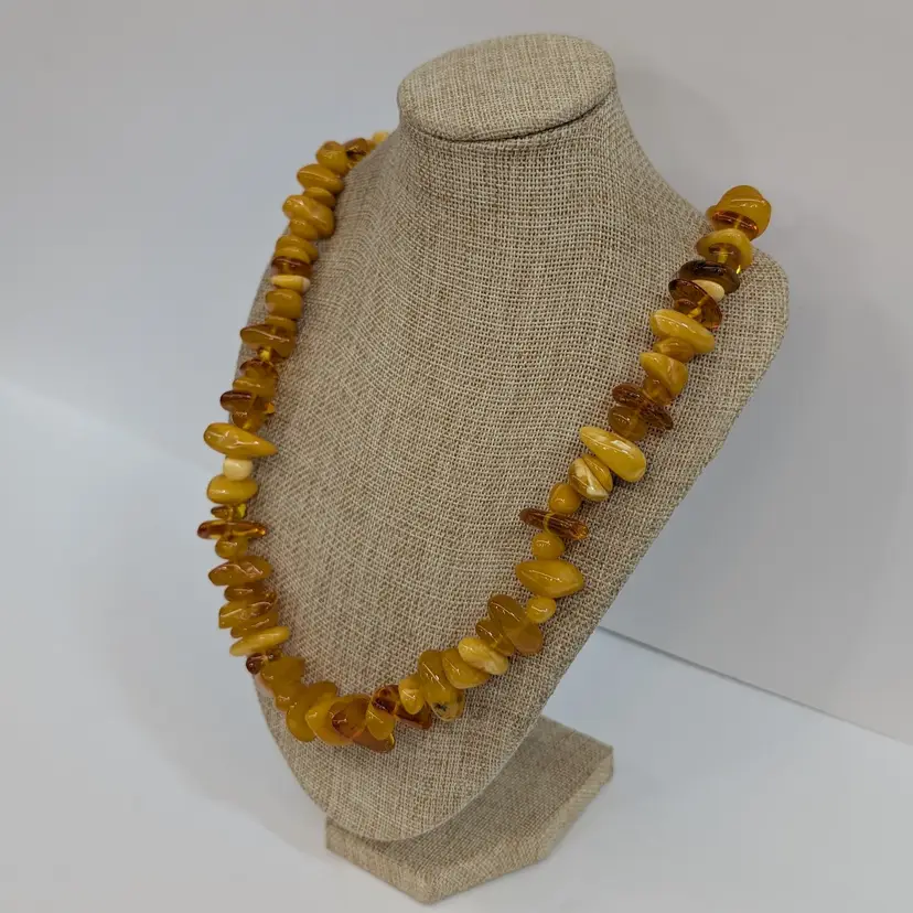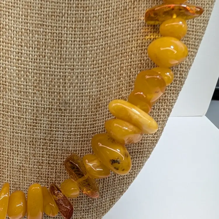 Beautiful, single stand amber necklace with a nice mix of transparent and egg yolk tumbled beads. In nice, used condition with a hidden barrel clasp. Measurements 25" long and 73 grams