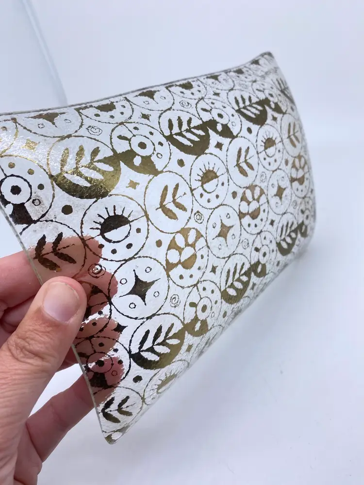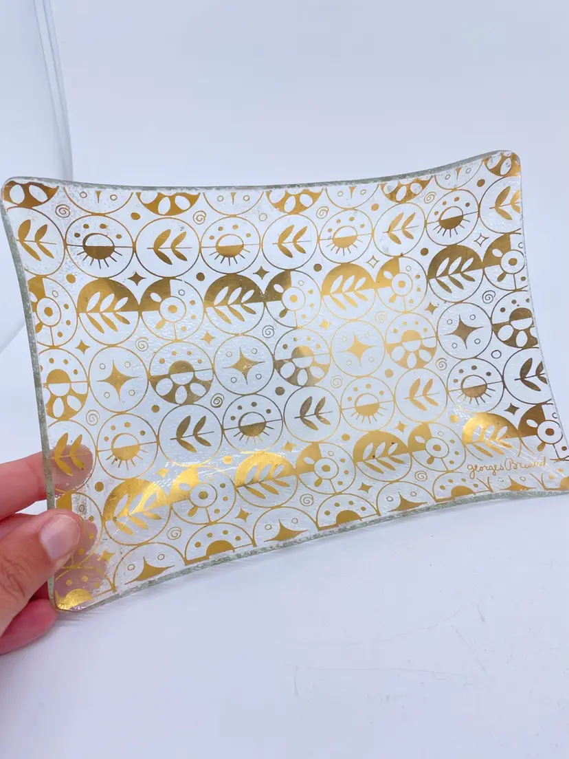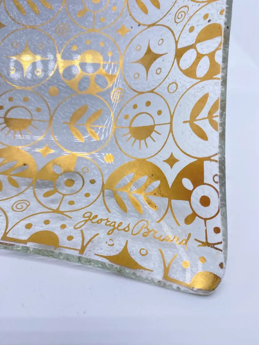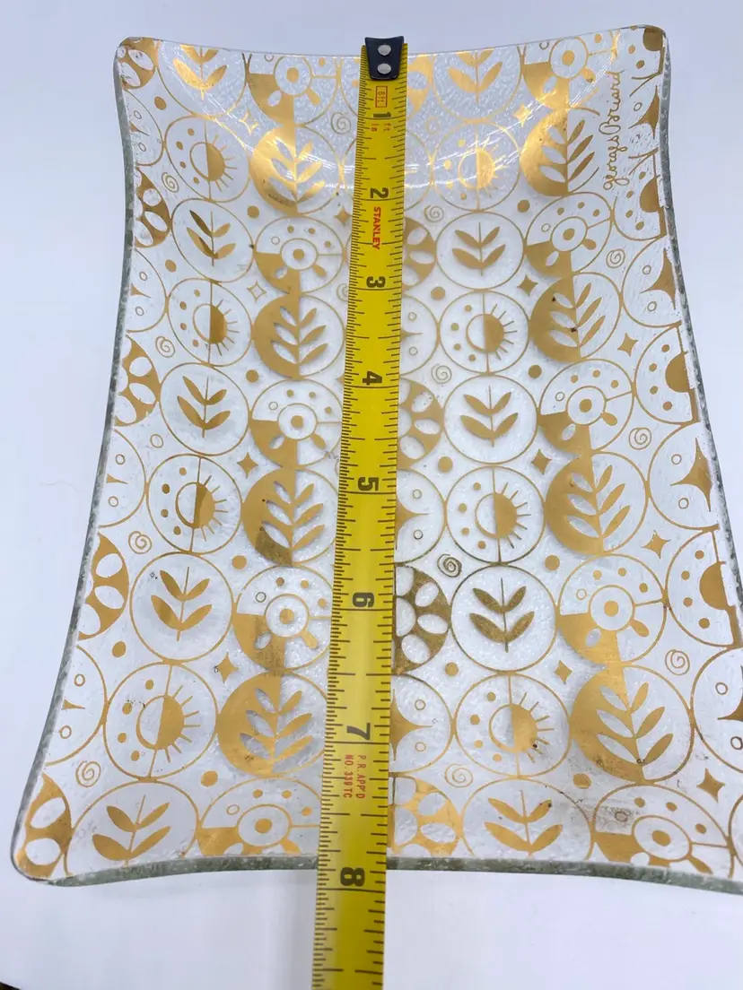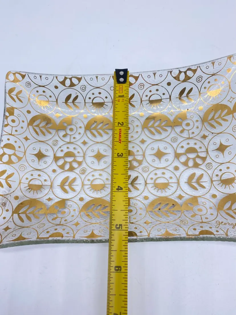 Rectangular shaped with 22kt gold detailing. Signed on bottom right corner. No chips or cracks.