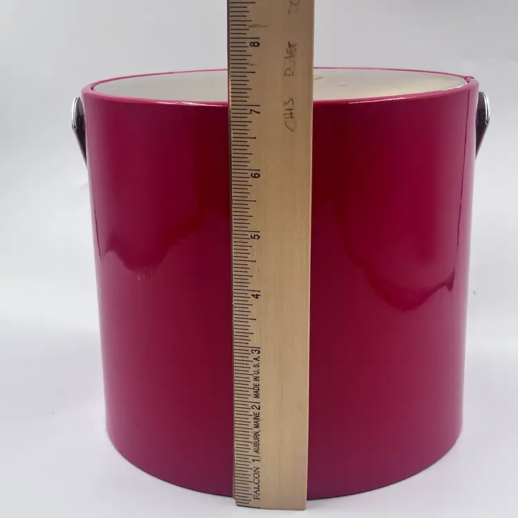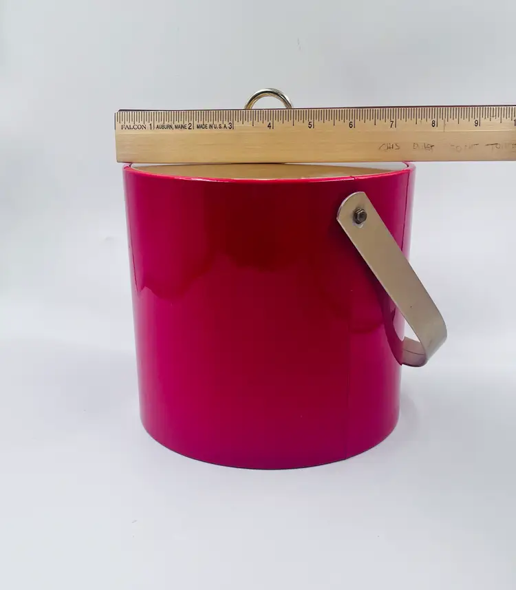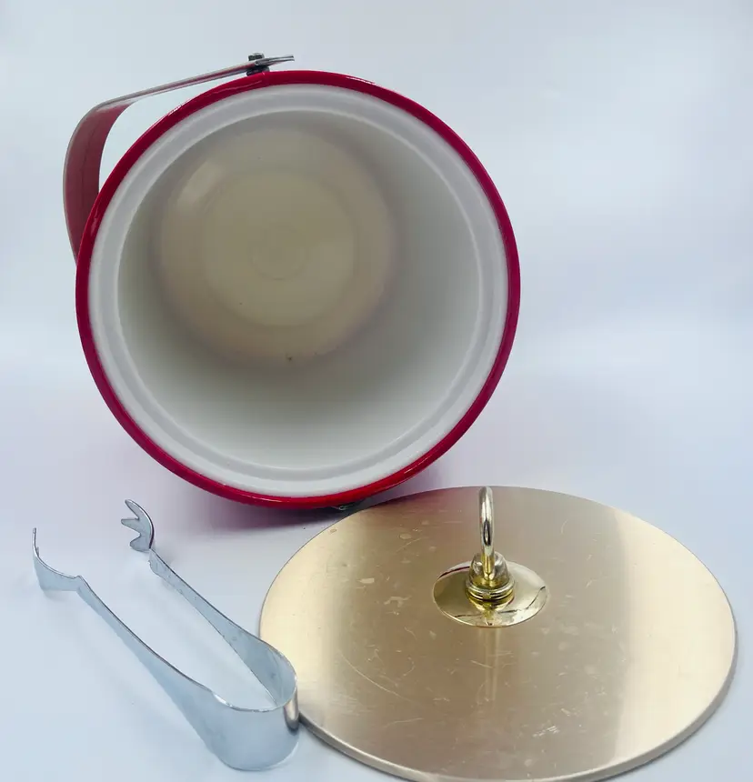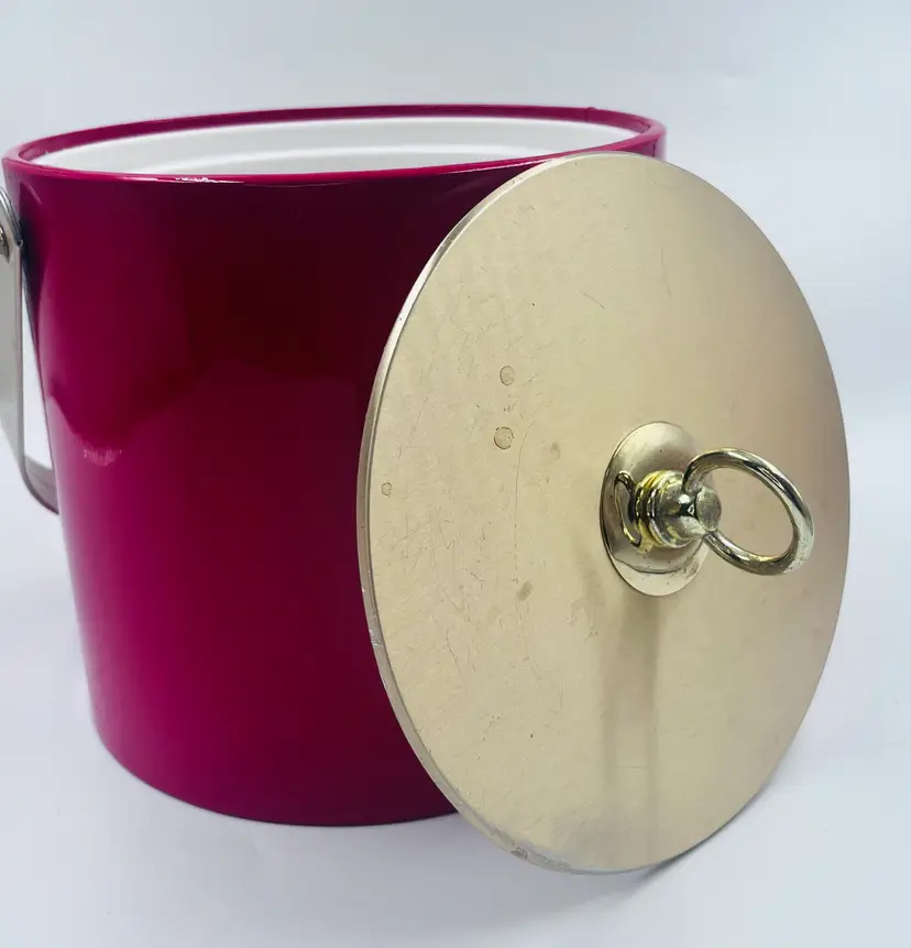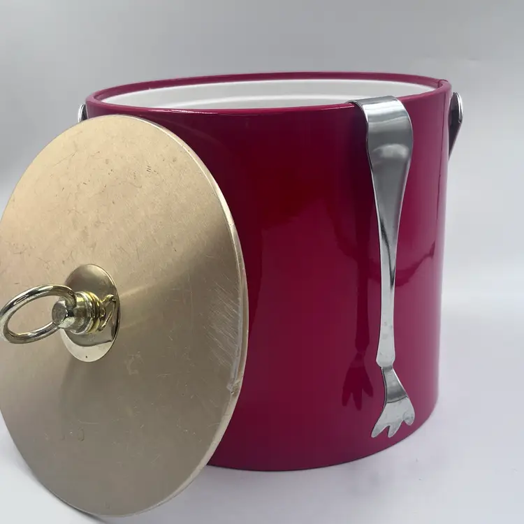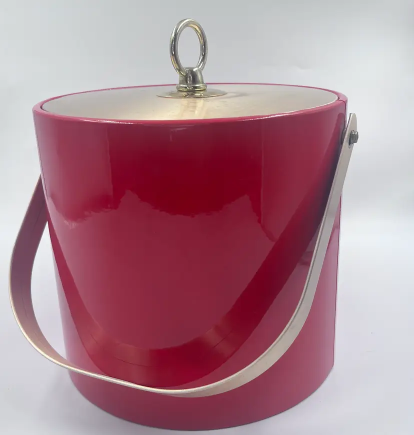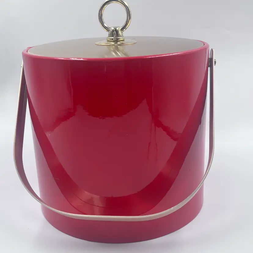 Bring bold mid-century flair to your bar with this fabulous red ice bucket designed by Georges Briard, circa 1960s-1970s. Featuring a glossy red vinyl exterior, gold-tone lid with ring handle, plastic insulated interior, and matching chrome tongs, its a showstopper for any retro cocktail setup. Marked on the bottom with the classic Georges Briard signature Light surface wear and one small ding on lid edge (see photos) Overall ver good vintage condition. Lid fits tight.