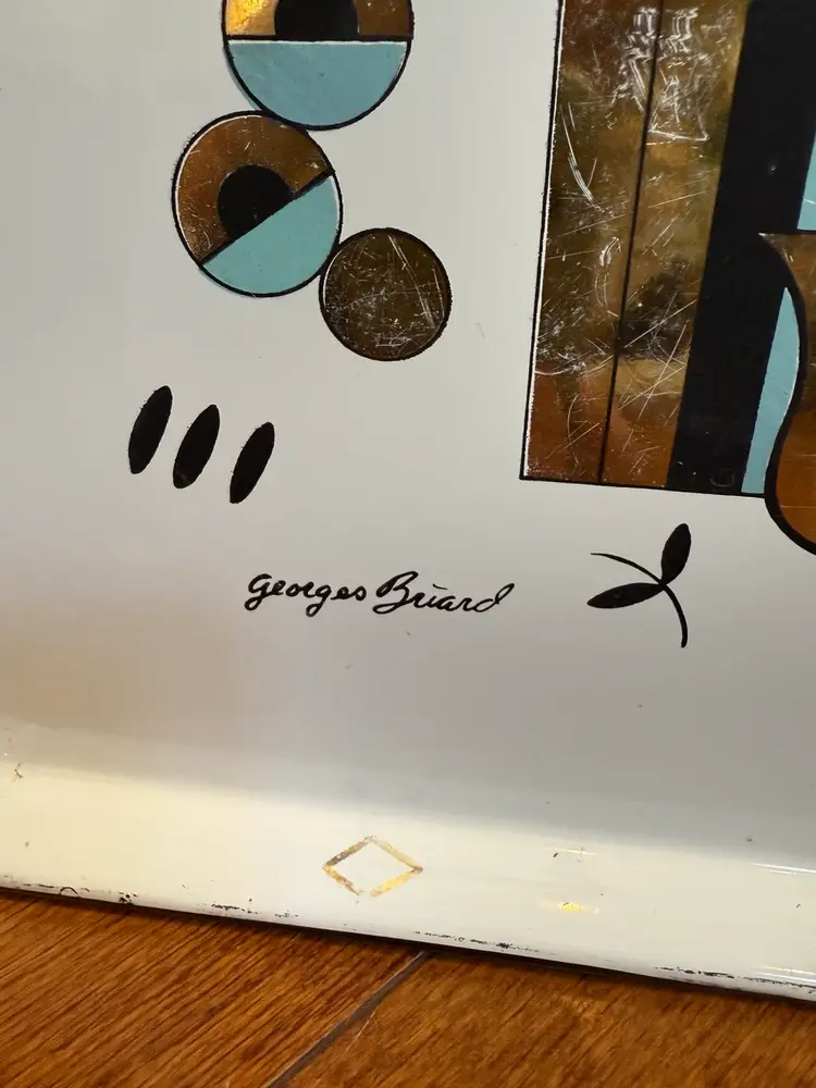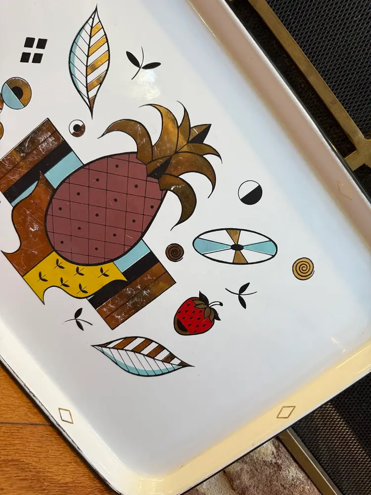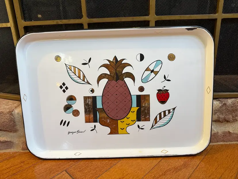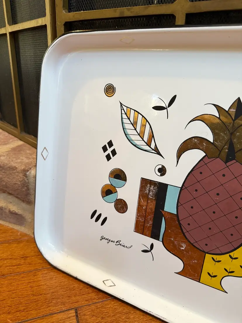 Crafted in the 1950s–60s, this enamel-coated metal tray is signed by Georges Briard, the celebrated designer known for his iconic mid-century housewares and barware. Perfect for entertaining, cocktail parties, or simply as a statement piece of retro décor. • Designer: Georges Briard • Era: Mid Century Modern, c. 1950s–60s • Material: Enamel-coated metal • Design: Pineapple with geometric and fruit motifs • Condition: Good vintage condition. Some scratches and edge wear consistent with age and use (see photos for details). Still vibrant and full of mid-century charm.