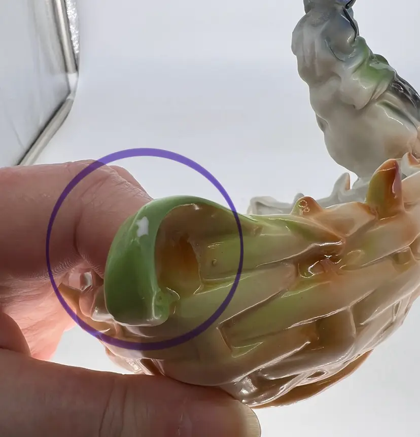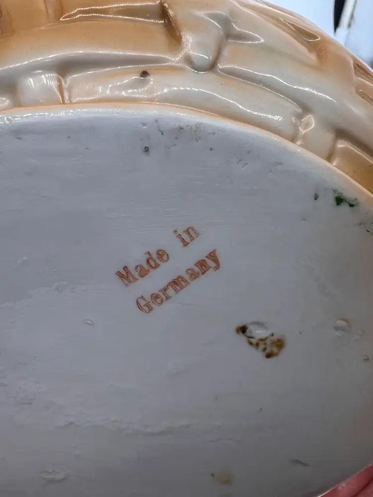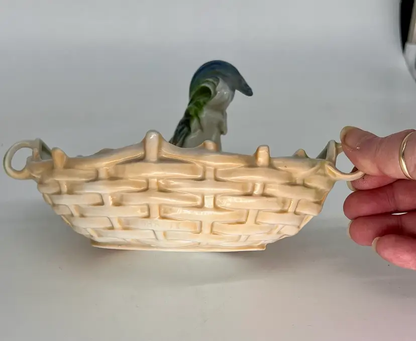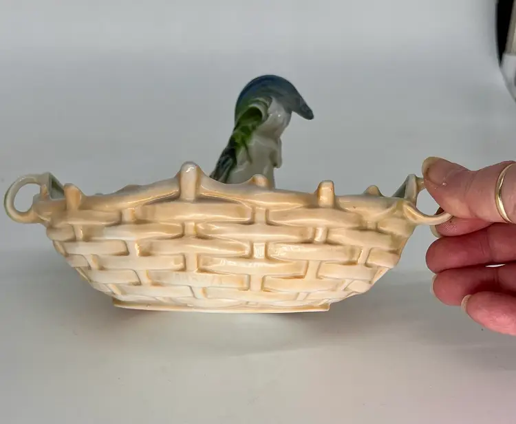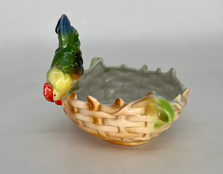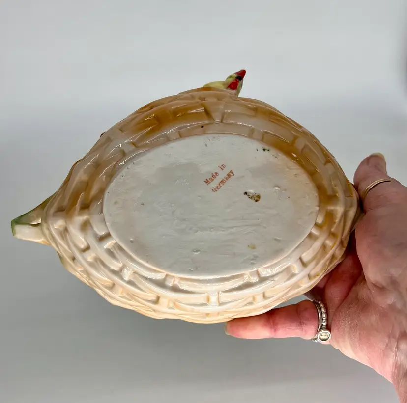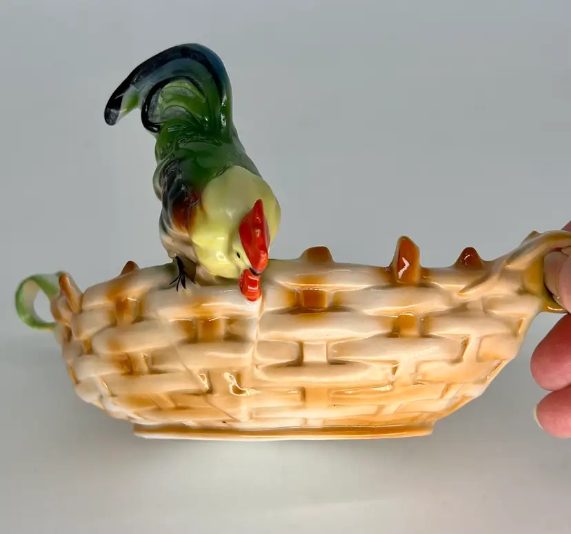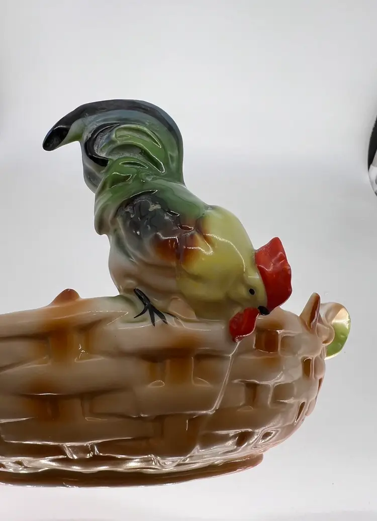 Vintage ceramic rooster perched on the side of a basket. 8”. Made in Germany. Small paint chip