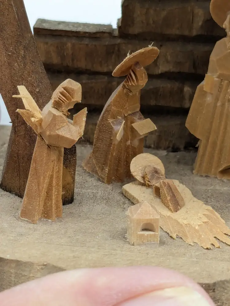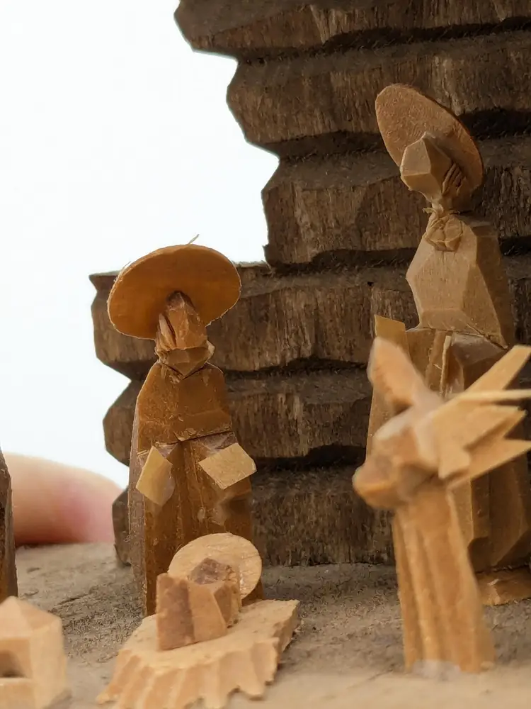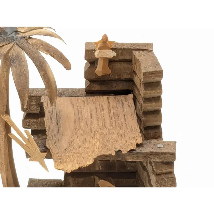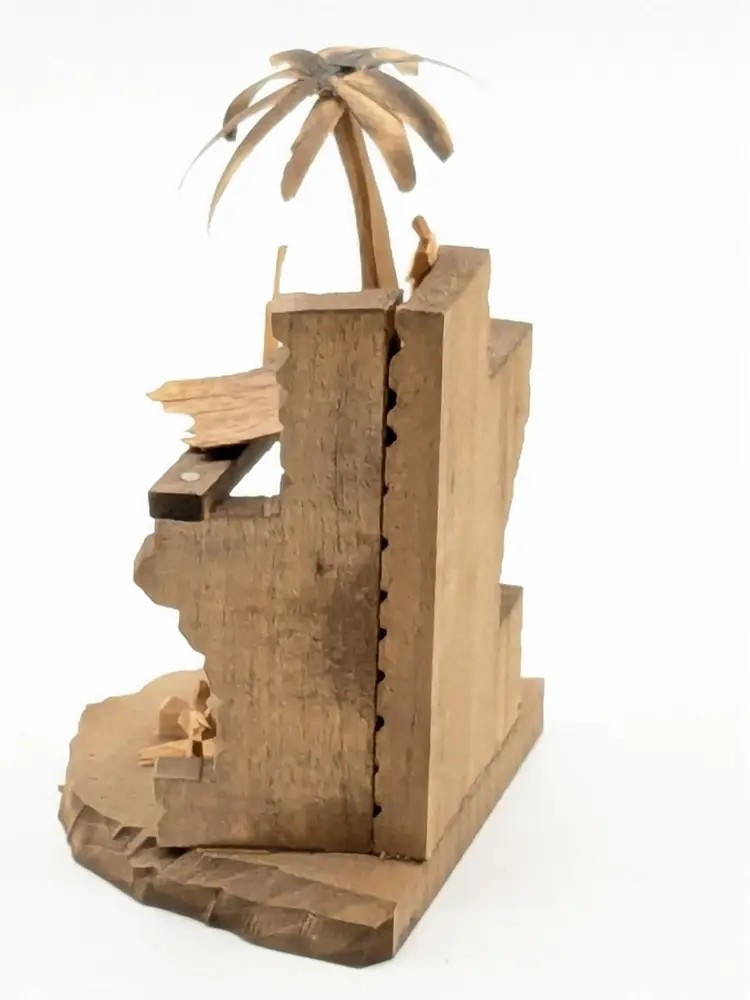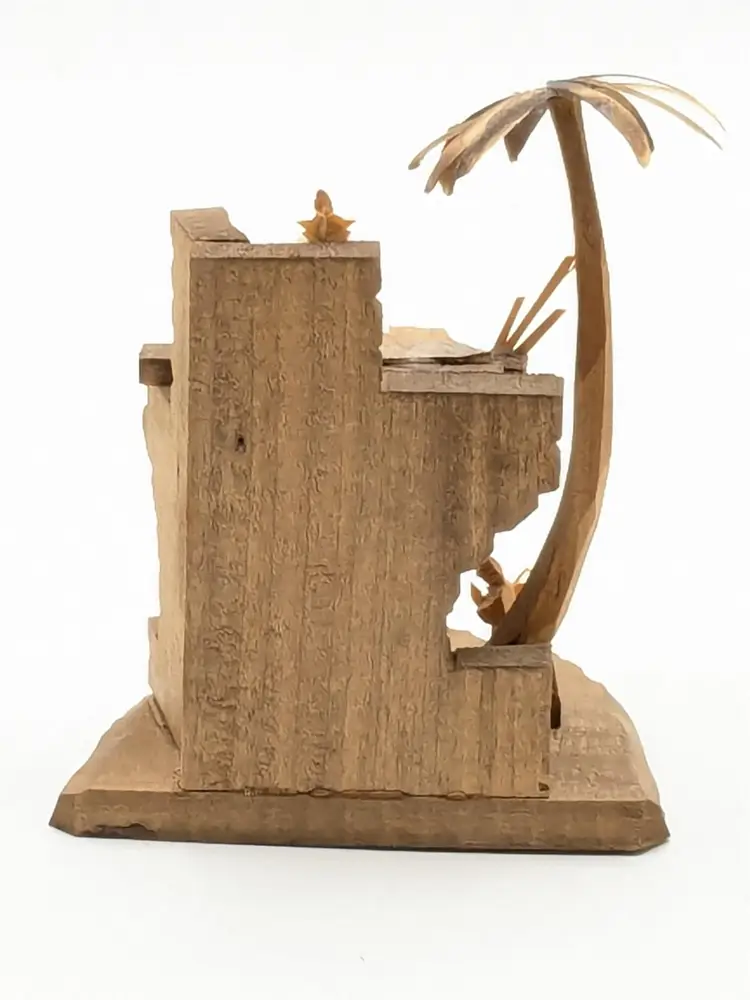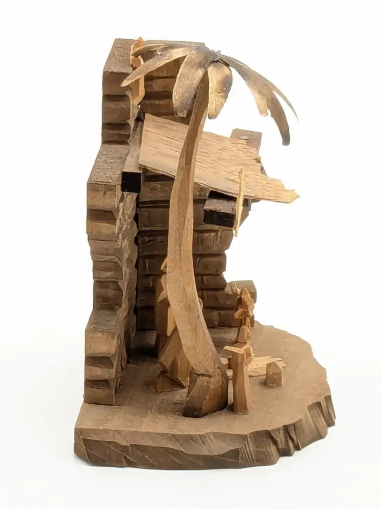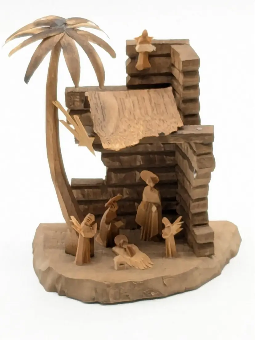Good vintage condition. Beautifully handcrafted wooden nativity scene featuring detailed figures in a rustic stable. Perfect for adding a touch of tradition to your holiday decor. Measures approximately 4 1/2" H x 3 1/2" W. Box is in good condition as well for the age. (ENS)