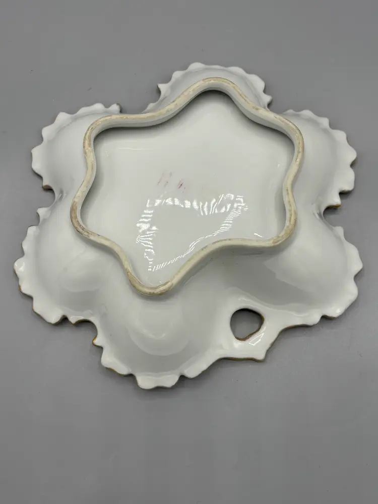 Vintage German pink Rose flowers candy dish with gold ruffle that is very detailed. This lovely dish can be used in many ways. The paint is very vibrant for the age of the piece.