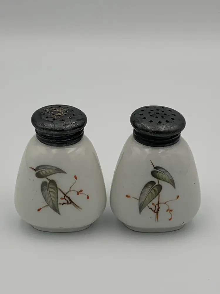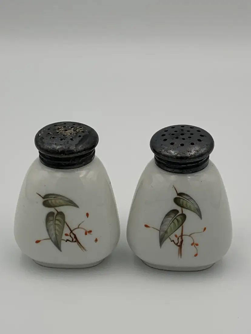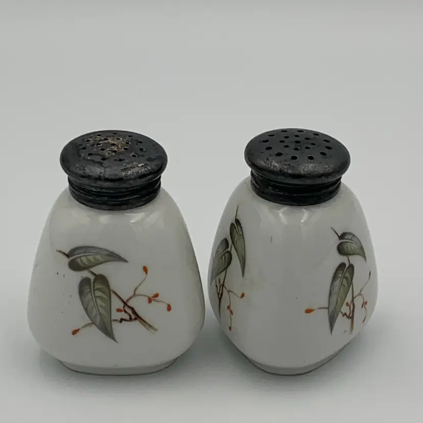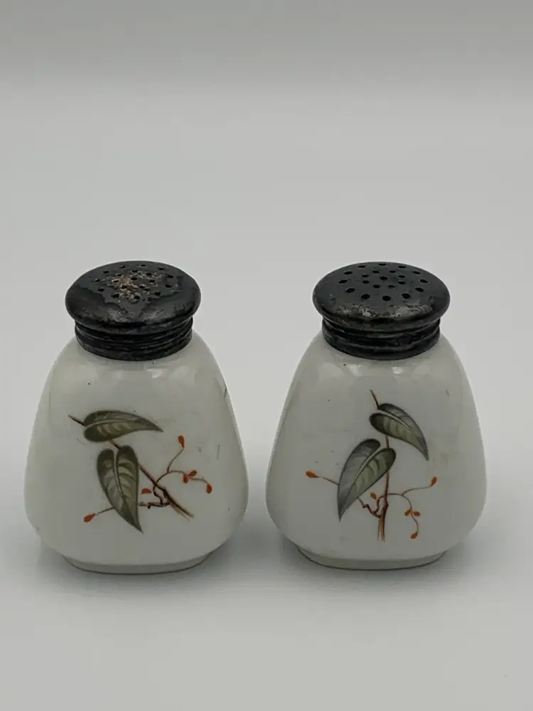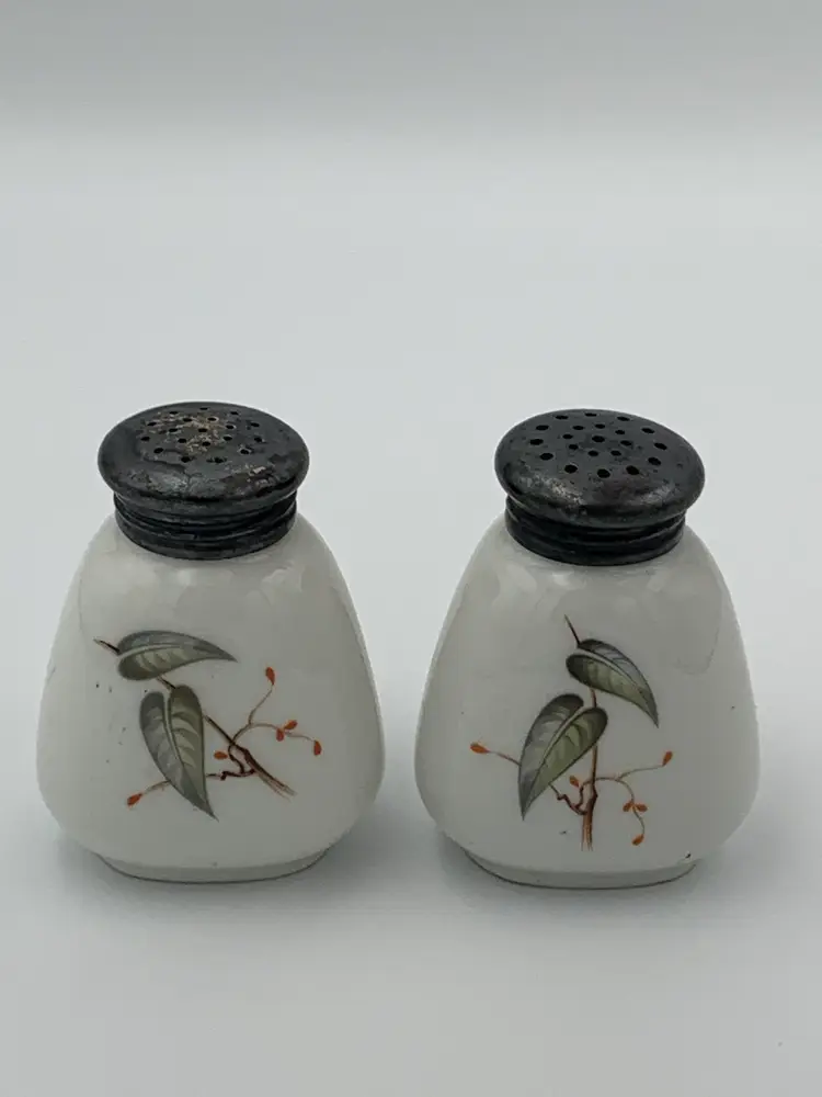 White glass shakers with leaves/floral design. No chips or cracks on shakers, lids do have signs of wear related to age and use.